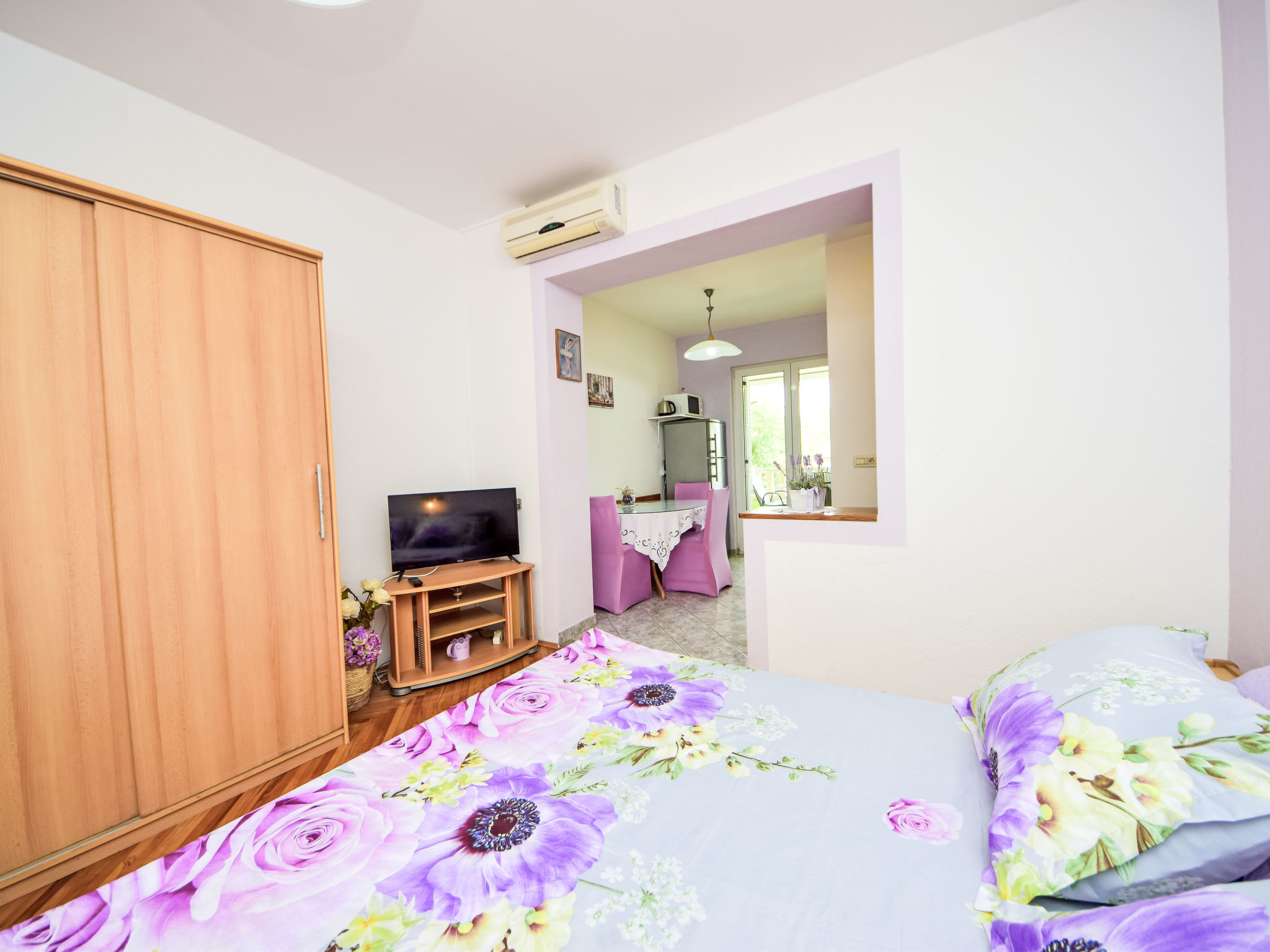 Studio 1-kamer 24 m2 op de 1e verdieping. Studio met 1 bed (90 cm, lengte 200 cm), 1 2-pers bed (160 cm, lengte 200 cm), TV en air-conditioning. Uitgang naar het balkon. Kookhoek (2-pits kookplaat, waterkoker, magnetron, diepvriezer) met eettafel. Douche/WC. Balkon 8 m2. Balkonmeubilair. Ter beschikking: Internet (Internet (WiFi), gratis).