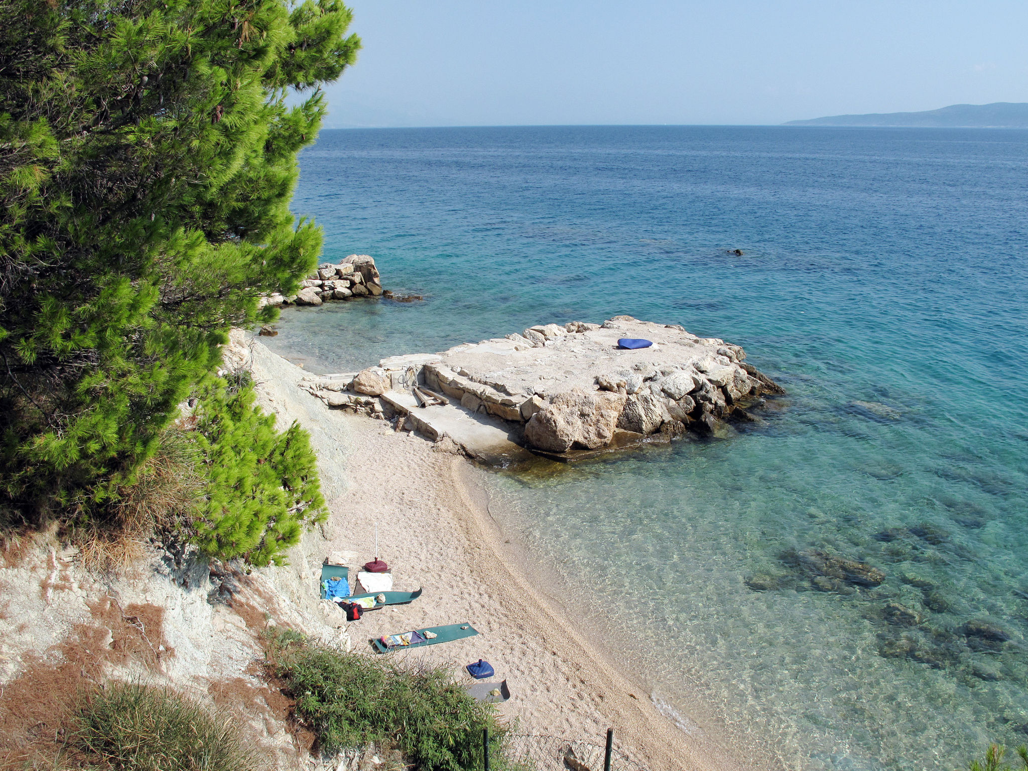 Dit strand bij Omis is niet al te groot, maar onder de bomen vind je beschutting tegen de zon. Er zijn ook douches en kleedhokjes. Helaas weinig schaduw.