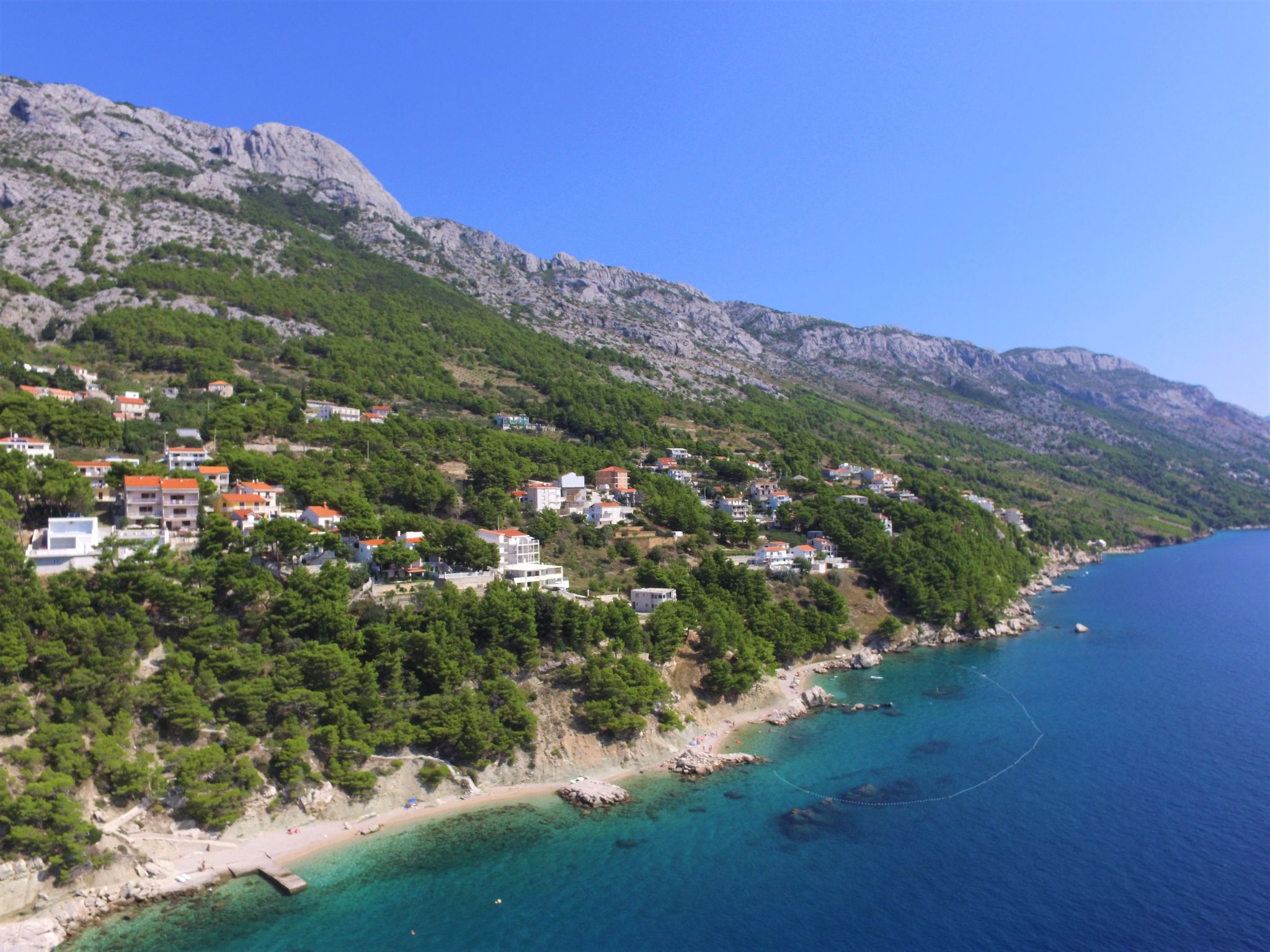 Kindvriendelijke, rustige strand bij Omis. Helder water langs de kust en nog niet overspoeld door toeristen. Een paar meter van de kust wordt het water diep.