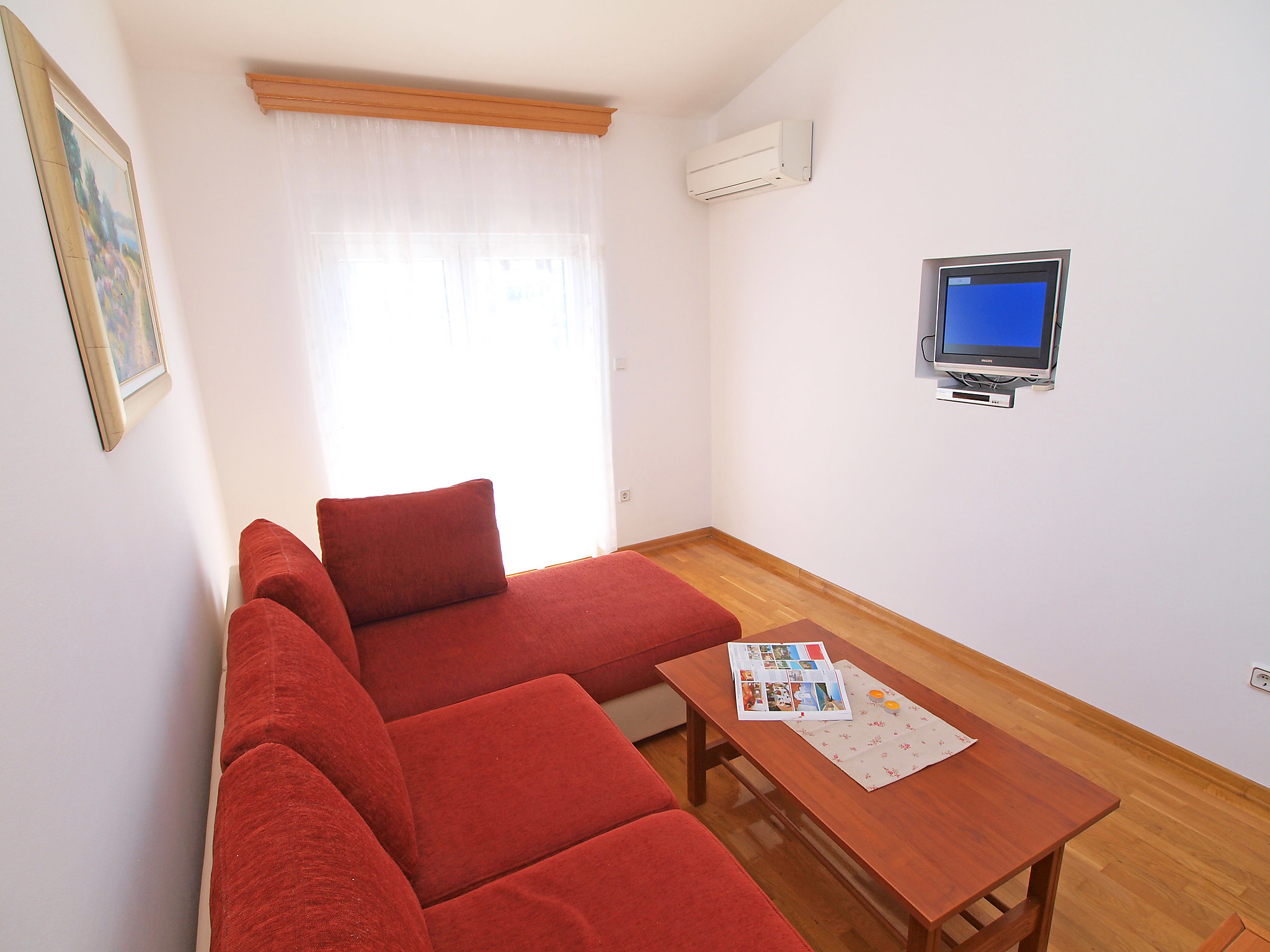 Appartement 1-kamer 29 m2 op de 1e verdieping, op het oosten gelegen. Woon-/eetkamer met 1 2-pers divanbed (150 cm, lengte 200 cm), Sat-TV (Flatscreen TV), air-conditioning. Uitgang naar het terras. Open keuken (4-pits kookplaat, oven, magnetron, diepvriezer, elektrische koffiemachine). Uitgang naar het balkon. Douche/WC. Air-conditioning (extra). Geen verwarmingsmogelijkheid. Balkon 4 m2, terras 6 m2. Terrasmeubelen. Ter beschikking: haardroger. Internet (Internet (WiFi), gratis).