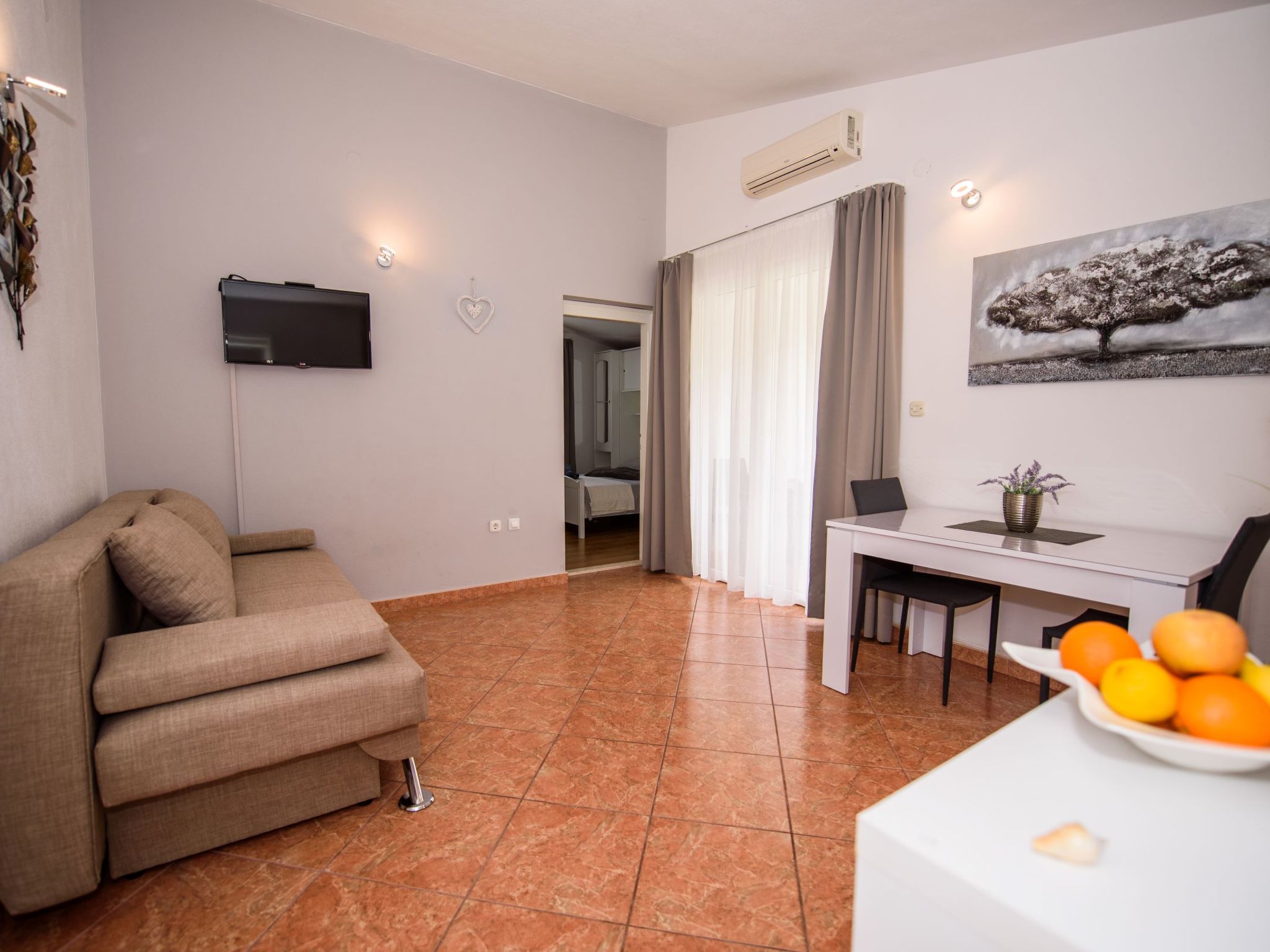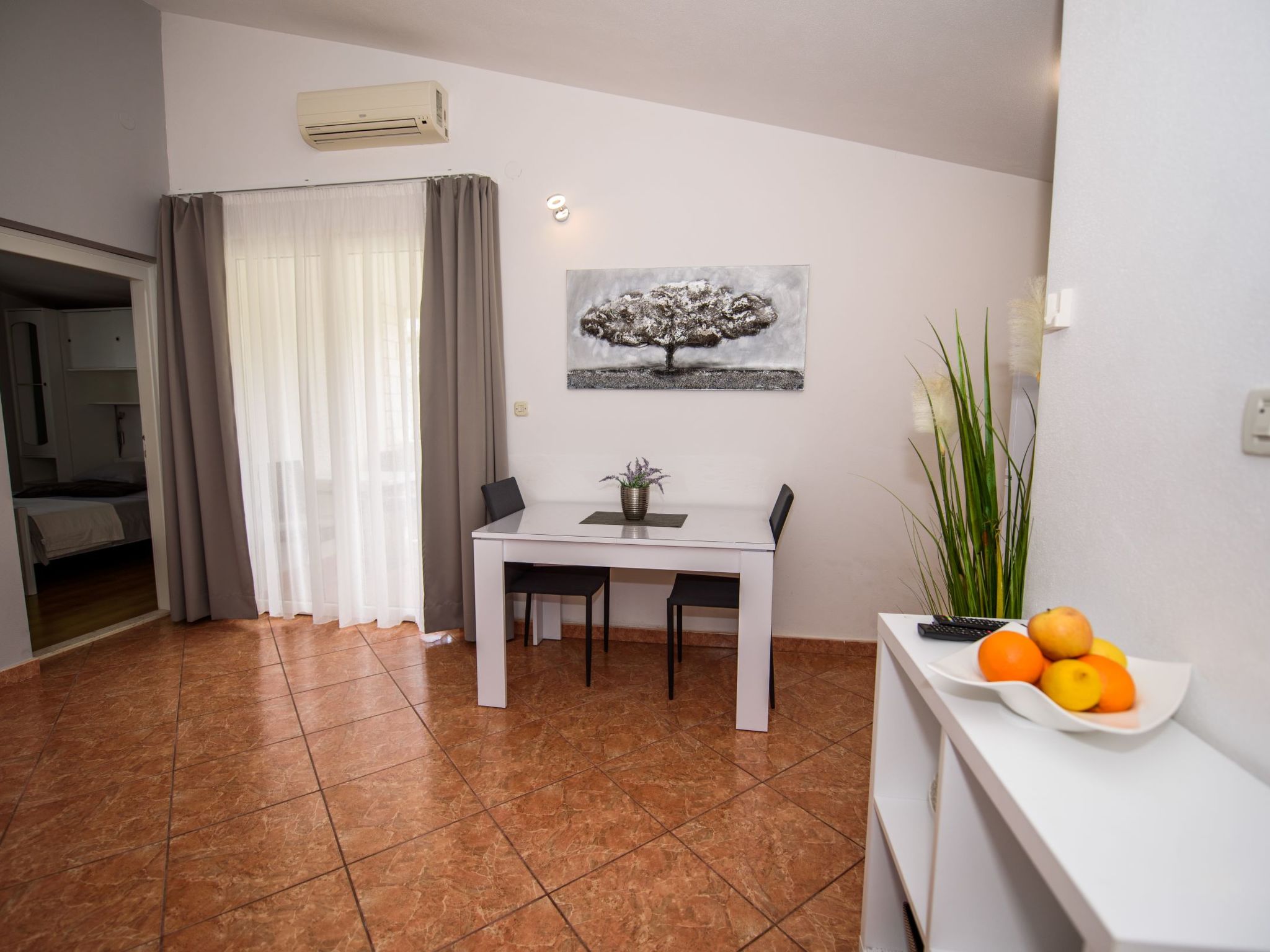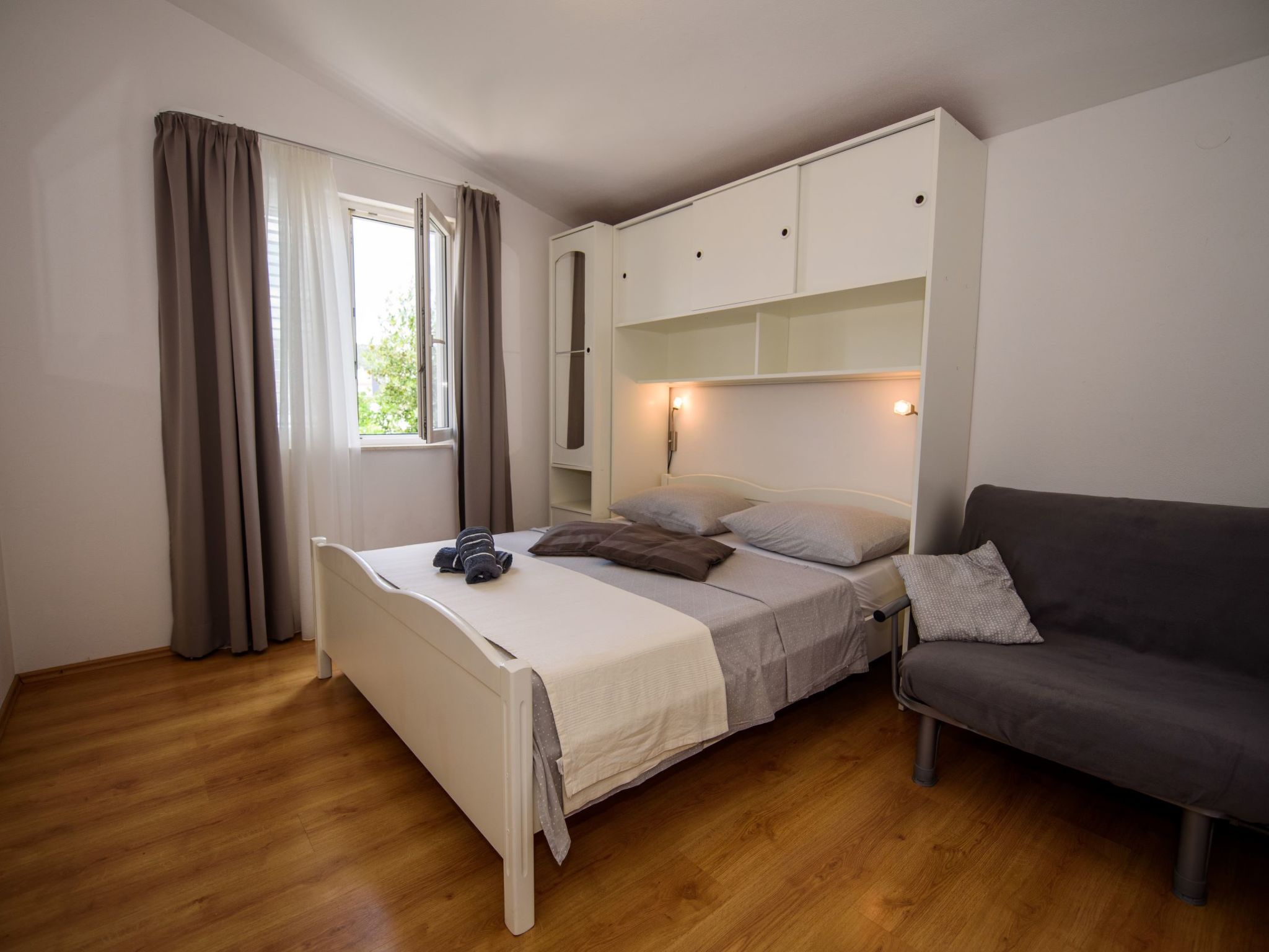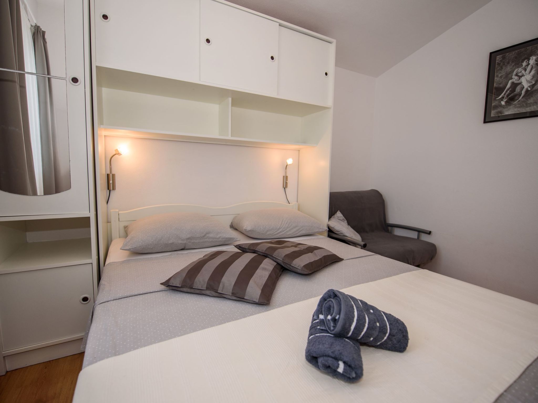 Appartement 2-kamers 32 m2 op de 2e verdieping. Mooi en smaakvol ingericht: woon-/eetkamer met 1 2-pers divanbed (160 cm, lengte 200 cm), Sat-TV (Flatscreen TV), air-conditioning. Uitgang naar het balkon. 1 kamer met 1 2-pers bed (160 cm, lengte 200 cm). Open keuken (2 keramische glas kookplaten, magnetron, diepvriezer, elektrische koffiemachine). Douche/WC. Air-conditioning (extra). Balkon 6 m2. Terrasmeubelen. Ter beschikking: Internet (WiFi).