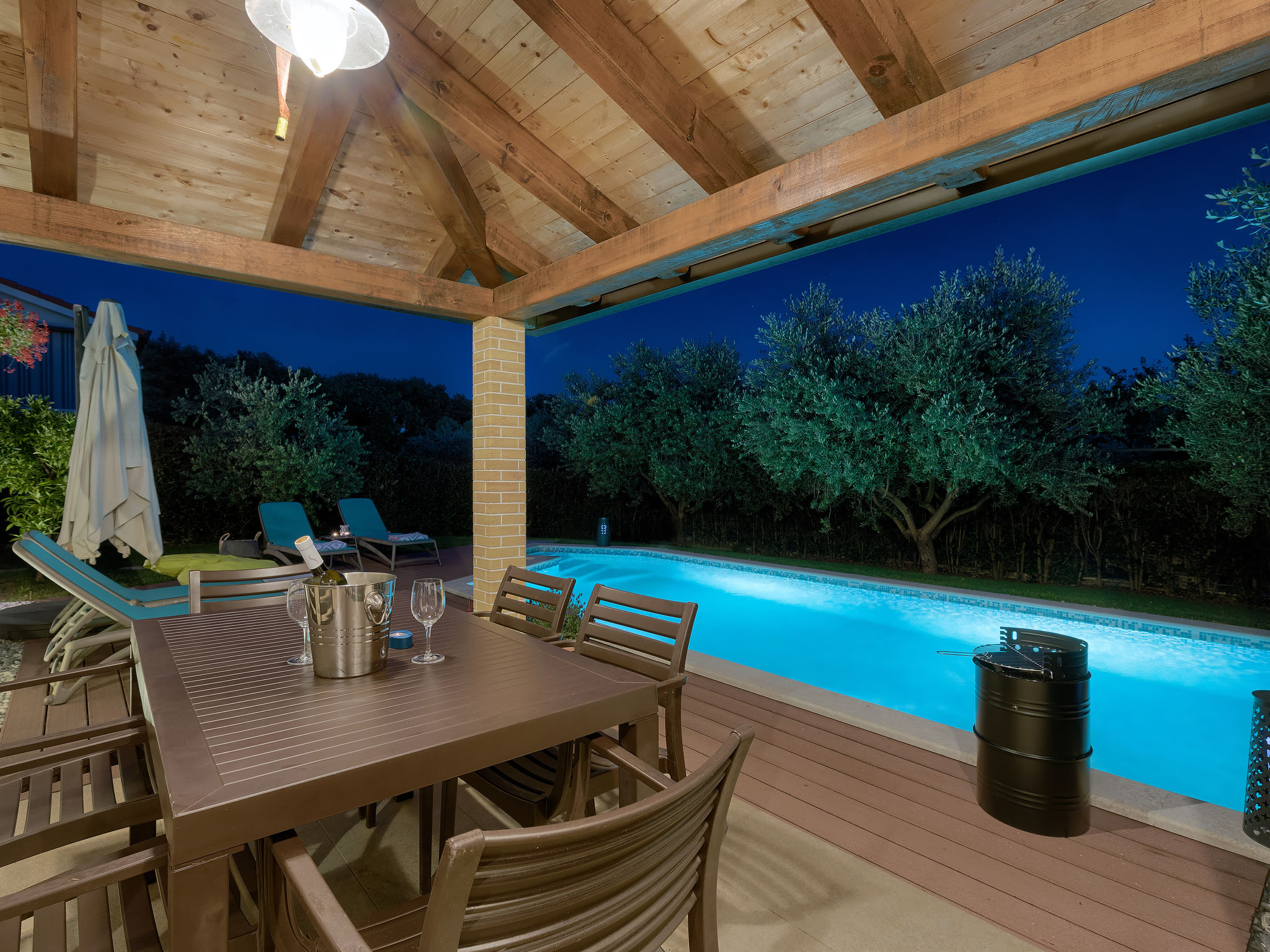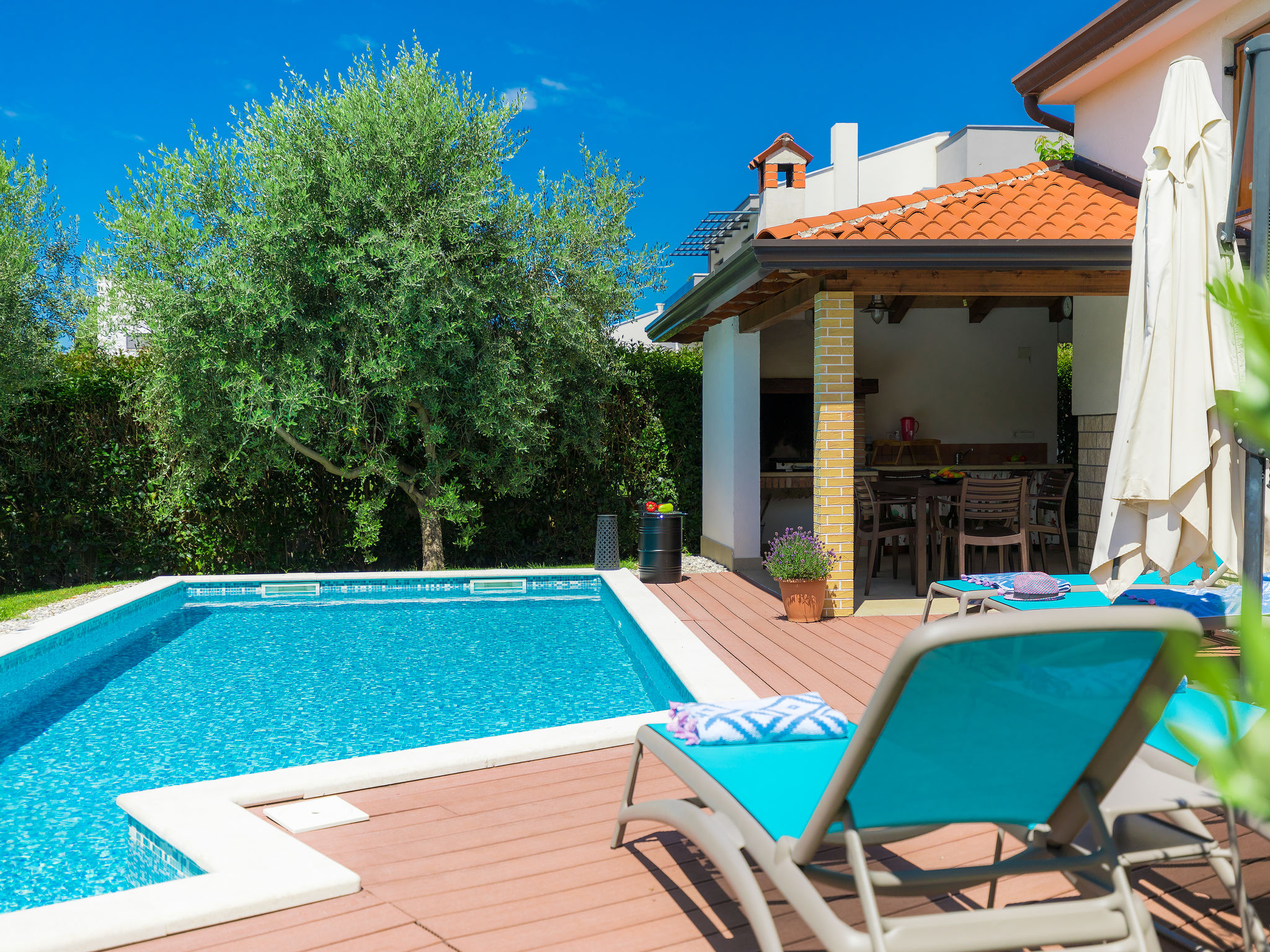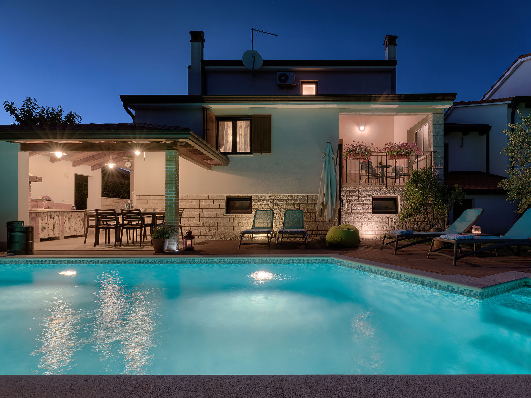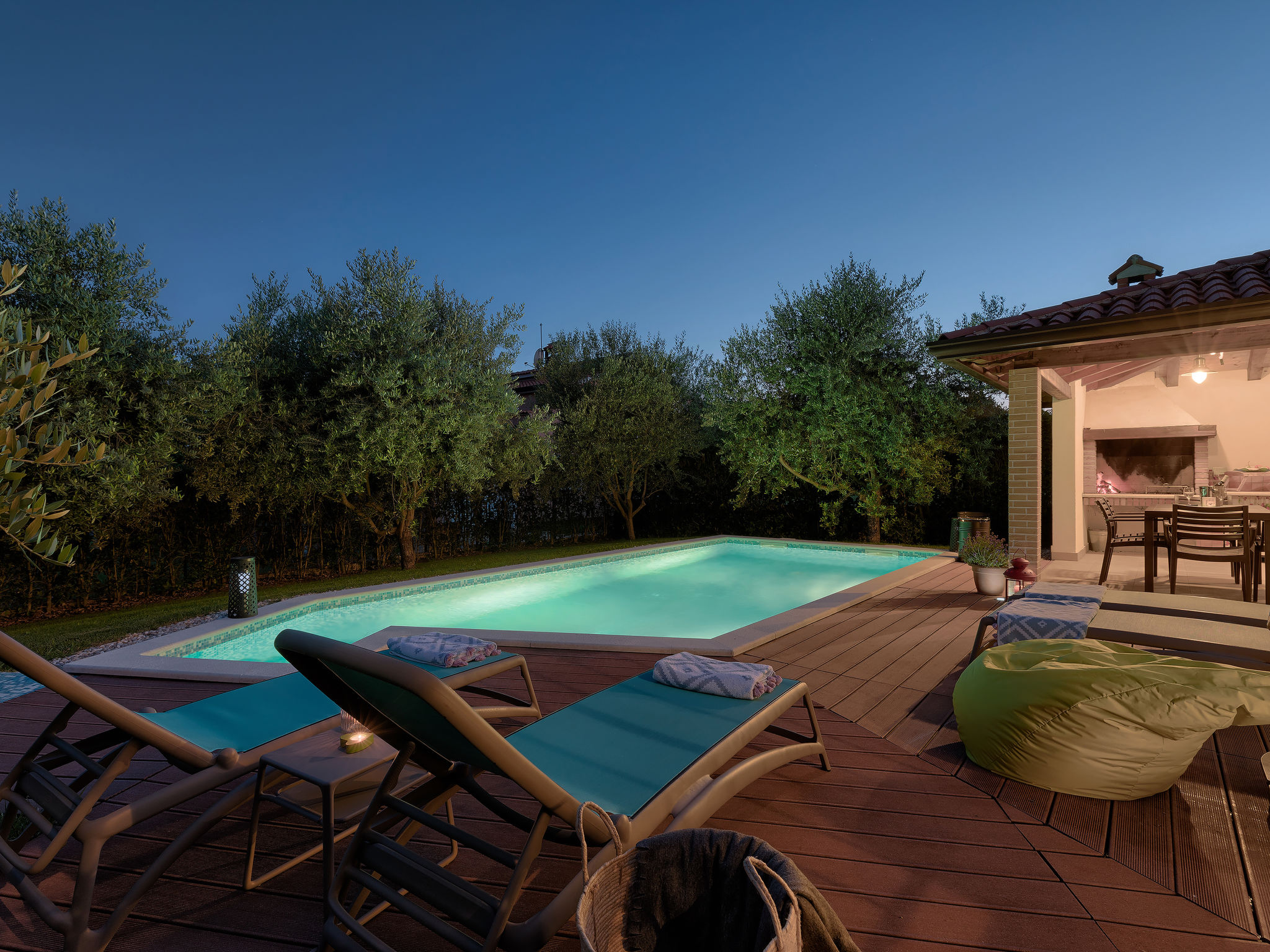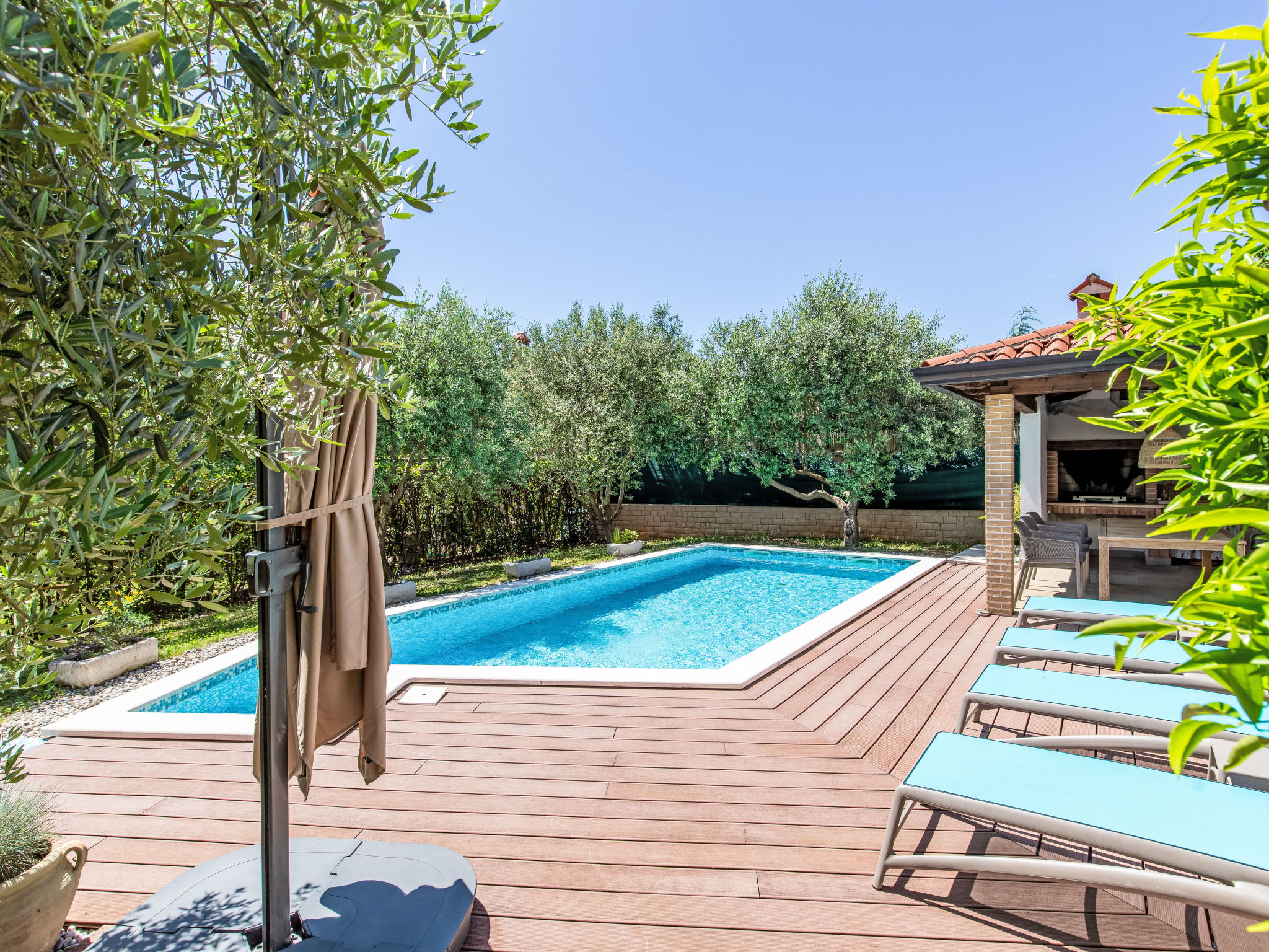 Mooi zwembad met zicht op zee in Novigrad. Er is een zwembad met zeewater en de bar biedt eten en drinken. Het eenvoudige podium biedt overdag diverse activiteiten en een programma, 's avonds optredens van diverse bands.