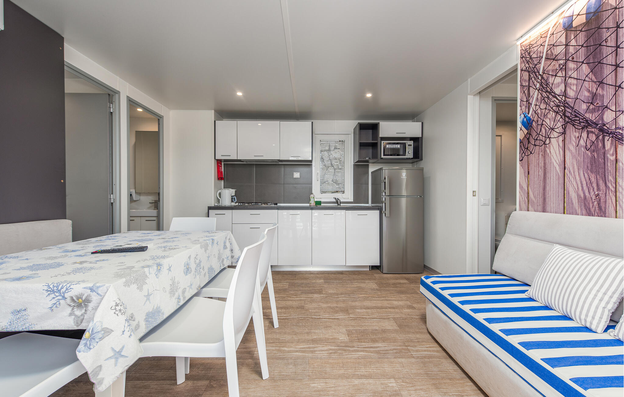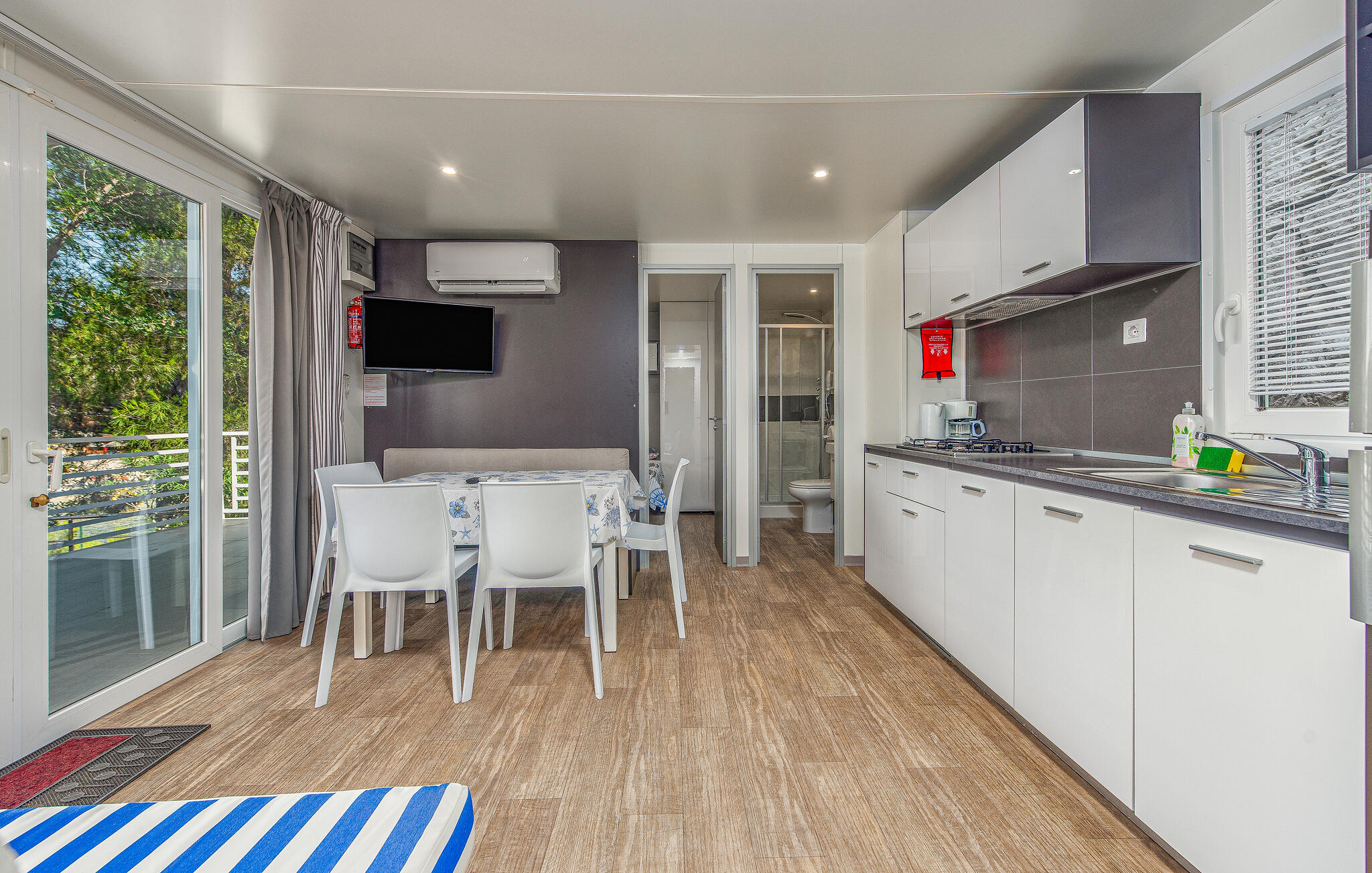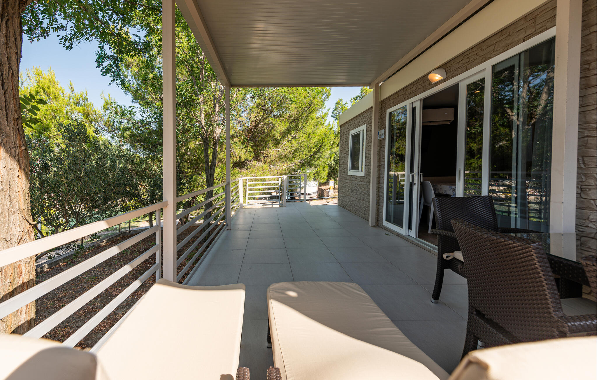 Indeling: Slaapkamer(1x 2-persoonsbed(den)), Slaapkamer(2x 1-persoonsbed(den)), Woonkamer met open keuken(2x Opklapbed(den) of matras(sen)), Badkamer(Toilet: warm en koud water, Douche), Badkamer(Toilet: warm en koud water, Douche), Terras of vergelijkbaar(Overdekt terras)