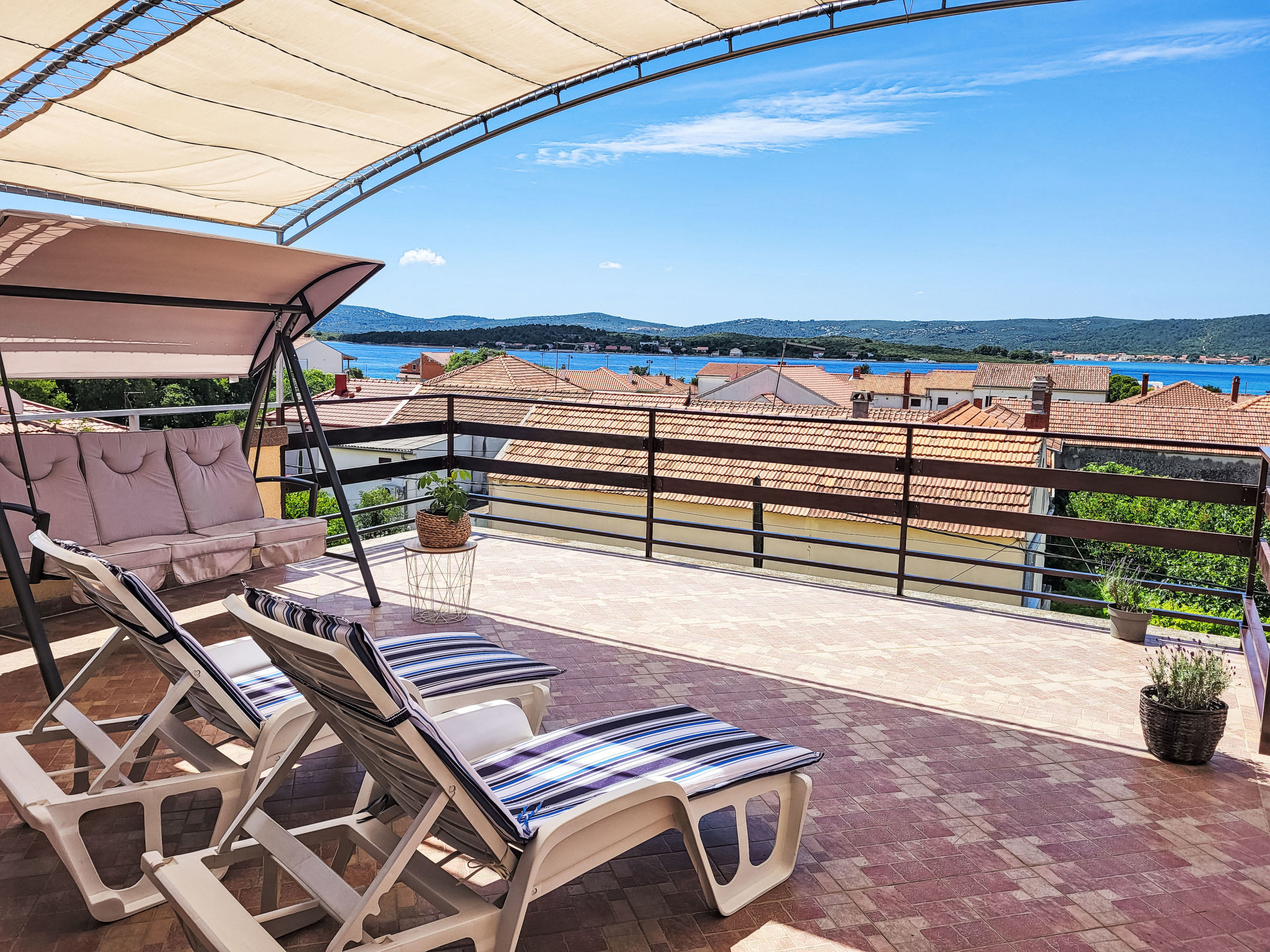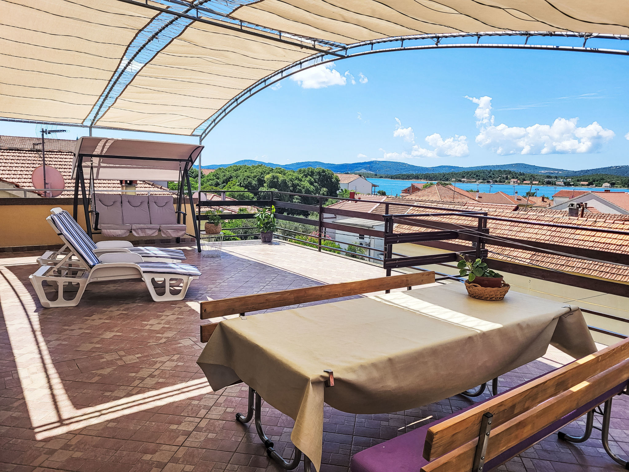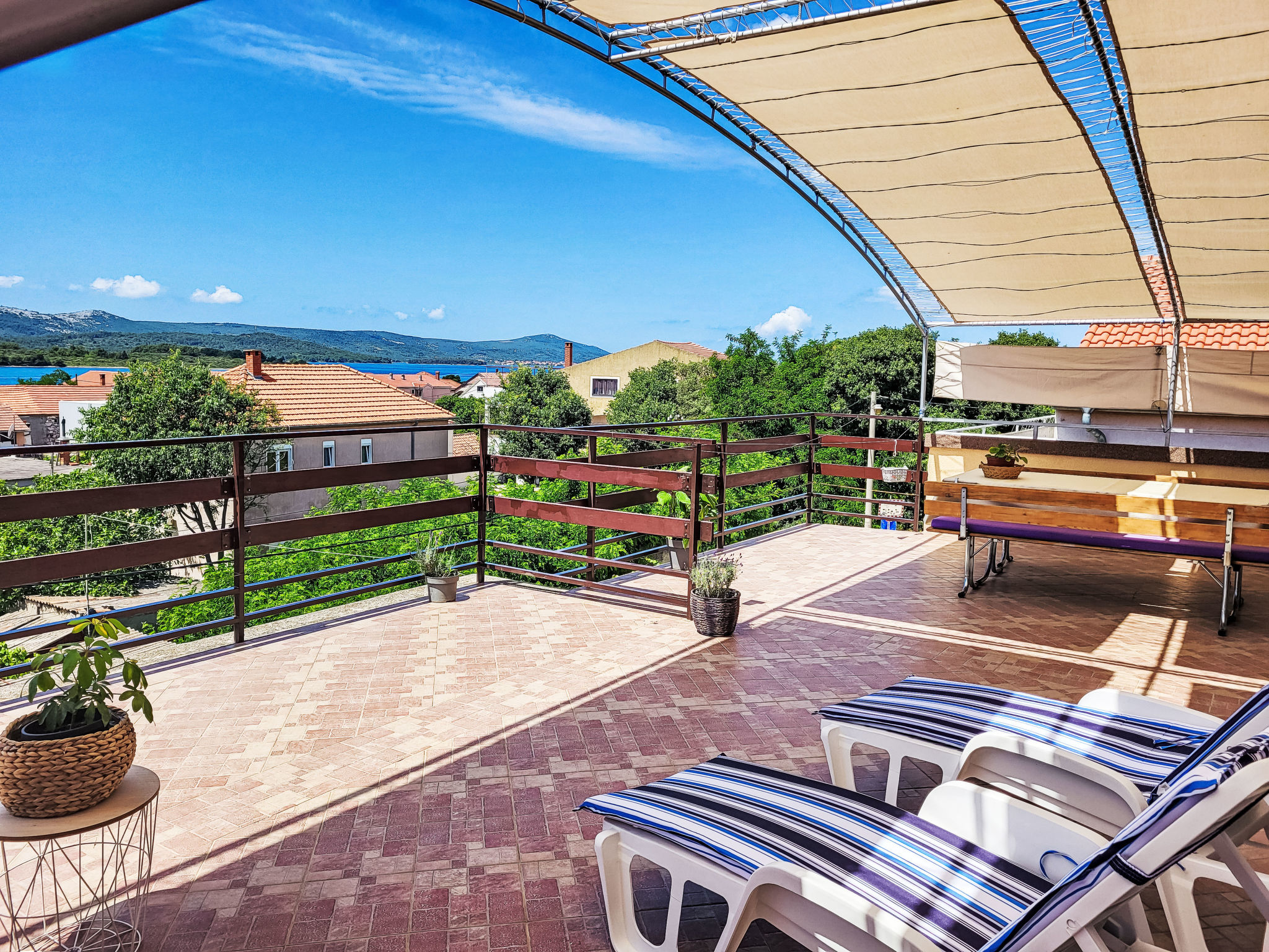 "Ana", appartement 3-kamers 55 m2 op de 2e verdieping. Woon-/eetkamer met 1 divanbed, Sat-TV en air-conditioning. Uitgang naar het terras. 1 kamer met 2 bedden (90 cm, lengte 200 cm). 1 kamer met 1 2-pers bed (2 x 80 cm, lengte 200 cm). Uitgang naar het terras. Met afgeschuinde daken, open keuken (oven, 4 keramische glas kookplaten, broodrooster, waterkoker, magnetron, diepvriezer, elektrische koffiemachine) met eettafel. Douche/WC. Geen verwarmingsmogelijkheid. Terras 50 m2 gedeeltelijk overdekt. Terrasmeubelen, ligstoelen. Uitzicht op zee. Ter beschikking: wasmachine. Internet (Internet (WiFi), gratis). Parkeerplaats (1 Auto) bij het huis. Niet rokers woning.