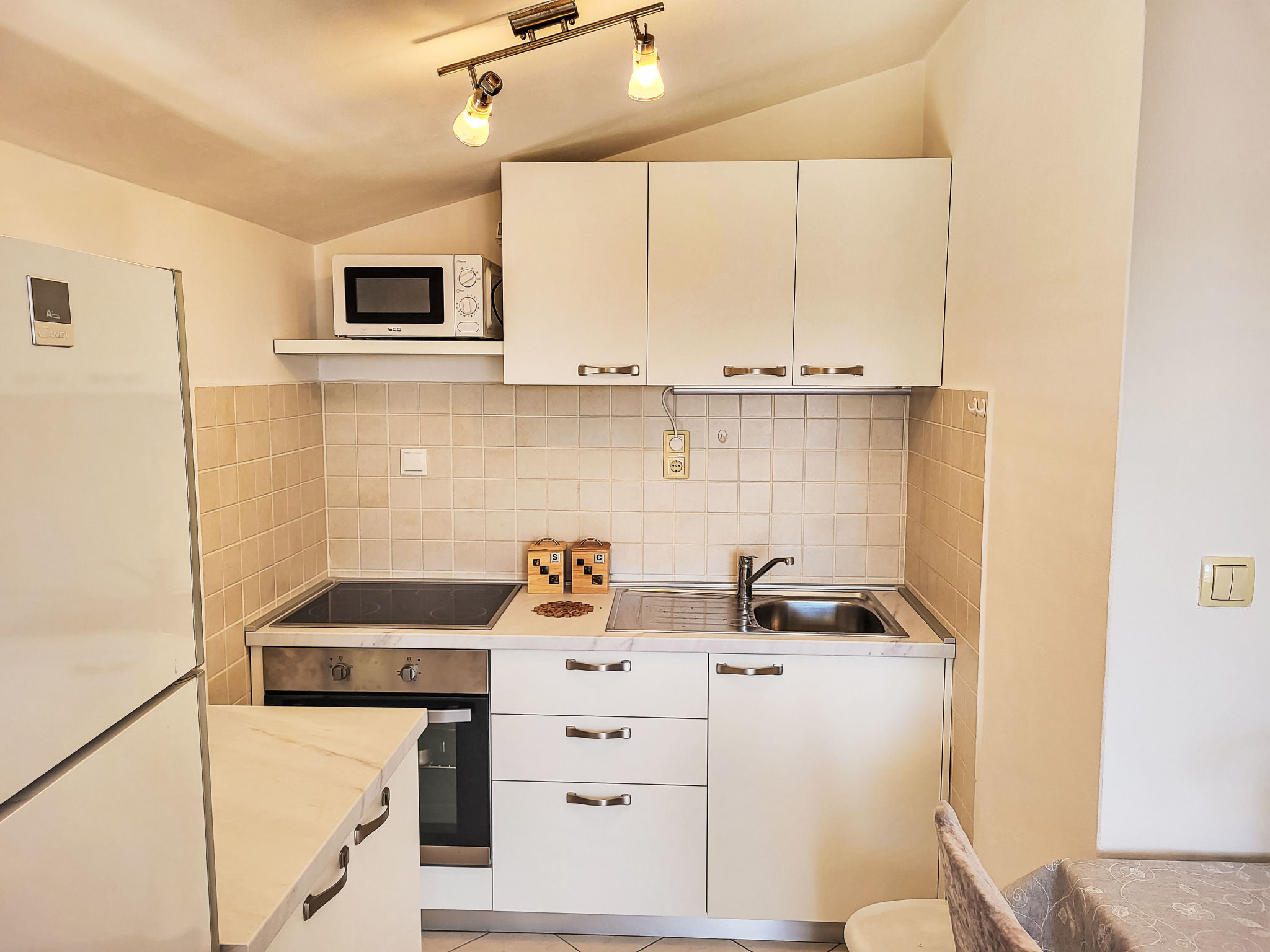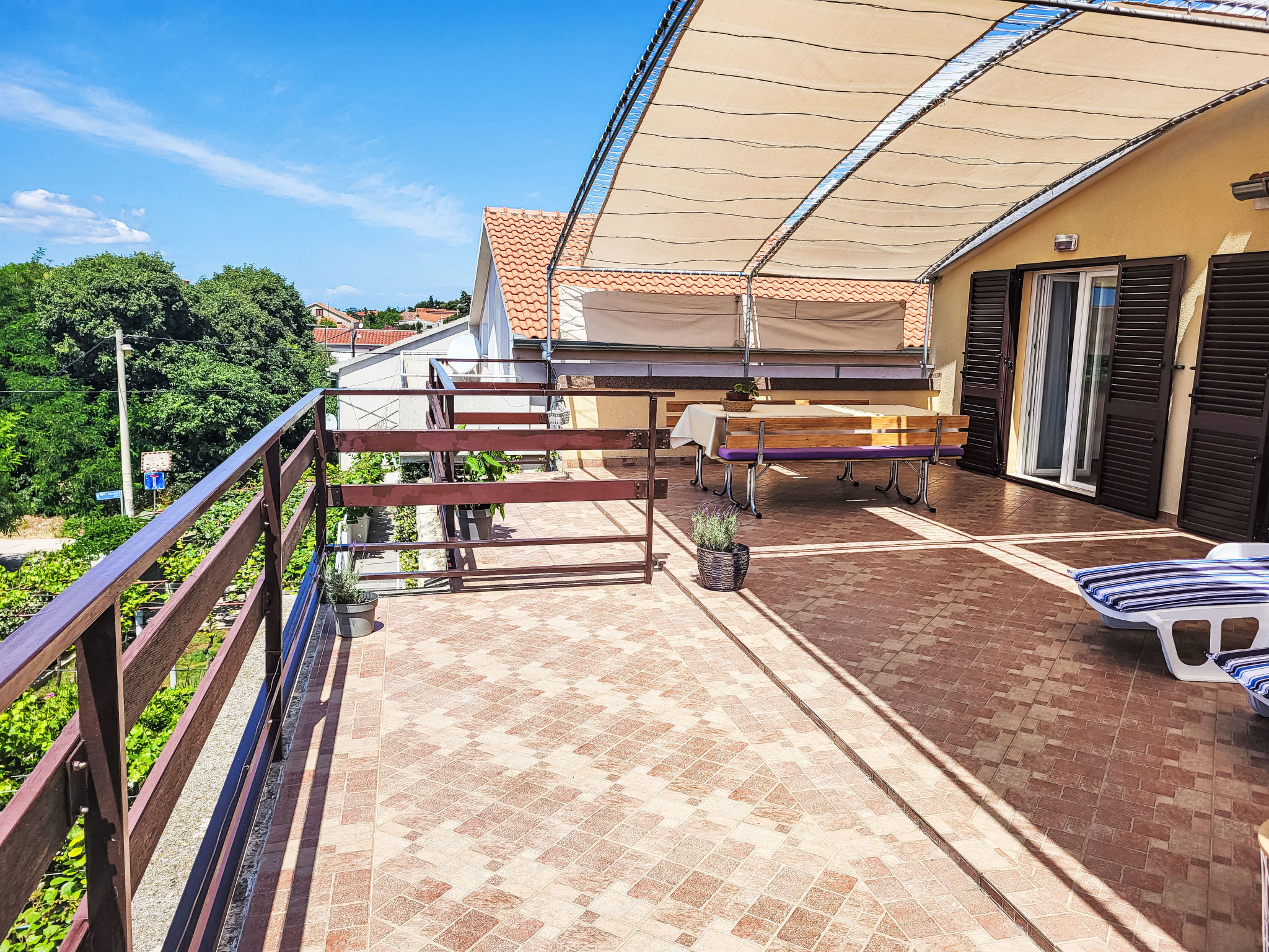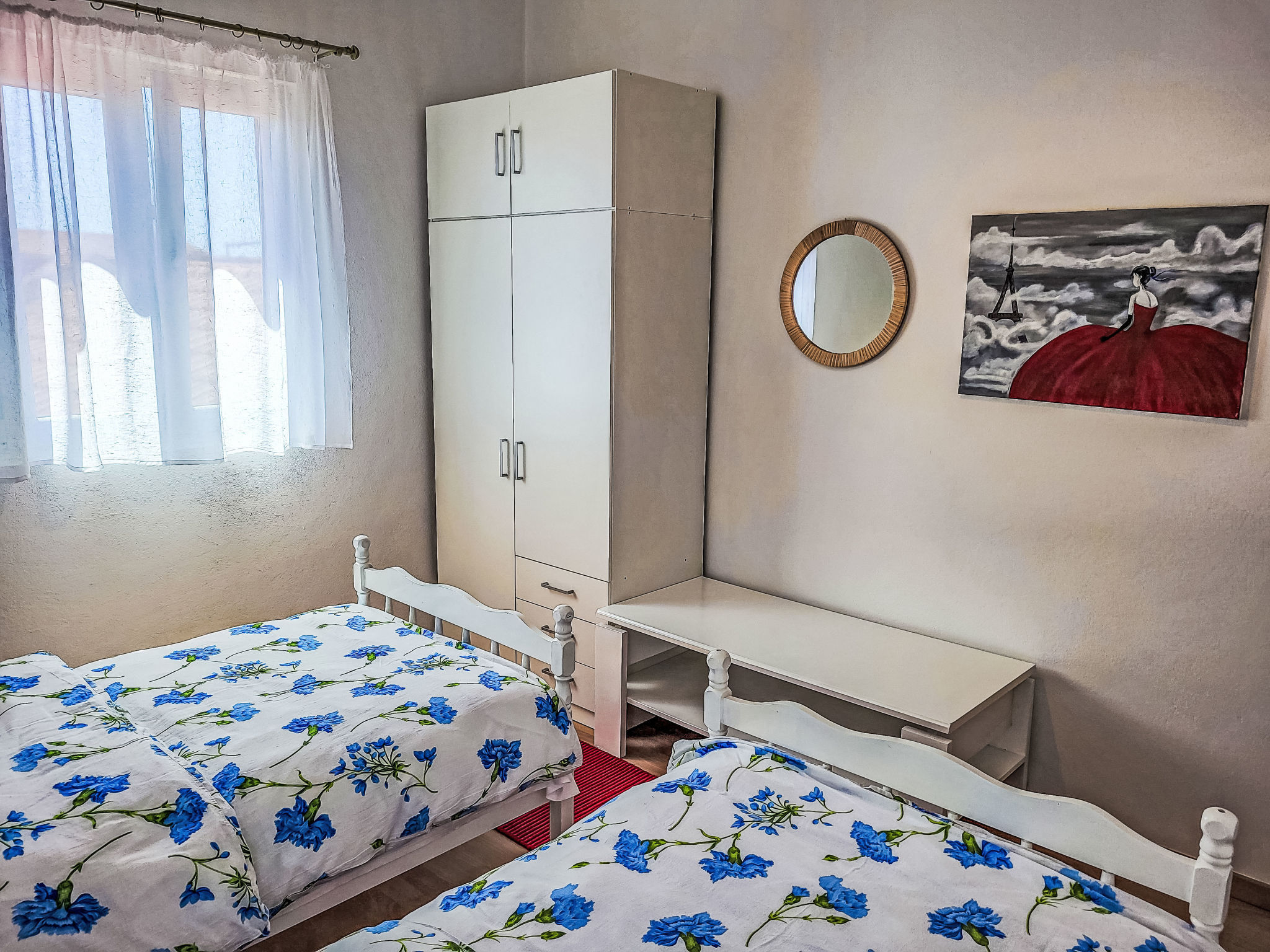 "Ana", appartement 3-kamers 55 m2 op de 2e verdieping. Woon-/eetkamer met 1 divanbed, Sat-TV en air-conditioning. Uitgang naar het terras. 1 kamer met 2 bedden (90 cm, lengte 200 cm). 1 kamer met 1 2-pers bed (2 x 80 cm, lengte 200 cm). Uitgang naar het terras. Met afgeschuinde daken, open keuken (oven, 4 keramische glas kookplaten, broodrooster, waterkoker, magnetron, diepvriezer, elektrische koffiemachine) met eettafel. Douche/WC. Geen verwarmingsmogelijkheid. Terras 50 m2 gedeeltelijk overdekt. Terrasmeubelen, ligstoelen. Uitzicht op zee. Ter beschikking: wasmachine. Internet (Internet (WiFi), gratis). Parkeerplaats (1 Auto) bij het huis. Niet rokers woning.