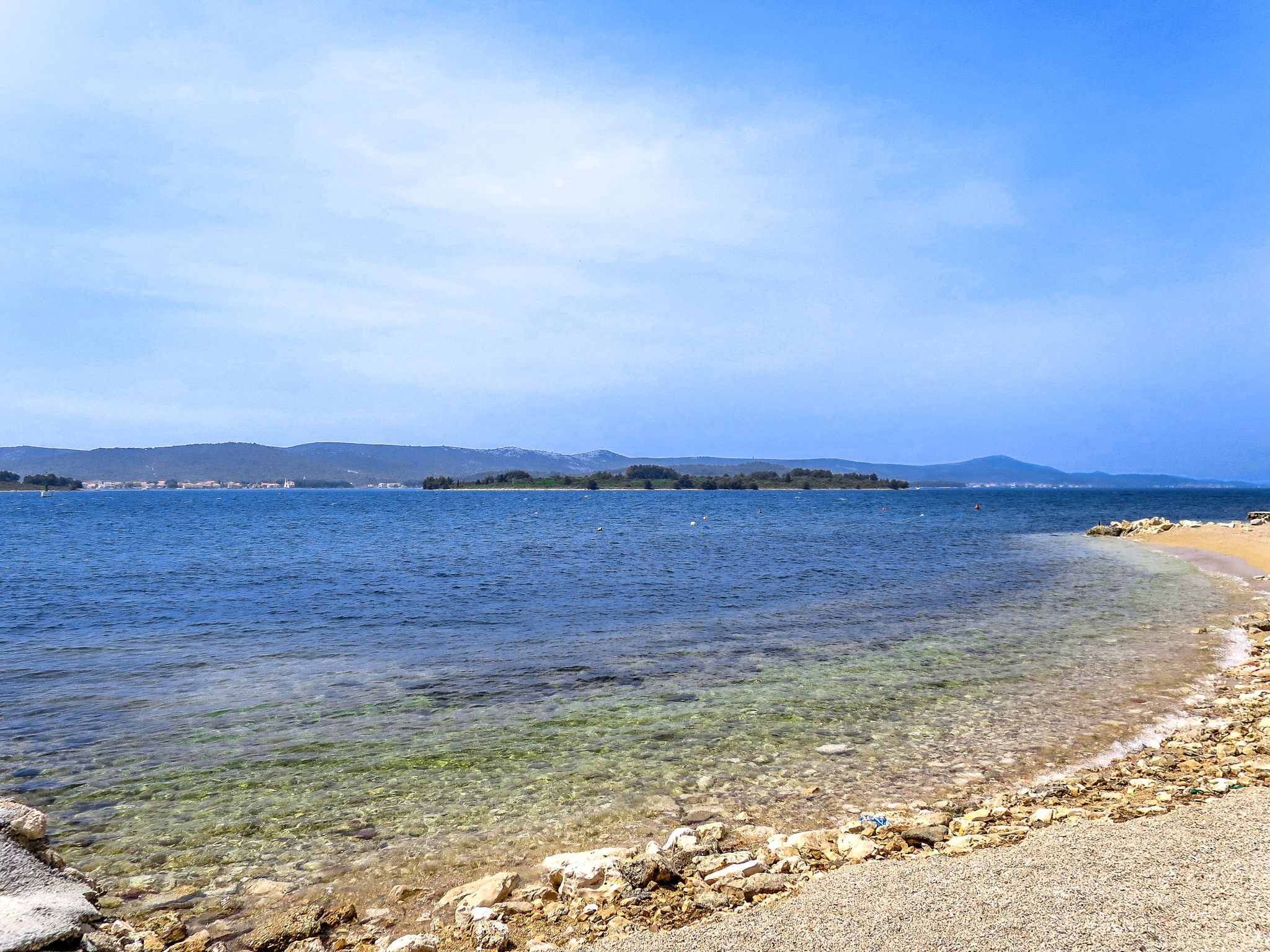 Zeer mooi strand met zand en kiezels. Moeilijke toegang op de weg met grotere en kleinere stenen. Je hebt hier nog echt de ruimte. Rustig en aangenaam strand bij Biograd na Moru.