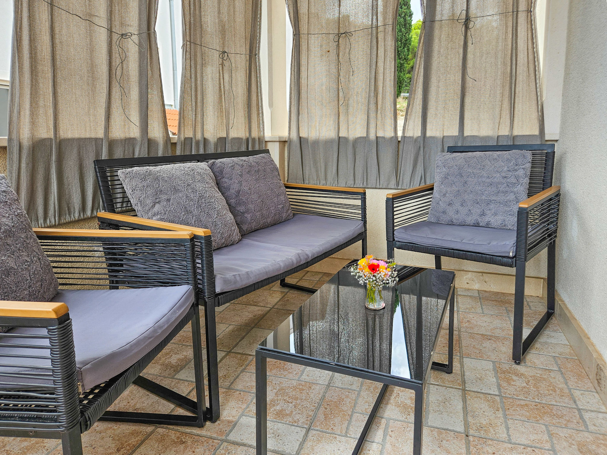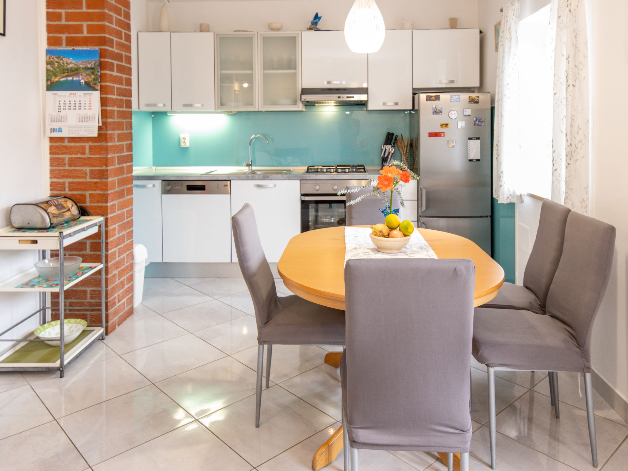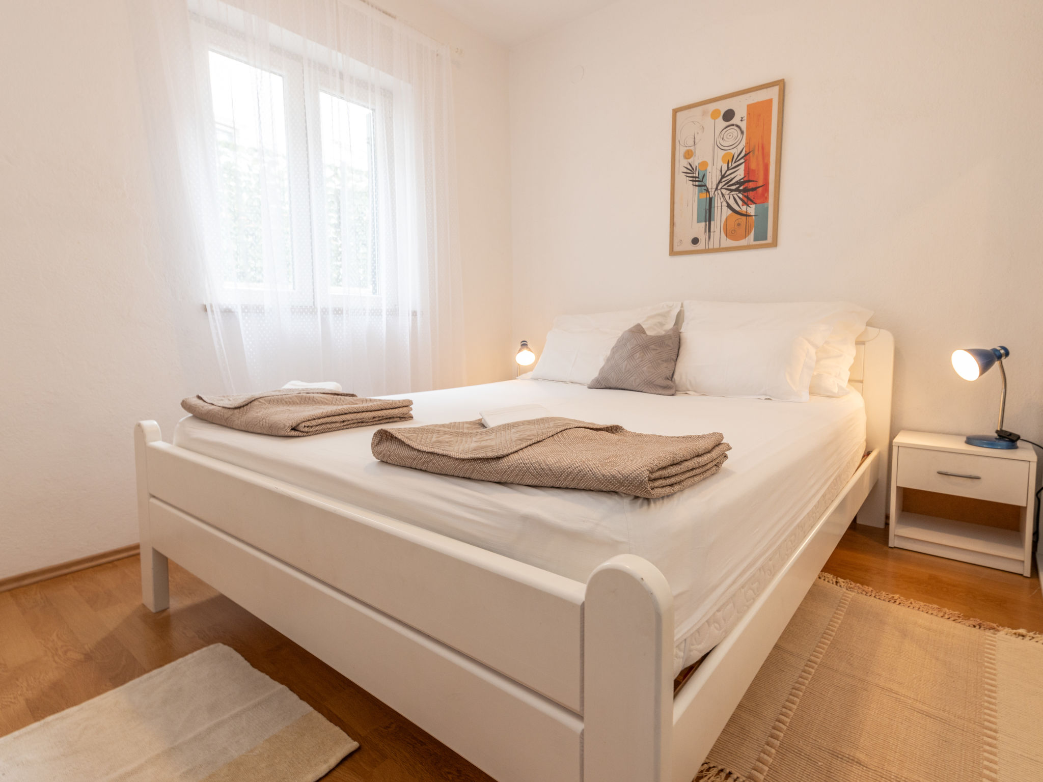 "Ana", halfvrijstaand huis 6-kamers 100 m2 op 2 verdiepingen. Woon-/eetkamer met 1 divanbed, Sat-TV en air-conditioning. 1 kamer met 1 2-pers bed. 1 kamer met 2 bedden. Open keuken (4-pits kookplaat, oven, afwasmachine, broodrooster, elektrische koffiemachine). Douche/WC. Bovenverdieping: (buitentrap) woon-/eetkamer met 1 divanbed, Sat-TV en air-conditioning. Uitgang naar het balkon. 1 kamer met 1 2-pers bed. 1 kamer met 2 bedden. Open keuken (4-pits kookplaat, oven, broodrooster, elektrische koffiemachine). Douche/WC. Geen verwarmingsmogelijkheid. 2 balkons, terras. Terrasmeubelen, balkonmeubilair. Uitzicht op zee. Ter beschikking: Internet (Internet (WiFi), gratis). Rookvrij huis. De accommodatie bestaat uit 2 appartementen die gehuurd worden als 1 geheel.