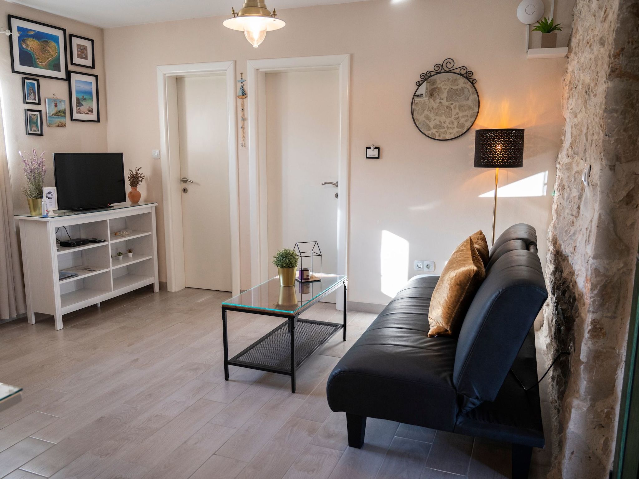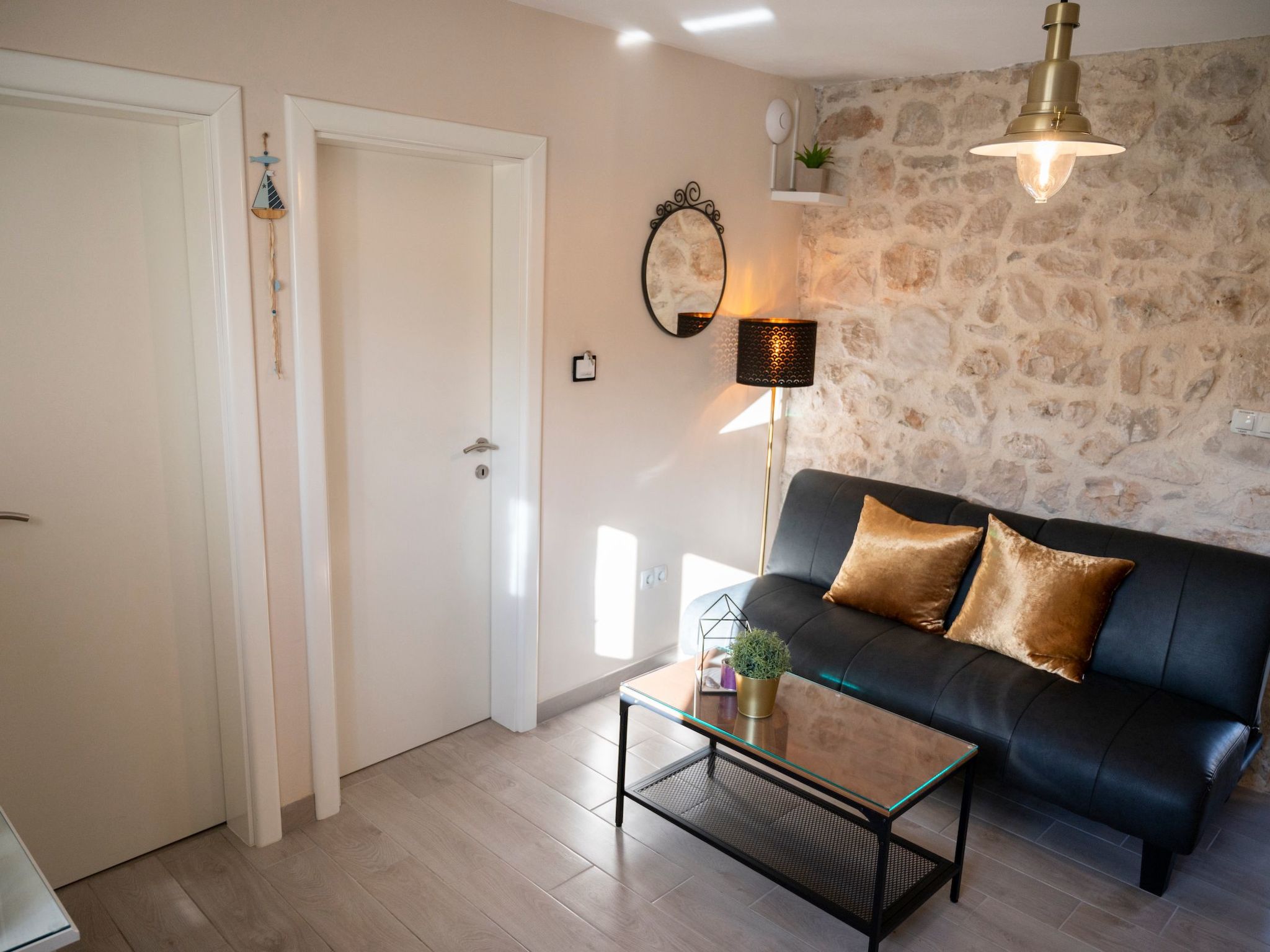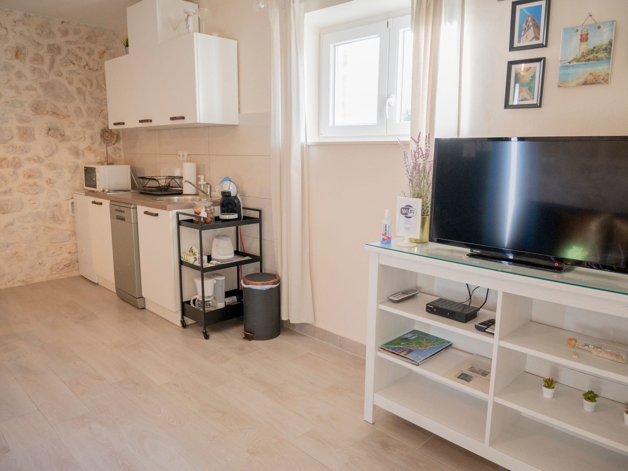Apartment is located in Turanj. The apartment is located at 3 minutes walk from the beach and center of the town. Turanj is a tourist place connected with the centre of Sv. Filip i Jakov by the promenade “Lungo mare”. The shear vicinity of larger centres makes it an attractive place which is close enough, but also far away from the crowd and commotion. Spreading along 4 km of shore, it is located in Pašman Channel and surrounded by a small archipelago of 16 islets.The terrace is equipped with garden furniture. The property is fenced and is therefore suitable for children and people who wants privacy.The ground floor has stone walls and details that emphasize the authenticity of the apartment. The ground floor is about 33 m² in size and comprises of the following rooms: A living room, a flatscreen TV and a sofa bed. There is also a bedroom next to it, which includes a double bed. Plus there is a fully-equipped kitchen with microwave, electric kettle and a dining area, as well as an bathroom with a toilet and shower.The beach is about 200 metres away. The town centre with its restaurants and supermarkets is approximately 200 metres away. First shop is just 50 m away (approximately) from apartment.