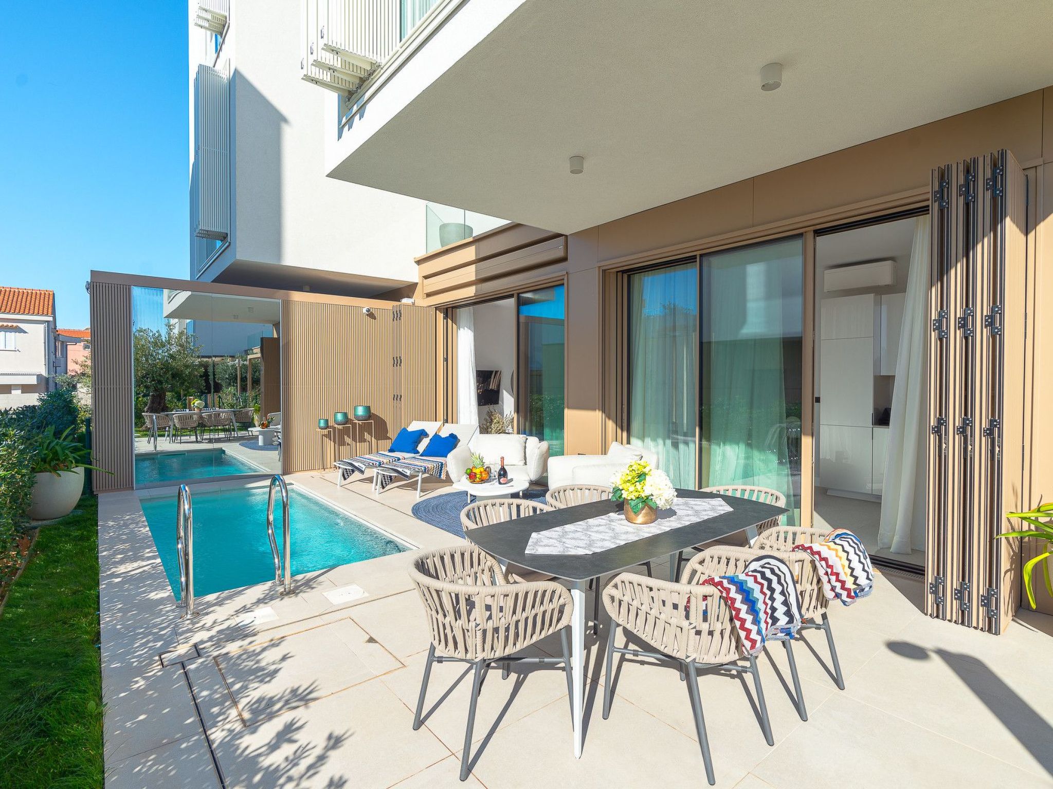 The modern villa Valea stands out with its unique interior designed by award-winning Croatian architect Ante Vrban. It is located within a fully fenced, beautiful residential complex, just a few steps from the beach.The villa extends over 4 floors. The ground floor consists of an entrance, a toilet, a living room with a kitchen and a dining room, and an exit to the terrace with a heated pool, next to which there are sun loungers for relaxation, lounge chairs, and a dining table. Part of the outdoor terrace is surrounded by a beautiful garden adorned with Mediterranean plants and an olive tree over 60 years old.On the first and second floors of the house, four designer bedrooms provide maximum comfort, along with two bathrooms. On the first floor, there is a spacious lounge terrace with a home theater.On the -1 floor, there is a relaxation room with a wine fridge, a kitchen with a bar, and a bar for all wine lovers.Located in Turanj, Villa Valea is a great starting point for exploring three national parks: Krka, Paklenica, and Kornati, as well as the Vrana Lake Nature Park. Nearby are three larger cities with a rich tourist offer: Zadar, Šibenik, and Nin, as well as numerous charming Dalmatian towns worth visiting.maintained garden, providing a lush, tranquil space to relax and rejuvenate. The highlight, however, is the terrace, an ideal spot for alfresco dining, soaking up the mild Dalmatian climate, or simply enjoying moments of quiet reflection.The house's location in Turanj, a charming town in Dalmatia, offers more than just its proximal beach. A stroll or a short drive away, guests can explore the nearest town center, located about 1200 meters away, offering a glimpse into the local lifestyle and culture. For convenience, a grocery store is available within 1300 meters, making it easy to stock up on essentials or ingredients for a home-cooked meal.This holiday house in Turanj is more than just a place to stay; it's a gateway to a calming, fulfilling holiday experience. With its thoughtful amenities, inviting outdoor spaces, and unbeatable location close to the beach and local attractions, it promises a holiday that's as relaxing or as adventurous as you wish it to be. Whether you're looking to unwind in the serenity of your private garden or explore the wonders of Dalmatia, this property is your perfect base.
