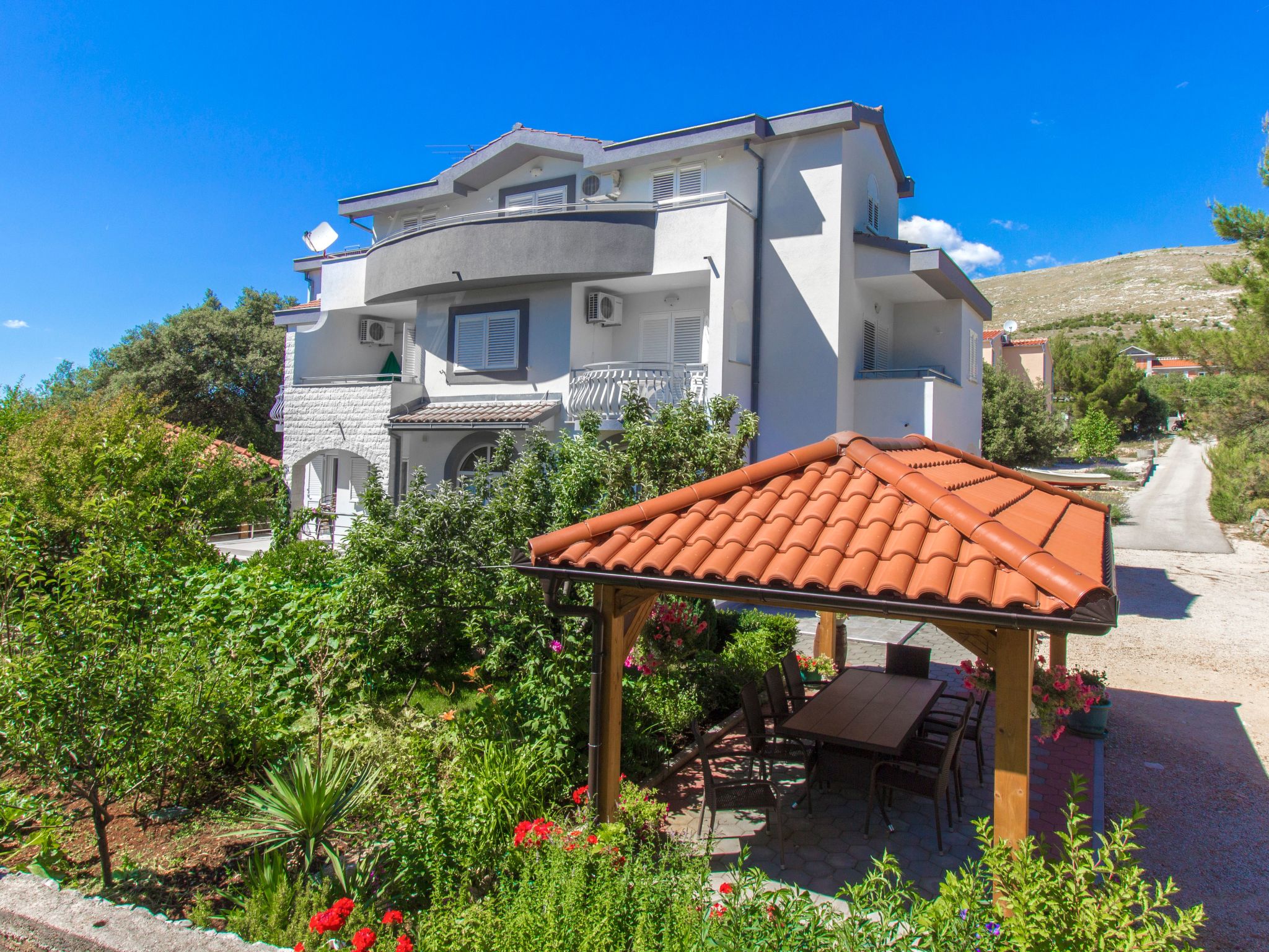 The modern apartment house with a total of six holiday apartments is located in Grebaštica, a picturesque coastal town in the vicinity of Sibenik. It is in a great position for a family vacation as it is only approximately 250 m away from the beach. The house is in a quiet setting along a not-often used road.Only recently (2016) modern and comfortably refurbished holiday apartments within walking distance to the sea, with a leafy communal garden and terraceThe apartment benefits from two private balconies, one facing south, another, smaller one facing north. Downstairs the garden area is equipped with garden furniture and a garden booth with a large table where you can enjoy shared meals. The property is suitable for children.This apartment is on the first floor and can accommodate four persons. It is about 38 m² in size and comprises of the following rooms: A living room with a flatscreen TV and a double sofa bed. There is also a bedroom next to it, which includes a double bed. Plus there is a fully-equipped kitchen with a dishwasher, filter coffee machine and a dining area, as well as an adjoining bathroom with a shower.The house is in the middle of Dalmatia. Grebastica is a little quiet place, we have beautiful beaches suitable for children. Nearby are two national parks, Krka and Kornati. You should definitely visit these two old Croatian towns: Sibenik and Trogir. In Šibenik we have the Cathedral of St. James and the fortress of St. Nicholas under the protection of UNESCO.Table tennis and table soccer are offered free of charge.