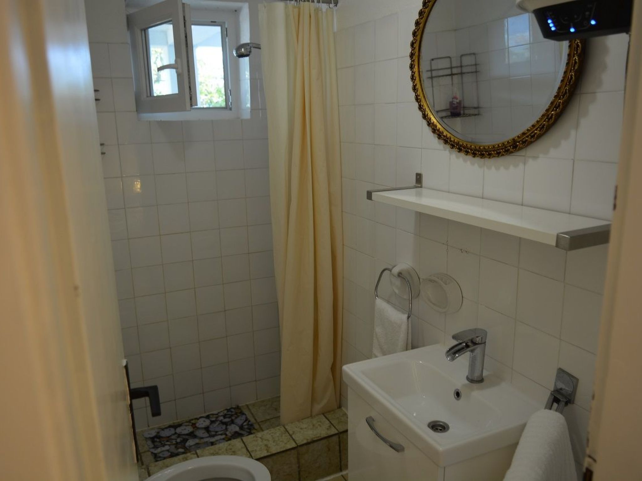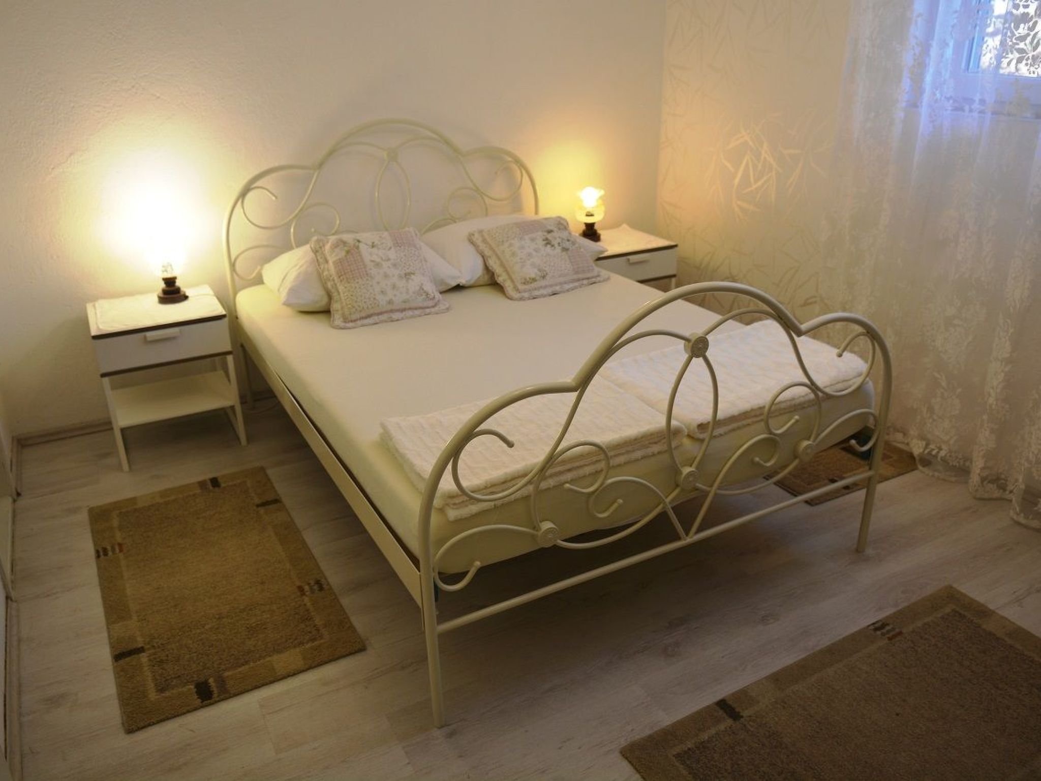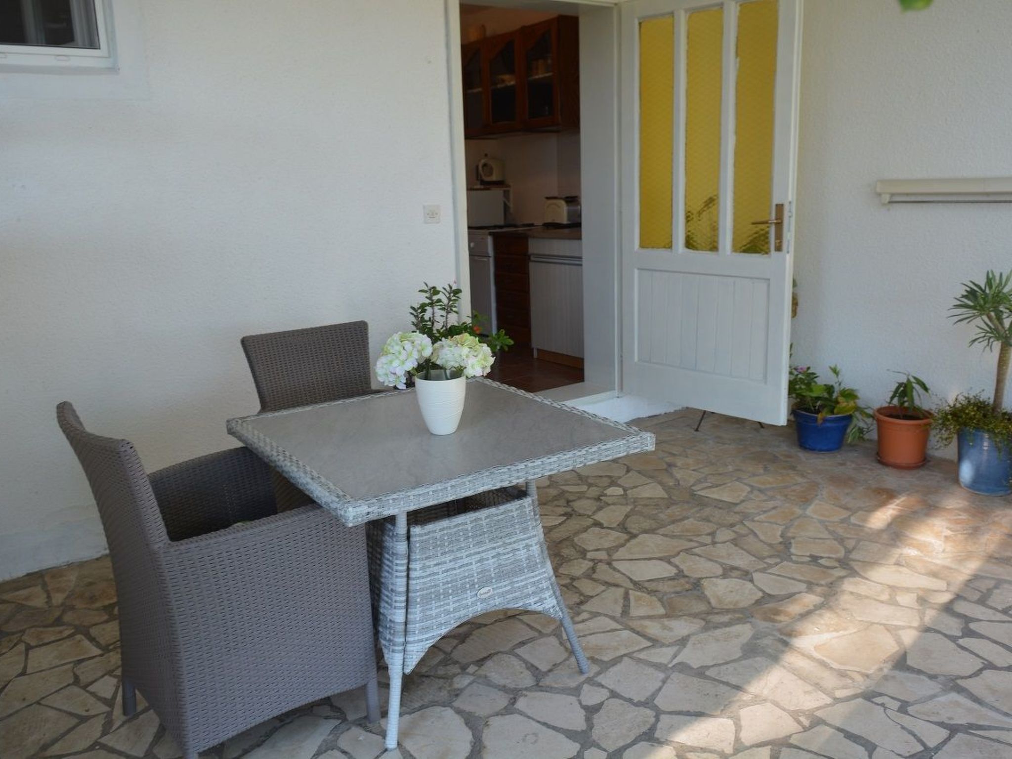 Ground-floor apartment with satellite TV, air conditioning, wireless Internet access, a private terrace and a parking space, very close to the beach.This holiday apartment provides 25m2 of living space comprising a double bedroom, an open kitchenette with a dining space and a shower room with a WC. The bedroom is furnished with a double bed 140cm wide, with bedside tables and reading lamps on either side. This room also has a double-door wardrobe for storing your clothing, along with a wall-mounted flatscreen TV with a satellite receiver for entertainment in the evening. You can make your own breakfast or other simple meals using the two-flame gas hob, microwave, kettle and coffee machine, as well as a fridge. You can dine at the dining table with two chairs. The bathroom with a window is fitted with a shower cubicle with a shower curtain, a WC and a washbasin with a wall cupboard and mirror.