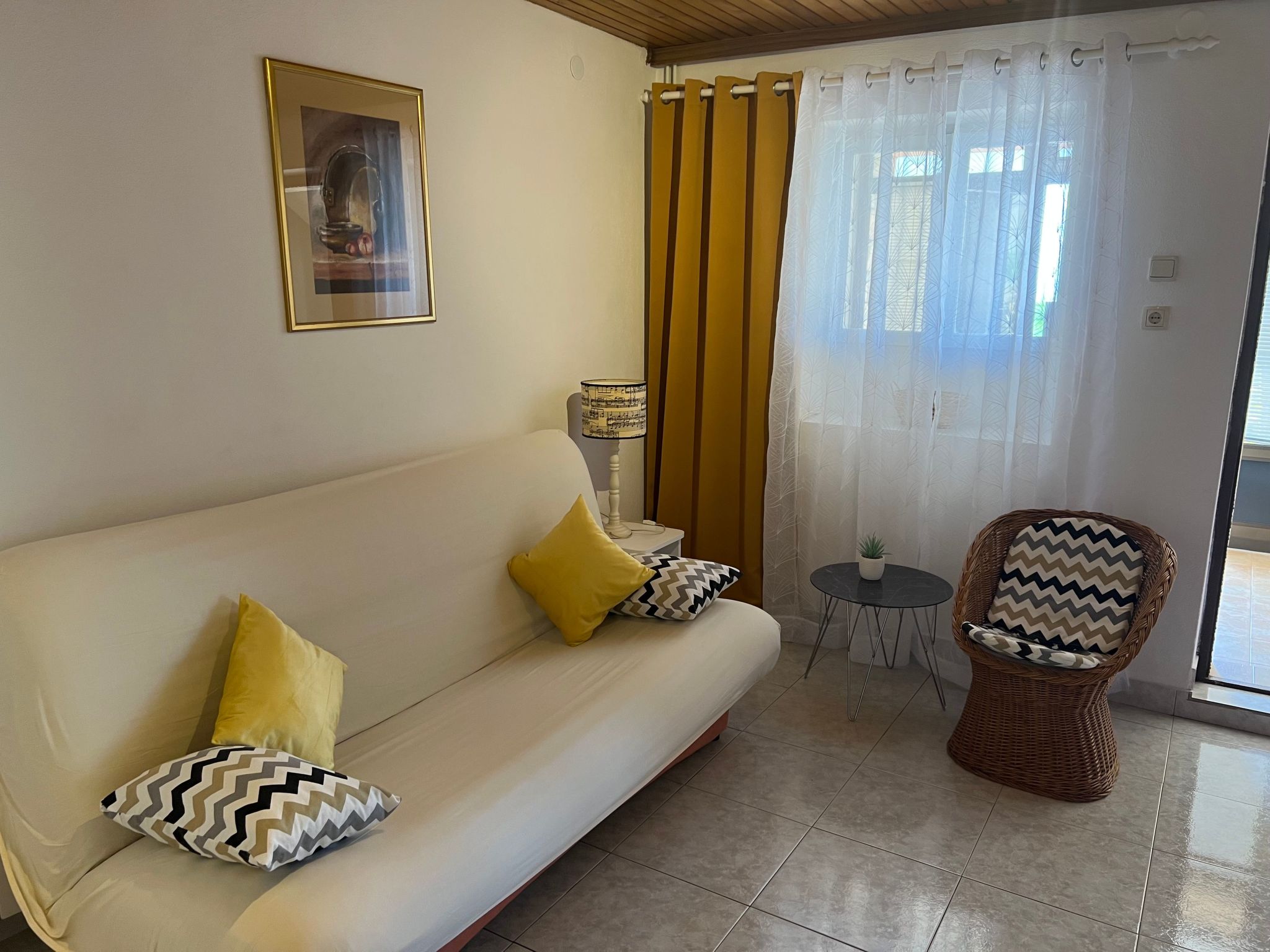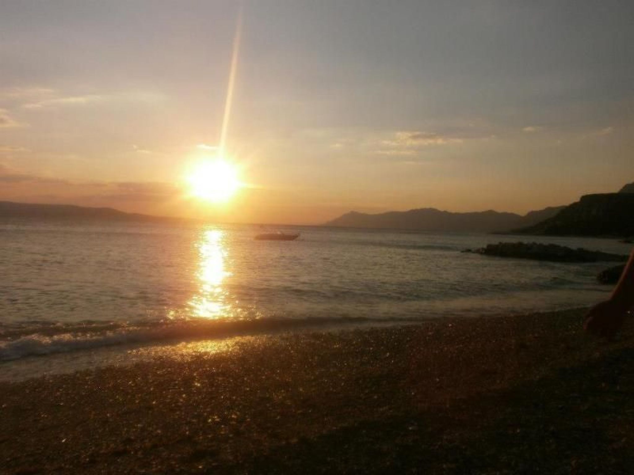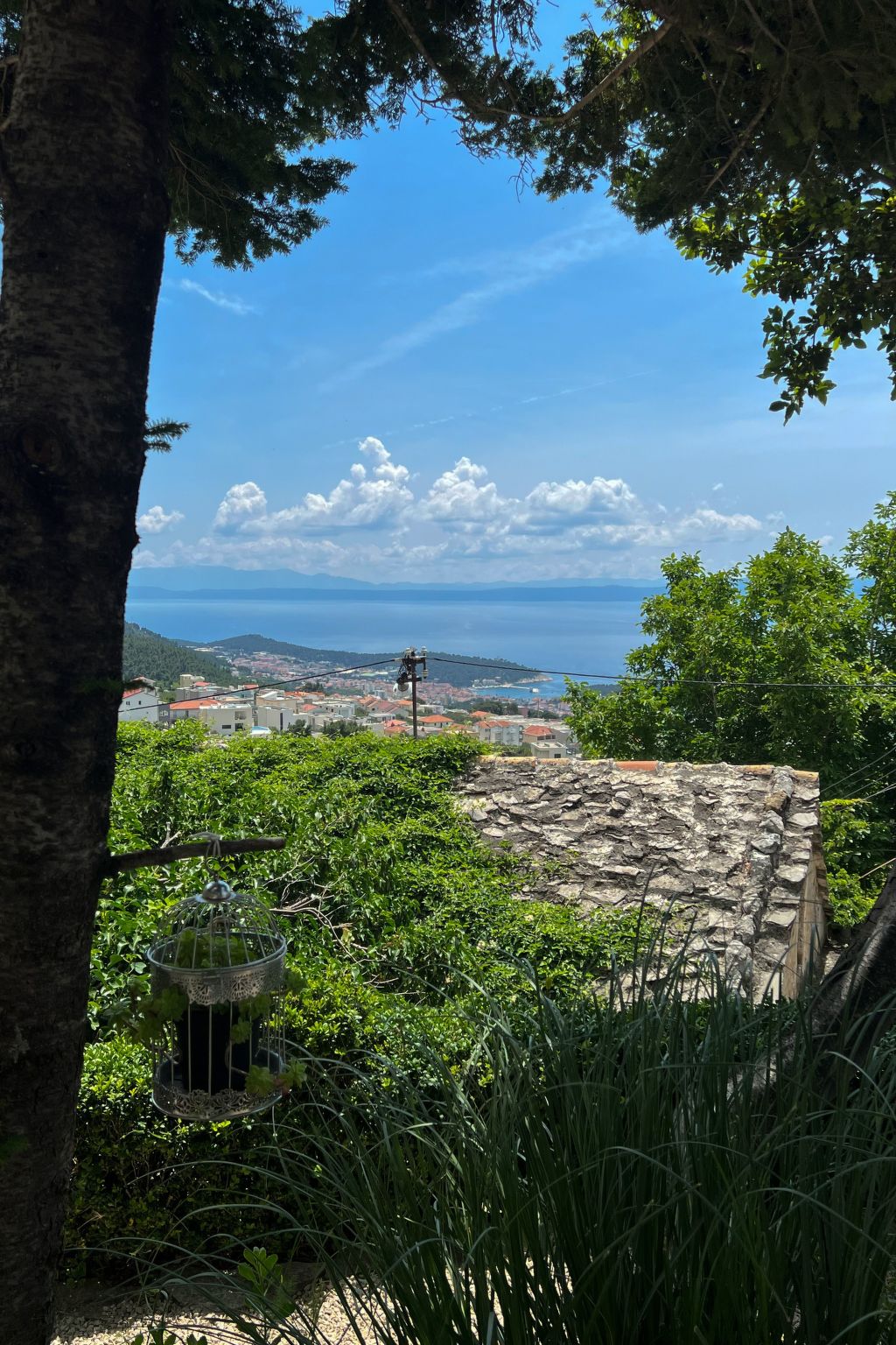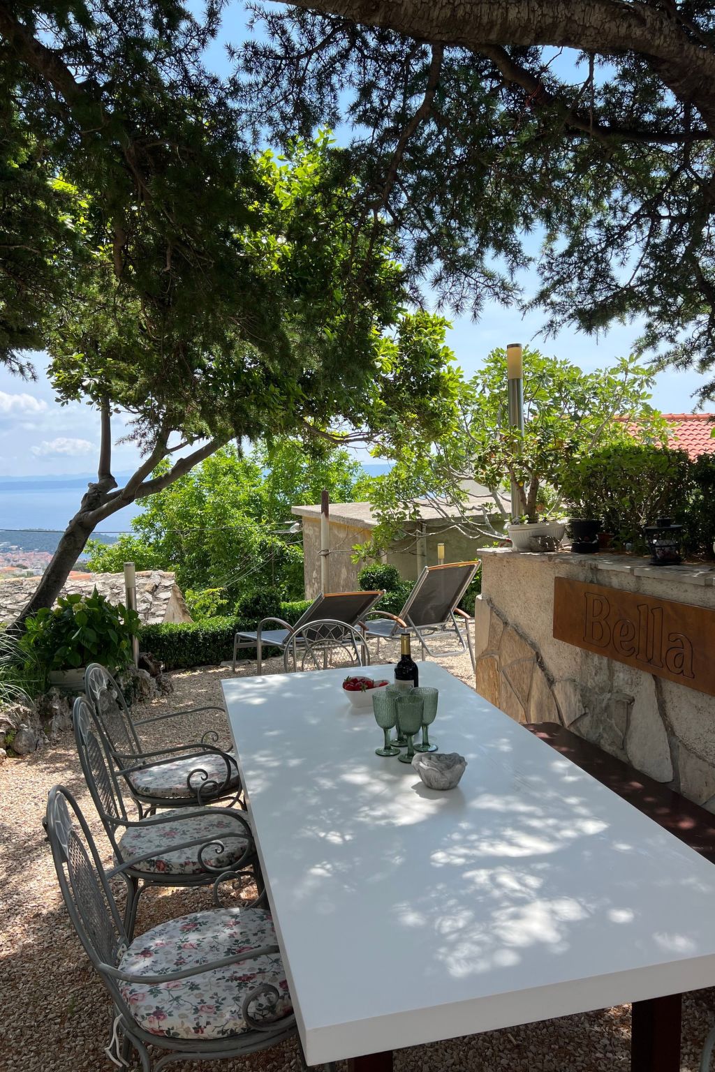 New, modern, beautiful flat house, above Makarska, in the district of Veliko brdo, 2.5 km from the centre of Makarska, in a quiet, sunny position on a slope, 2 km from the sea, 2 km from the beach, in the countryside, south facing position. For shared use: property 1300 m2 (fenced), outdoor shower. Garden furniture, barbecue. Car park at the house on the premises. Shop 1.0 km, restaurant 200 m, pebbly beach 2 km. The house is situated on the edge of an olive grove. Marvellous view of the town, island and sea. A warm welcome ! Accommodation: 3-room flat 43 m2, very comfortable, on the ground floor, south-west facing position, beautiful furnishings: Living/dining room 16 m2 with 1 sofa bed 140x200, SaTV , 1 bedroom with French-size bed 160xc200 cm; veranda to the south, exit to the garden (barbecue) with its own table, playground, , the kitchen: 2 hotplates, electric coffee machine), shower/WC. Beautiful panoramic view of the sea and mountains. A large Mediterranean garden. Ideal for families with 2 children. Ideal for those who want a relaxing holiday, away from the noise and mass tourism.