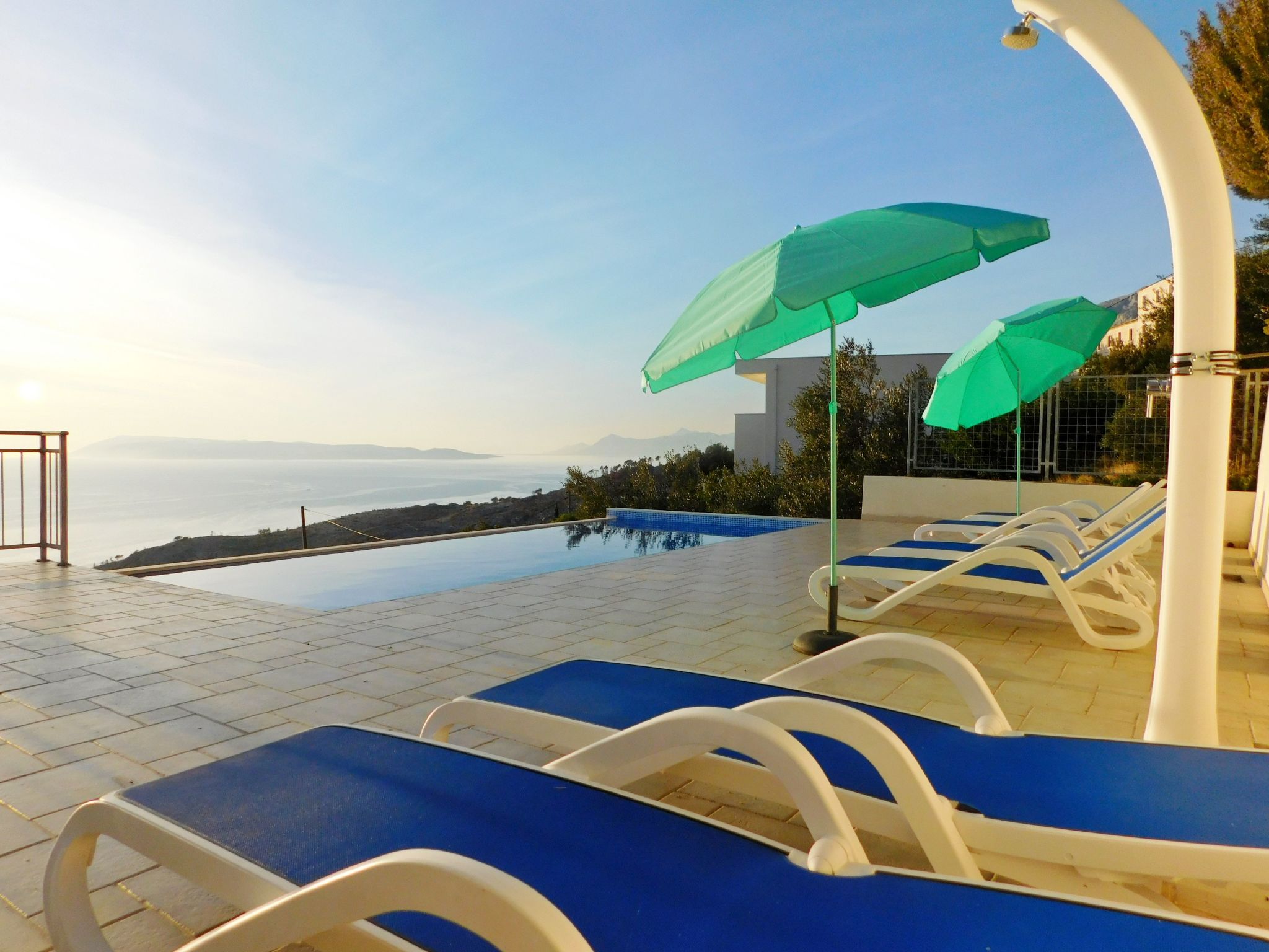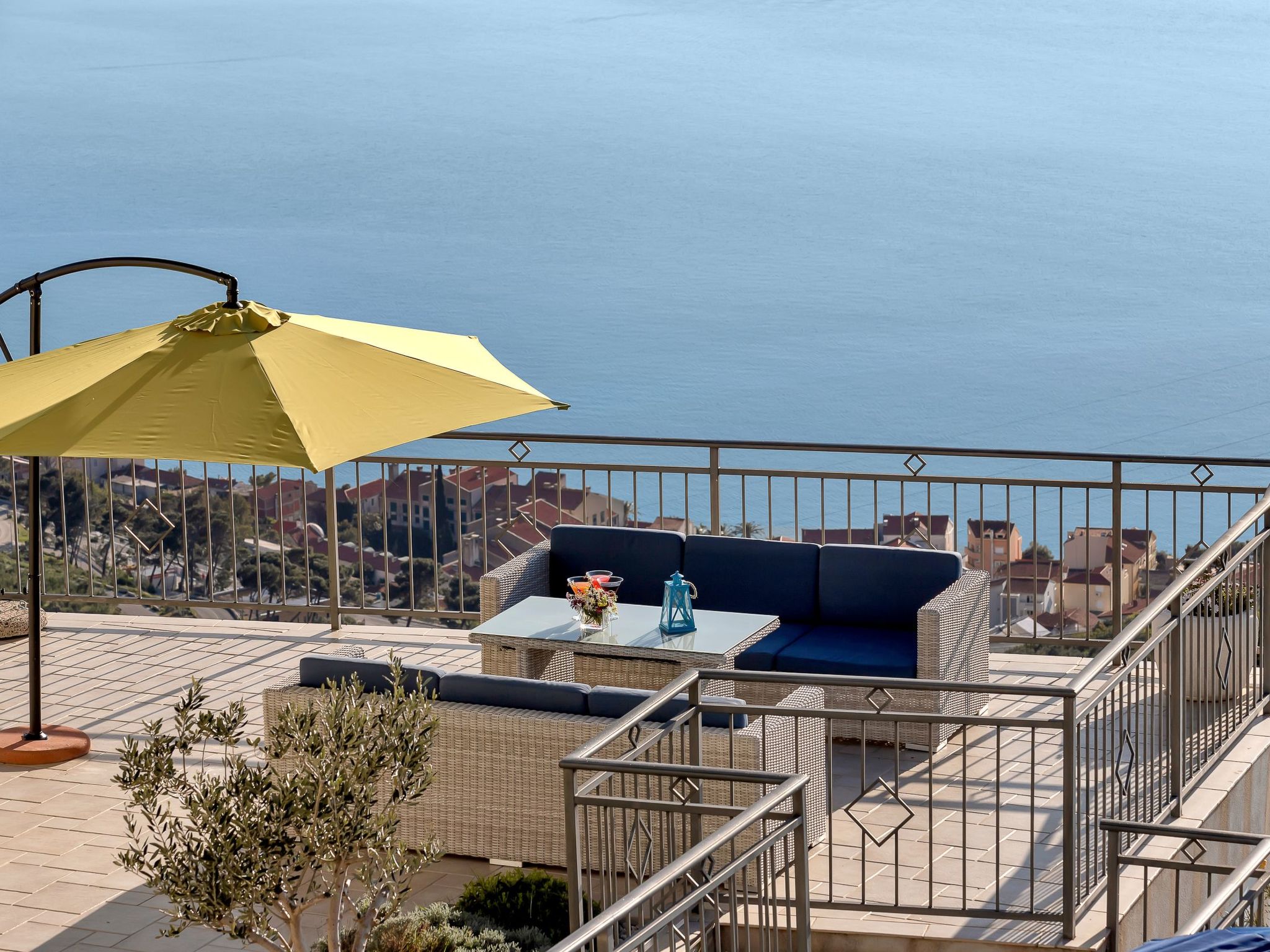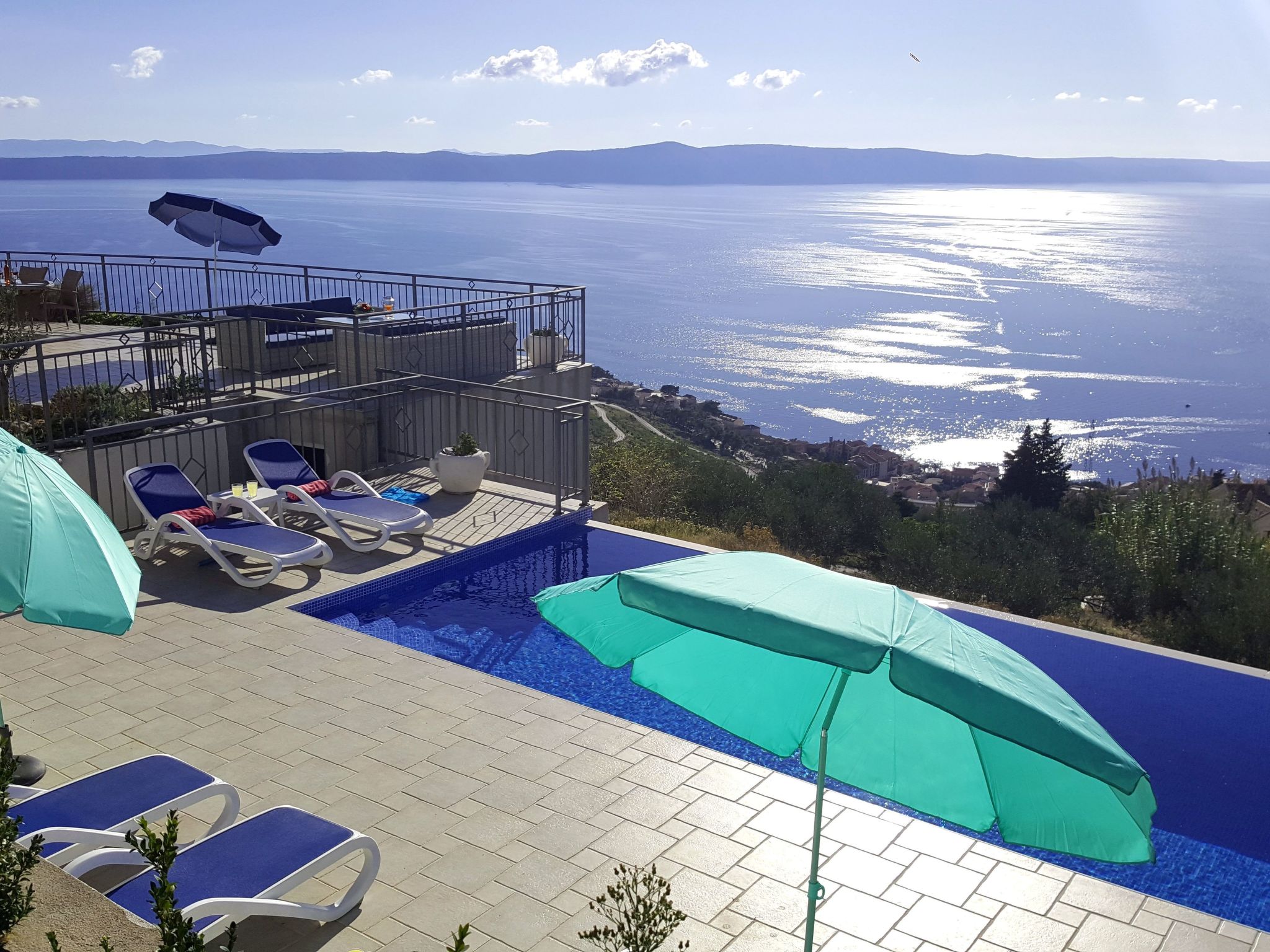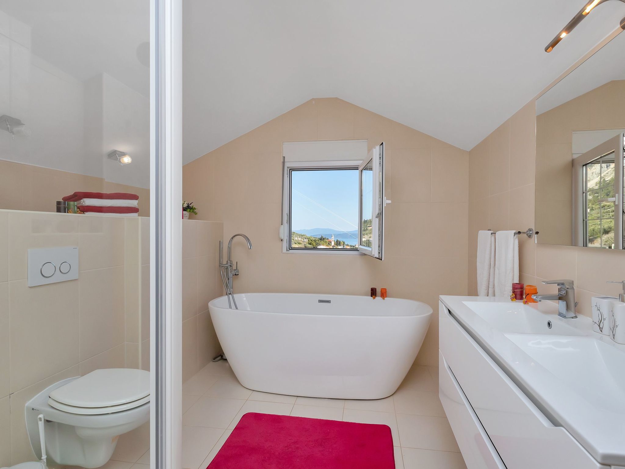 This beautiful villa is in an old village called Podgora and is surrounded by olive groves, vineyards and old stone ruins. Outside there are a big terrace with a table and chairs for six people, a roofed summer kitchen with a gas grill and sink, and as a highlight the 30m² infinity pool. There are four sun loungers. Three private parking spaces are available. The villa with 220m² of living space is very spacious and consists of three floors. On the ground floor there is a big living room with a dining area and an open, fully-equipped kitchen. The living room has a modern and comfortable corner sofa for six people and a big plasma TV. The dining space has a table and six chairs. The fully-equipped kitchen has a hob, oven, sink, microwave, fridge-freezer with an ice-making machine and water dispenser. There is also a dishwasher. On the first and second floors there are the bedrooms with a double bed each, each with its own bathroom and a balcony with a sea view. The beaches are only around two kilometres away. Restaurants, shops, bars, a pharmacy and other amenities are all within four minutes by car. The islands of Hvar and Brac are just short boat ride away. It is two hours by boat to Dubrovnik and just an hour to Split.The villa is brand new, air-conditioned and has all modern furniture. The villa is especially suitable for families and couples who would like to treat themselves to a beautiful holiday in a little village and near beaches and tourist amenities. Here you can enjoy true peace and quiet. The view of the Adriatic Sea is simply wonderful.