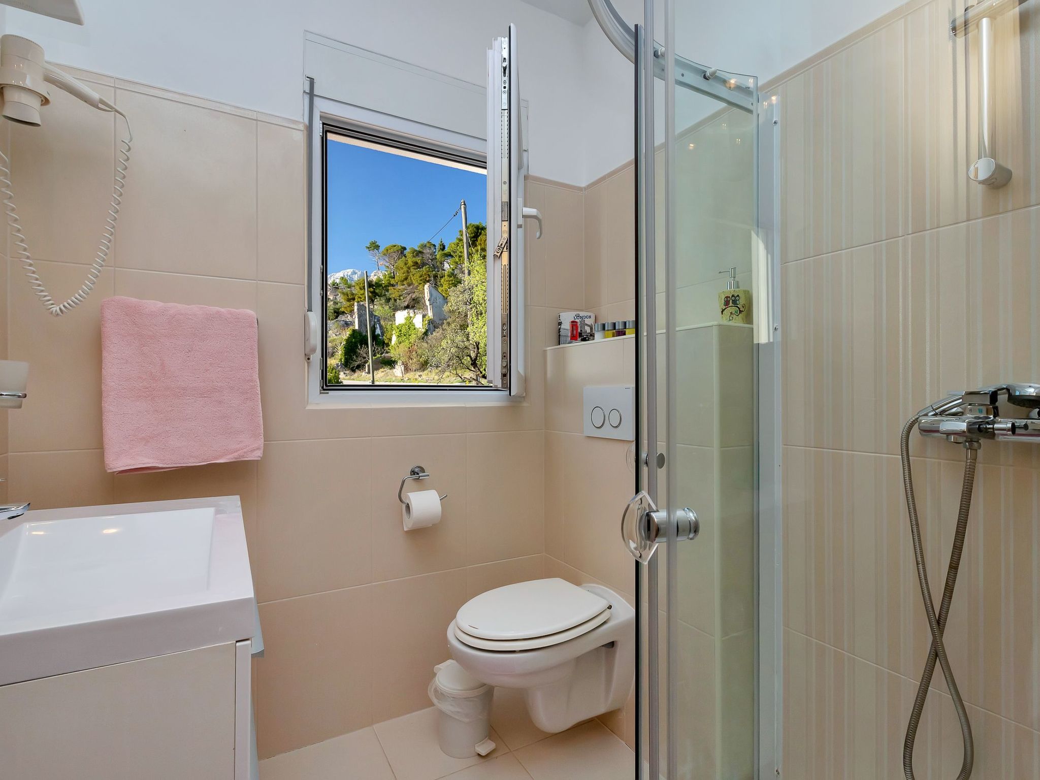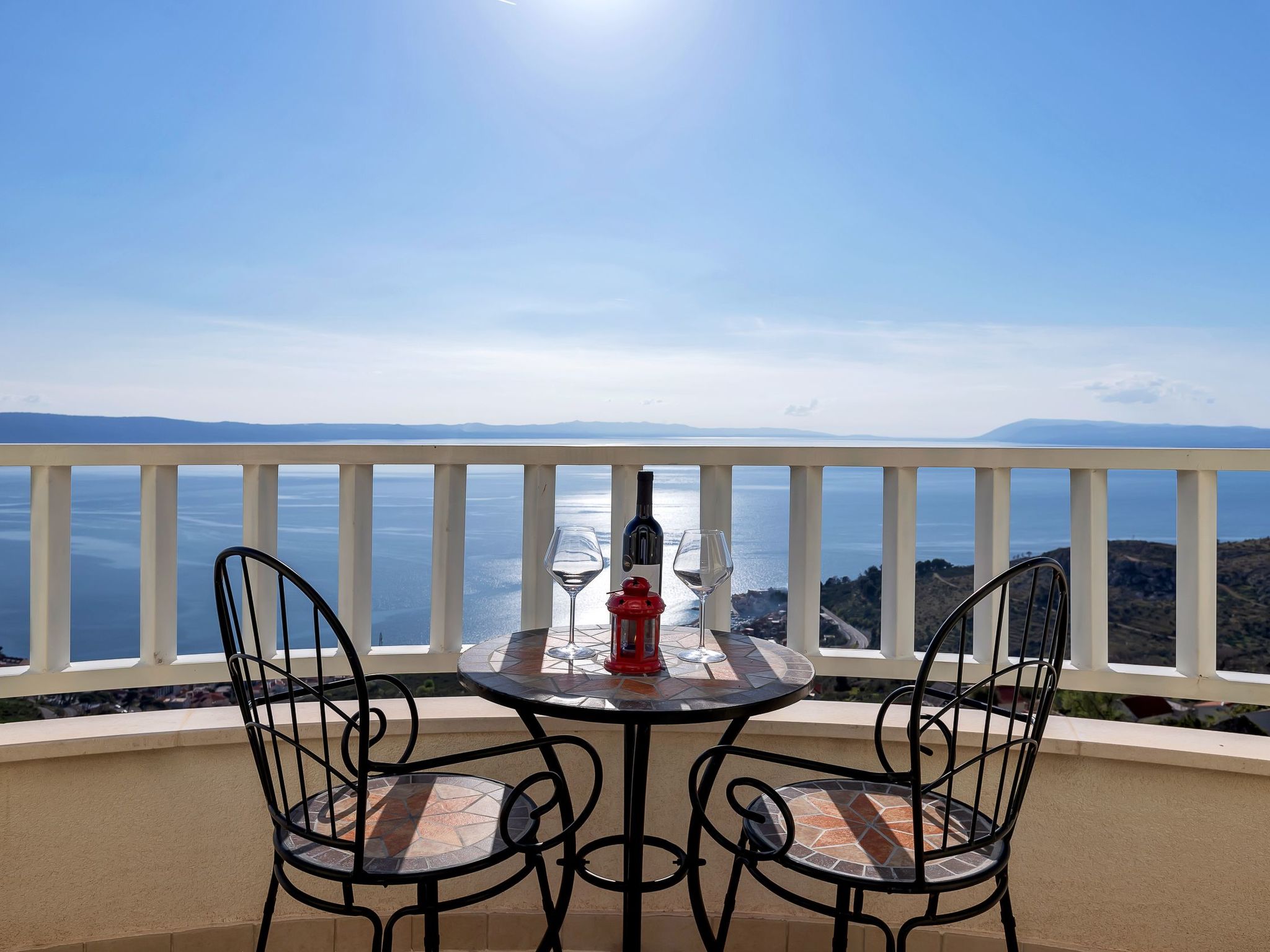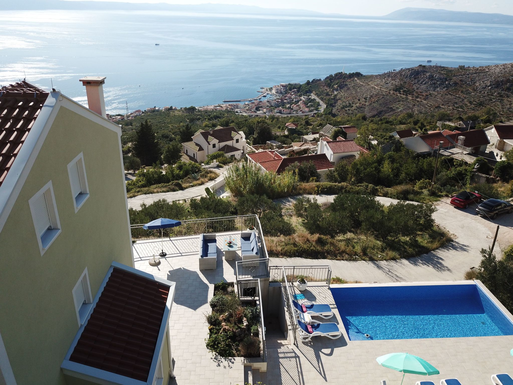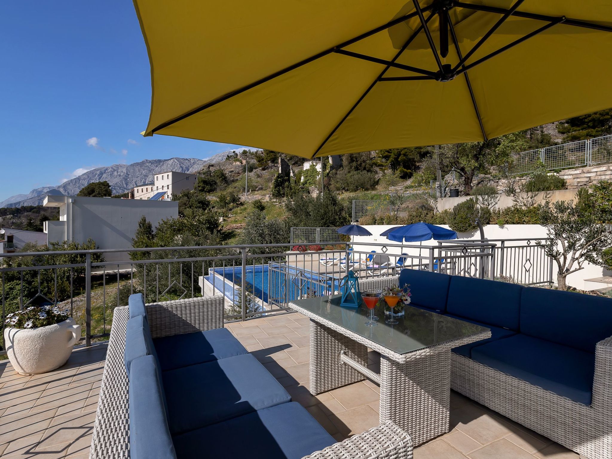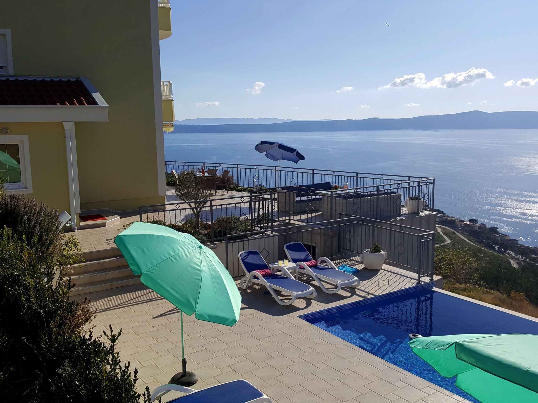 This beautiful villa is in an old village called Podgora and is surrounded by olive groves, vineyards and old stone ruins. Outside there are a big terrace with a table and chairs for six people, a roofed summer kitchen with a gas grill and sink, and as a highlight the 30m² infinity pool. There are four sun loungers. Three private parking spaces are available. The villa with 220m² of living space is very spacious and consists of three floors. On the ground floor there is a big living room with a dining area and an open, fully-equipped kitchen. The living room has a modern and comfortable corner sofa for six people and a big plasma TV. The dining space has a table and six chairs. The fully-equipped kitchen has a hob, oven, sink, microwave, fridge-freezer with an ice-making machine and water dispenser. There is also a dishwasher. On the first and second floors there are the bedrooms with a double bed each, each with its own bathroom and a balcony with a sea view. The beaches are only around two kilometres away. Restaurants, shops, bars, a pharmacy and other amenities are all within four minutes by car. The islands of Hvar and Brac are just short boat ride away. It is two hours by boat to Dubrovnik and just an hour to Split.The villa is brand new, air-conditioned and has all modern furniture. The villa is especially suitable for families and couples who would like to treat themselves to a beautiful holiday in a little village and near beaches and tourist amenities. Here you can enjoy true peace and quiet. The view of the Adriatic Sea is simply wonderful.