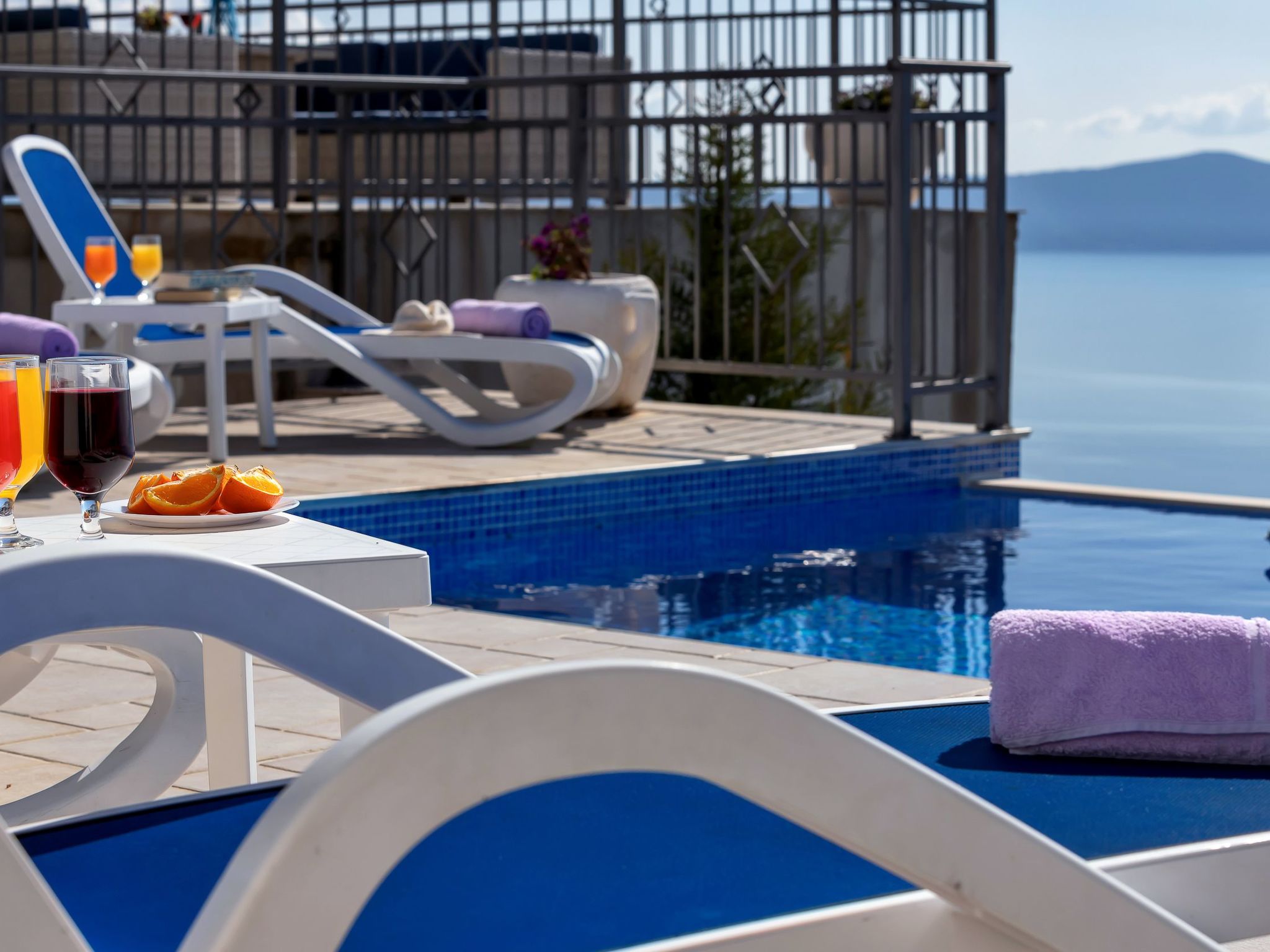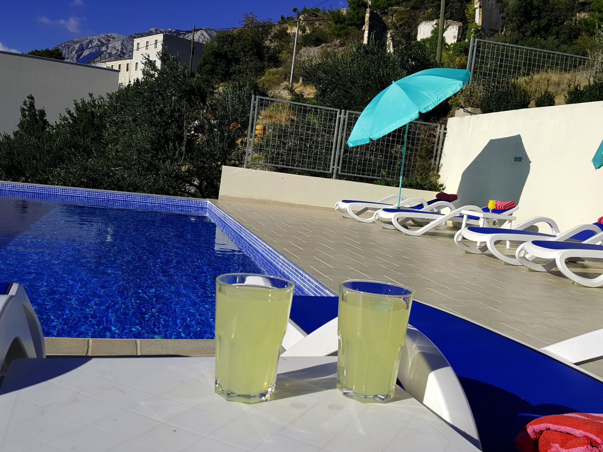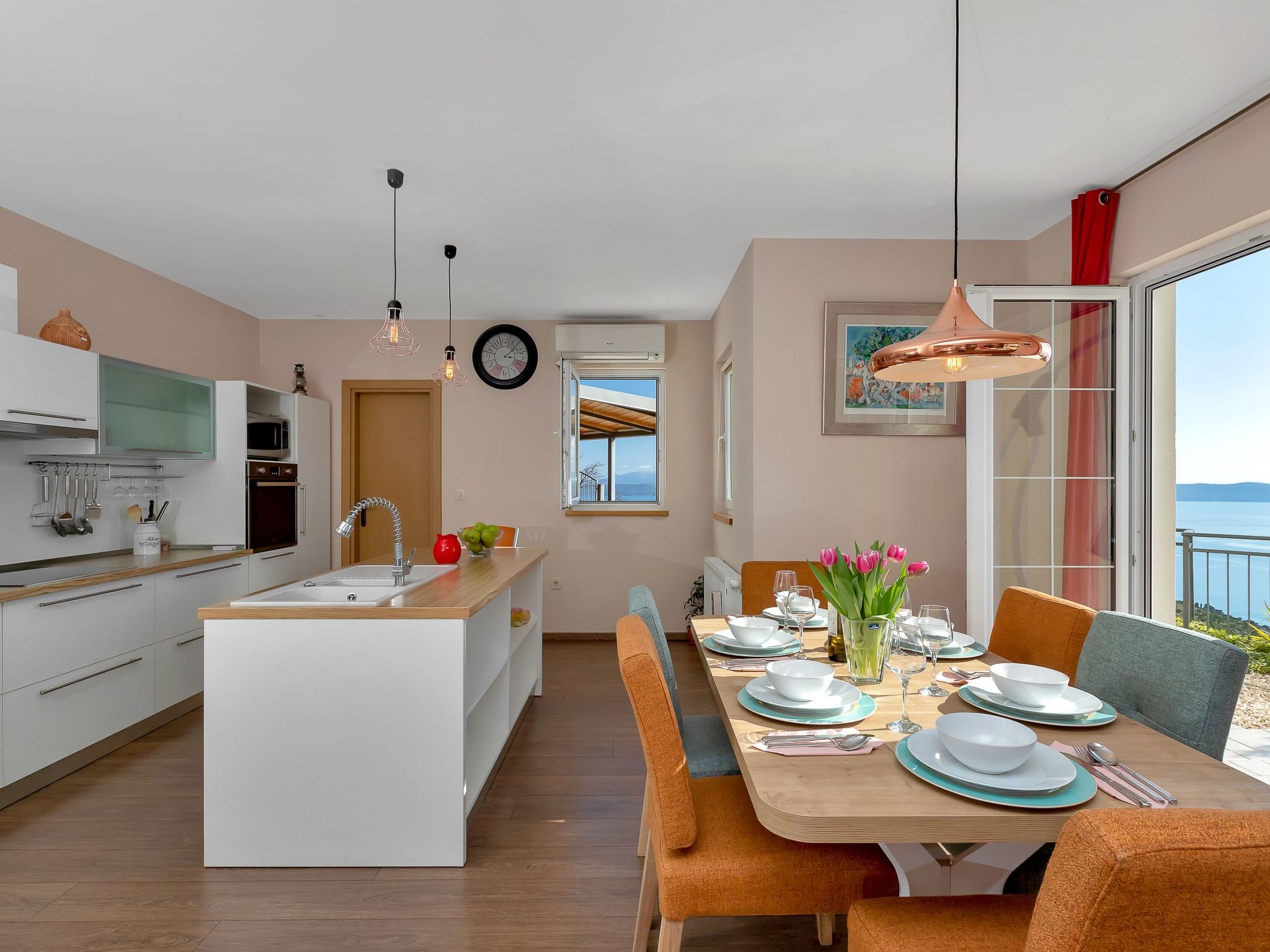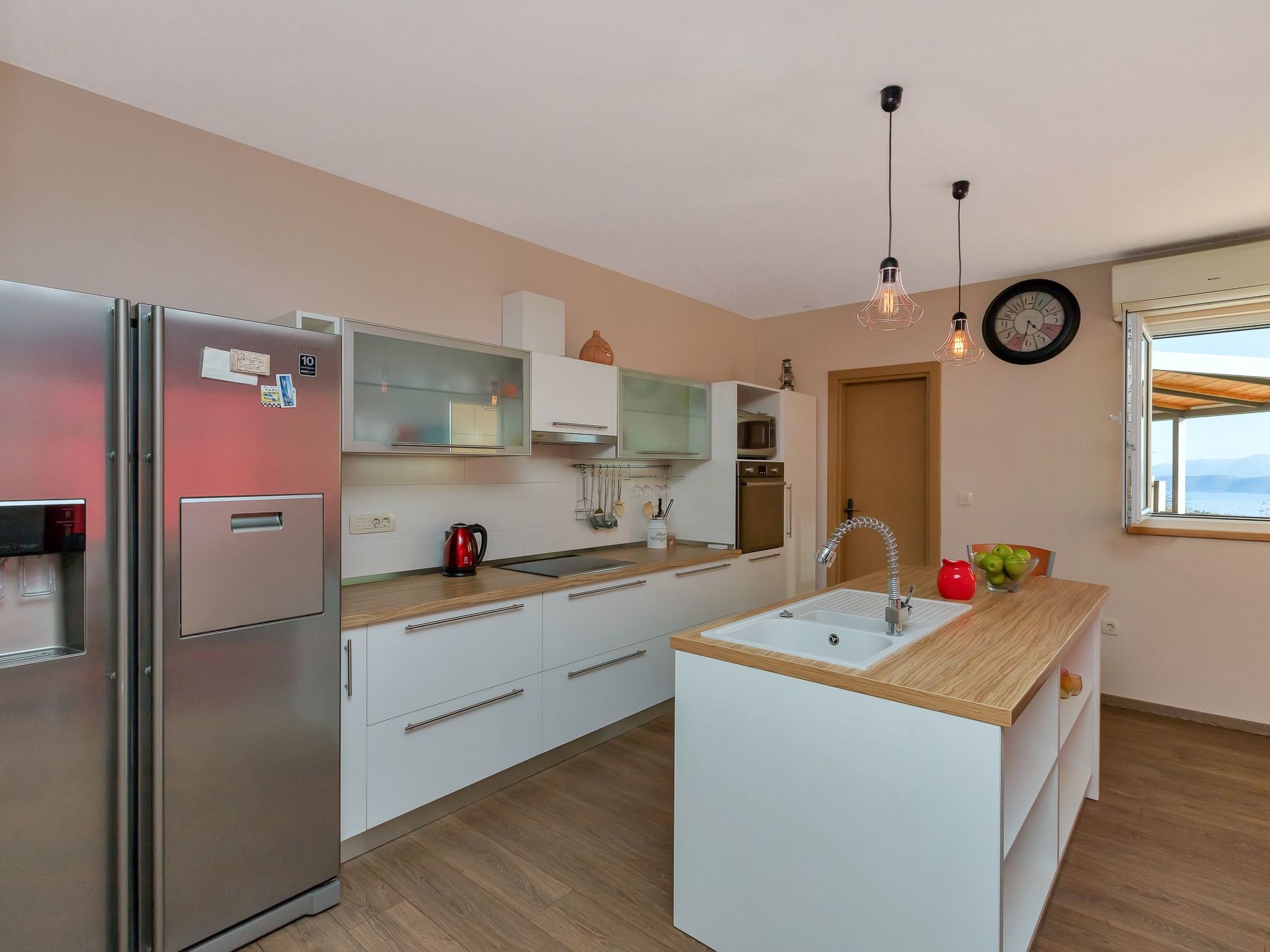 This beautiful villa is in an old village called Podgora and is surrounded by olive groves, vineyards and old stone ruins. Outside there are a big terrace with a table and chairs for six people, a roofed summer kitchen with a gas grill and sink, and as a highlight the 30m² infinity pool. There are four sun loungers. Three private parking spaces are available. The villa with 220m² of living space is very spacious and consists of three floors. On the ground floor there is a big living room with a dining area and an open, fully-equipped kitchen. The living room has a modern and comfortable corner sofa for six people and a big plasma TV. The dining space has a table and six chairs. The fully-equipped kitchen has a hob, oven, sink, microwave, fridge-freezer with an ice-making machine and water dispenser. There is also a dishwasher. On the first and second floors there are the bedrooms with a double bed each, each with its own bathroom and a balcony with a sea view. The beaches are only around two kilometres away. Restaurants, shops, bars, a pharmacy and other amenities are all within four minutes by car. The islands of Hvar and Brac are just short boat ride away. It is two hours by boat to Dubrovnik and just an hour to Split.The villa is brand new, air-conditioned and has all modern furniture. The villa is especially suitable for families and couples who would like to treat themselves to a beautiful holiday in a little village and near beaches and tourist amenities. Here you can enjoy true peace and quiet. The view of the Adriatic Sea is simply wonderful.
