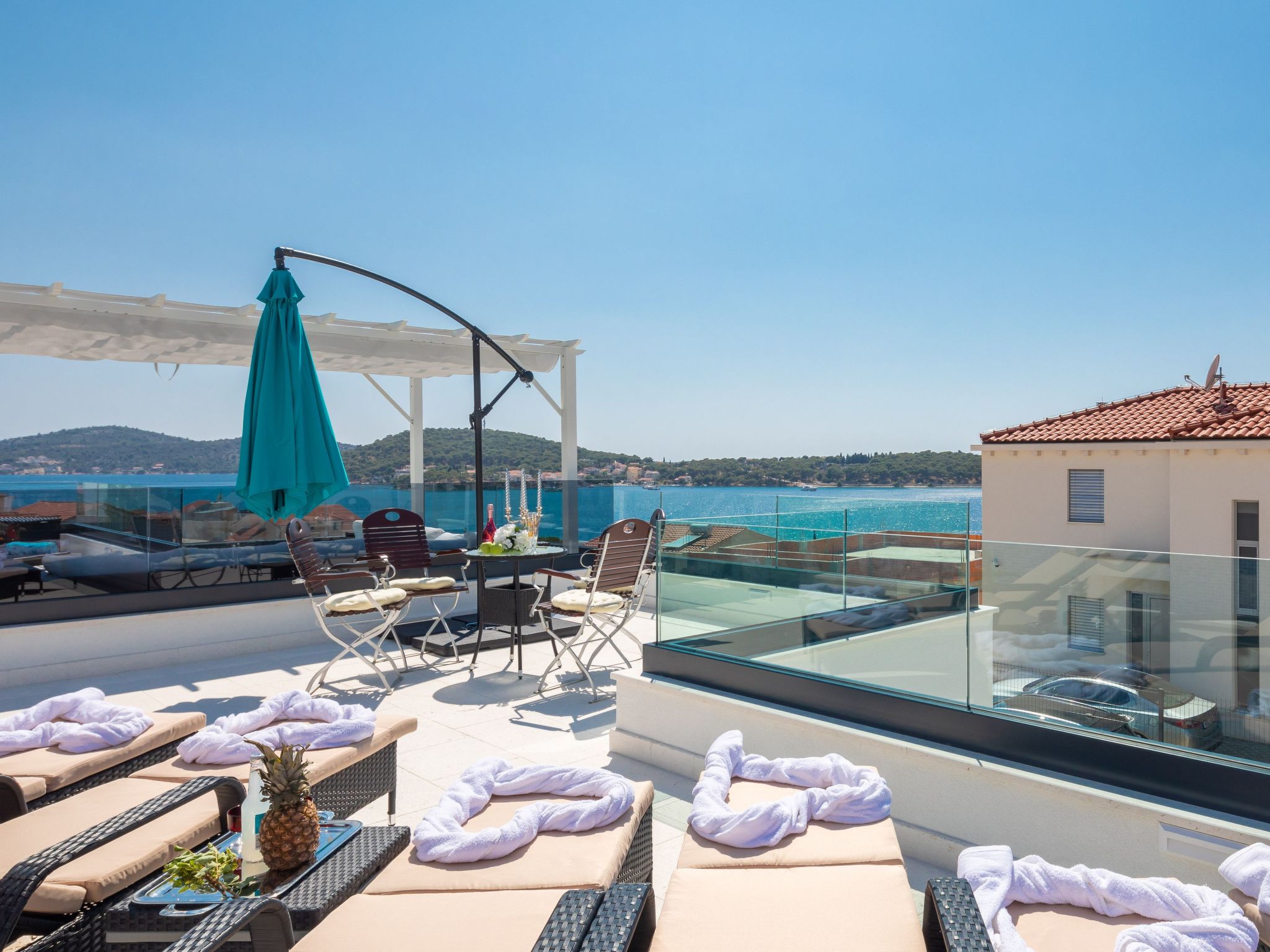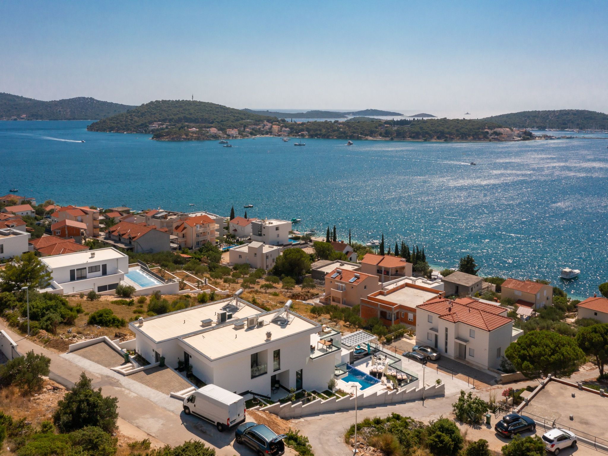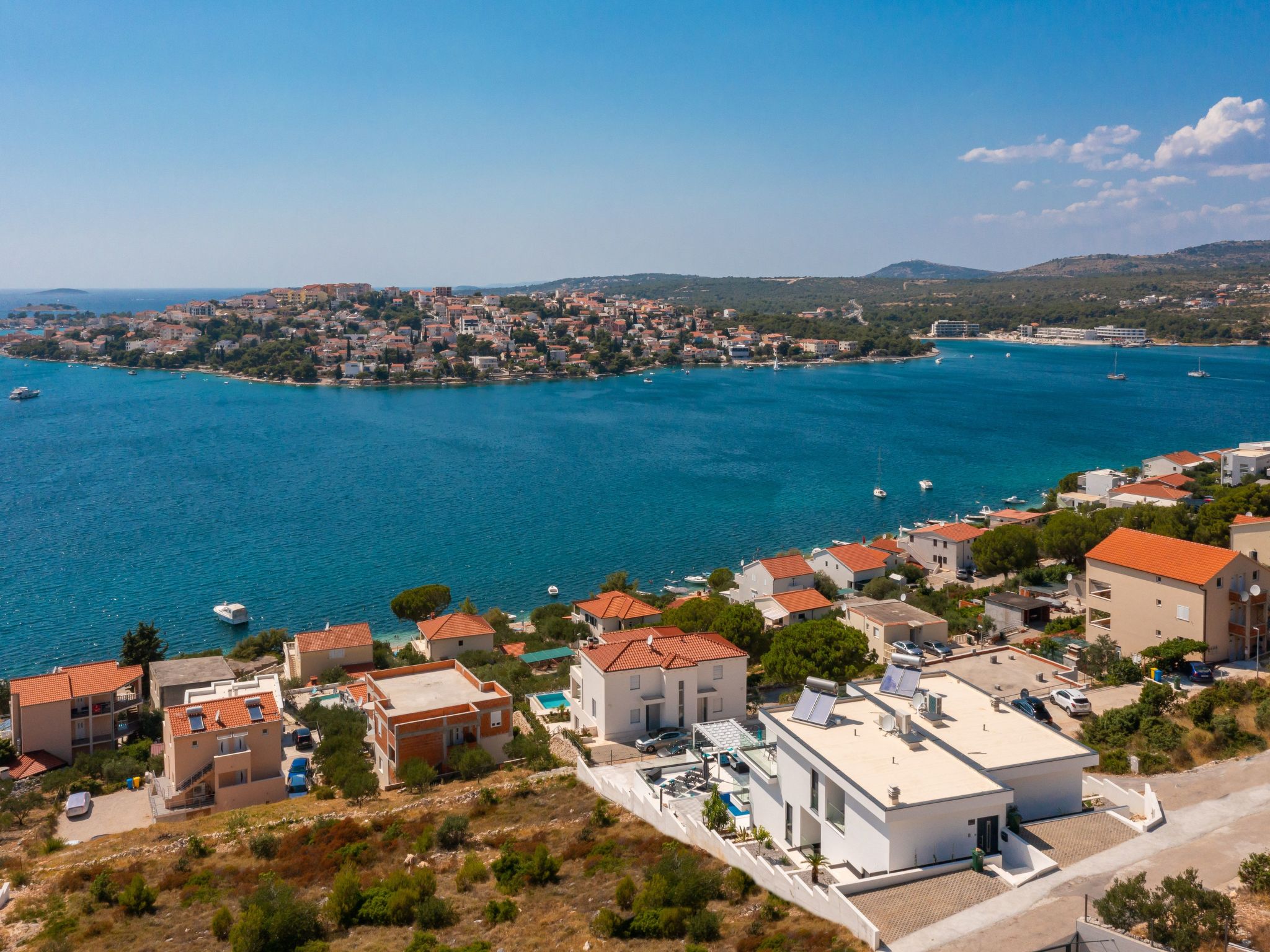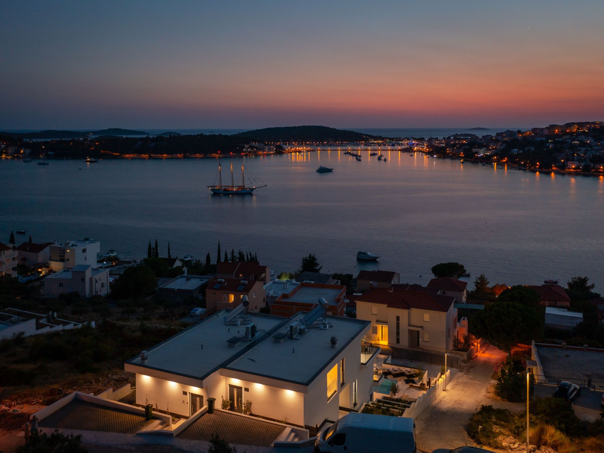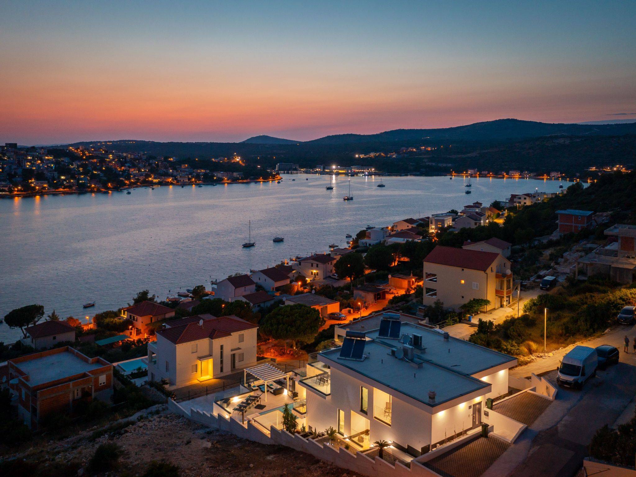The west-facing villa guarantees unforgettable sunsets. The pictures with the unique panorama are ideal for posting. All rooms are with sea view, balcony, terrace and smart TV. The towns of Primosten & Marina Frappa can be reached in a few minutes. In Rogoznica you will find many nice bars & restaurants on the new promenade. It is only about 80 metres from the villa to the beach & sea.Zatoglav is popular, many new, beautiful holiday homes. There is no need to worry about construction noise during the season, work on new houses is suspended until the end of September. There are many new houses in the neighbourhood, but also simple houses that are a little older.On the beach, which is about 80 metres from the house, there is always a place to sunbathe, even in the high season. Zatoglav is an absolutely quiet place, the road that leads to Zatoglav also ends here. So there is no through traffic. Rogoznica is just a few minutes away. There are several supermarkets, banks, doctors and of course many restaurants offering fresh fish. For those who like to prepare their own fish, there is also a fish market offering the catch of the day. Several bakeries offer fresh bread every day and there is also a delivery service to the villas. The Marina Frappa harbour guarantees sophisticated boats and maritime flair. In addition to live music during the season, there are also culinary delights right on the harbour. The jetties are open and the boats can be used for souvenir photos.In Rogoznica you can hire all kinds of water sports, sailing boats and motorboats, jet skis and stand-up paddle boards. A highlight is the Dragon Eye near Marina Frappa, an archaeological phenomenon that takes us back thousands of years. You will be amazed. From Rogoznica it is only a few minutes' drive to Primosten. This small, picturesque town is the postcard motif par excellence. We particularly recommend the sunset and the live music during the season. A detour to the Nardin restaurant is absolutely worthwhile, super sushi and top wines await the guest. If you drive further north, towards Sebinik, the coast is always on the left and you can't help but be amazed. Many beautiful restaurants, secluded beaches. After about 30 minutes you reach Sibenik, this old harbour town with its fortifications has an extremely attractive old town where the evening life pulsates. Many new restaurants and chic bars have opened in recent years and offer a really attractive programme.The villa was built in a modern style, all rooms are west-facing and there are stunning sea views from every bedroom. The rooms are all brightly decorated and furnished in a modern maritime style. Each bedroom has a Smart TV with internet access and the ability to watch Netflix, Prime, etc. The living room has a 65-inch screen and a Marshall jukebox that can be used to control Bluetooth and other sources. A total of 220 square metres of living space is available. The large living room with integrated dining room and designer kitchen guarantee pleasant evenings. All modern cooking facilities are available and invite you to enjoy.In the outdoor area there is a large dining table and sun loungers for 8 people, the sun loungers have storage tables with a cooling compartment. A large gas barbecue turns the barbecue party into a leisure highlight.Rogoznica, about 3 km away, is one of the most beautiful marinas in Croatia. There are bathing facilities everywhere, gravel, concrete, some even with sand. The Dragon eye is one of the attractions in Rogoznica. Primosten about 10 km away is a popular excursion destination with a unique backdrop, this island town is a must for every holidaymaker. Trogir is about 20 minutes away and is highly recommended with its cosy old town. The rest of the fortress can be admired, but there is also a beautiful waterfront promenade with moorings for luxury yachts. The largest city in the region, Split, is about 45 minutes away. Nightlife, culture, shopping malls, the airport, everything is available here