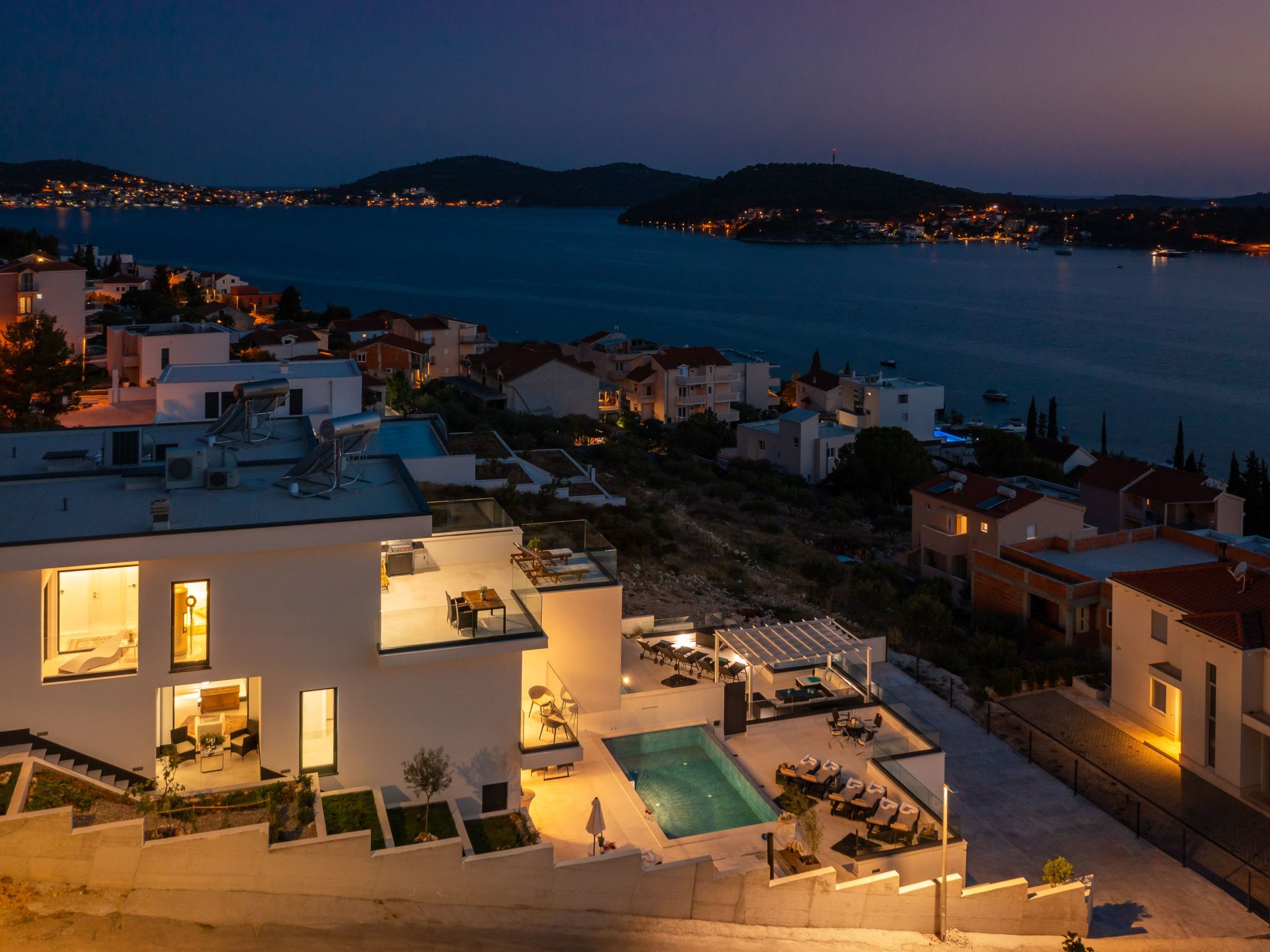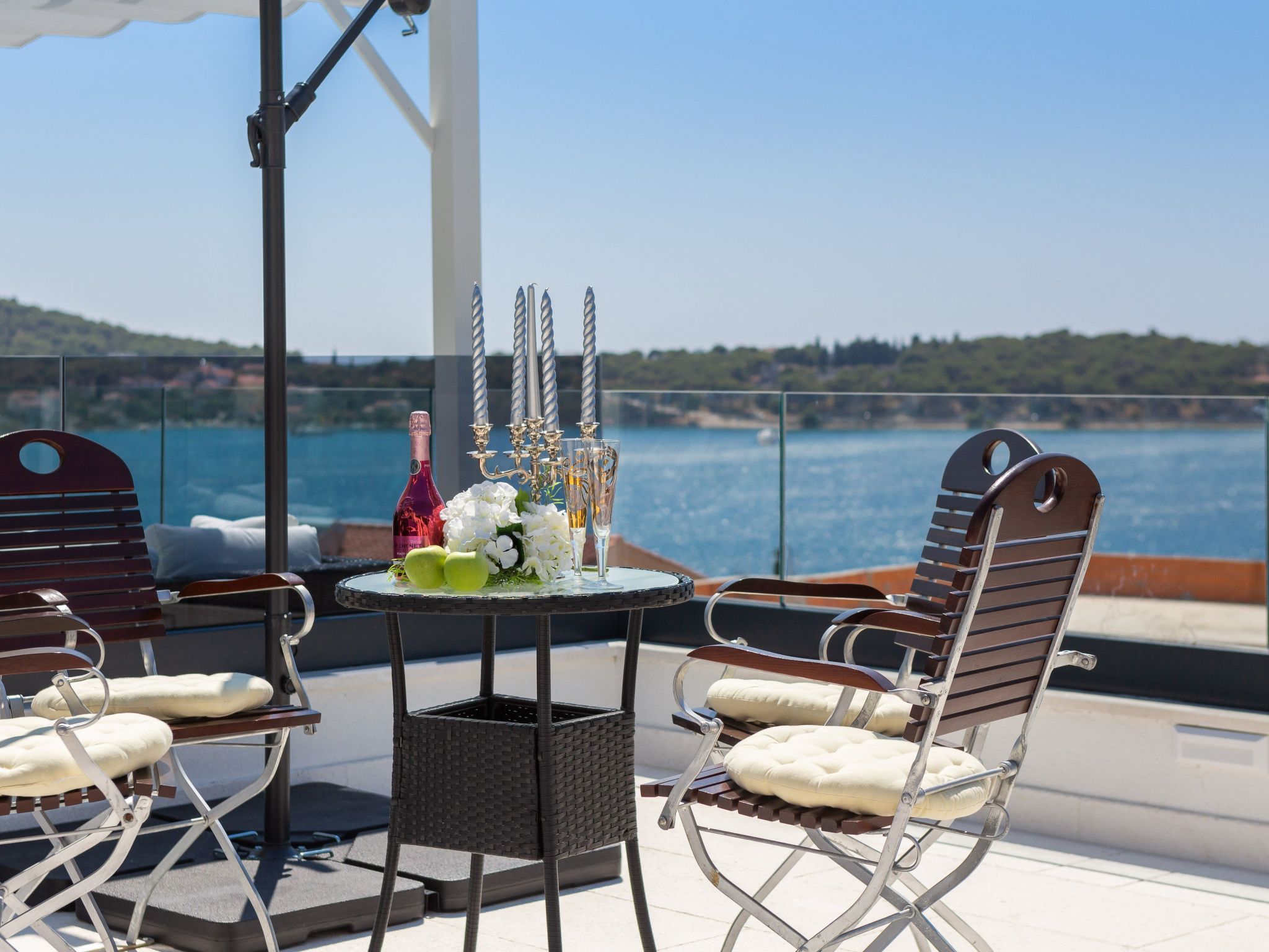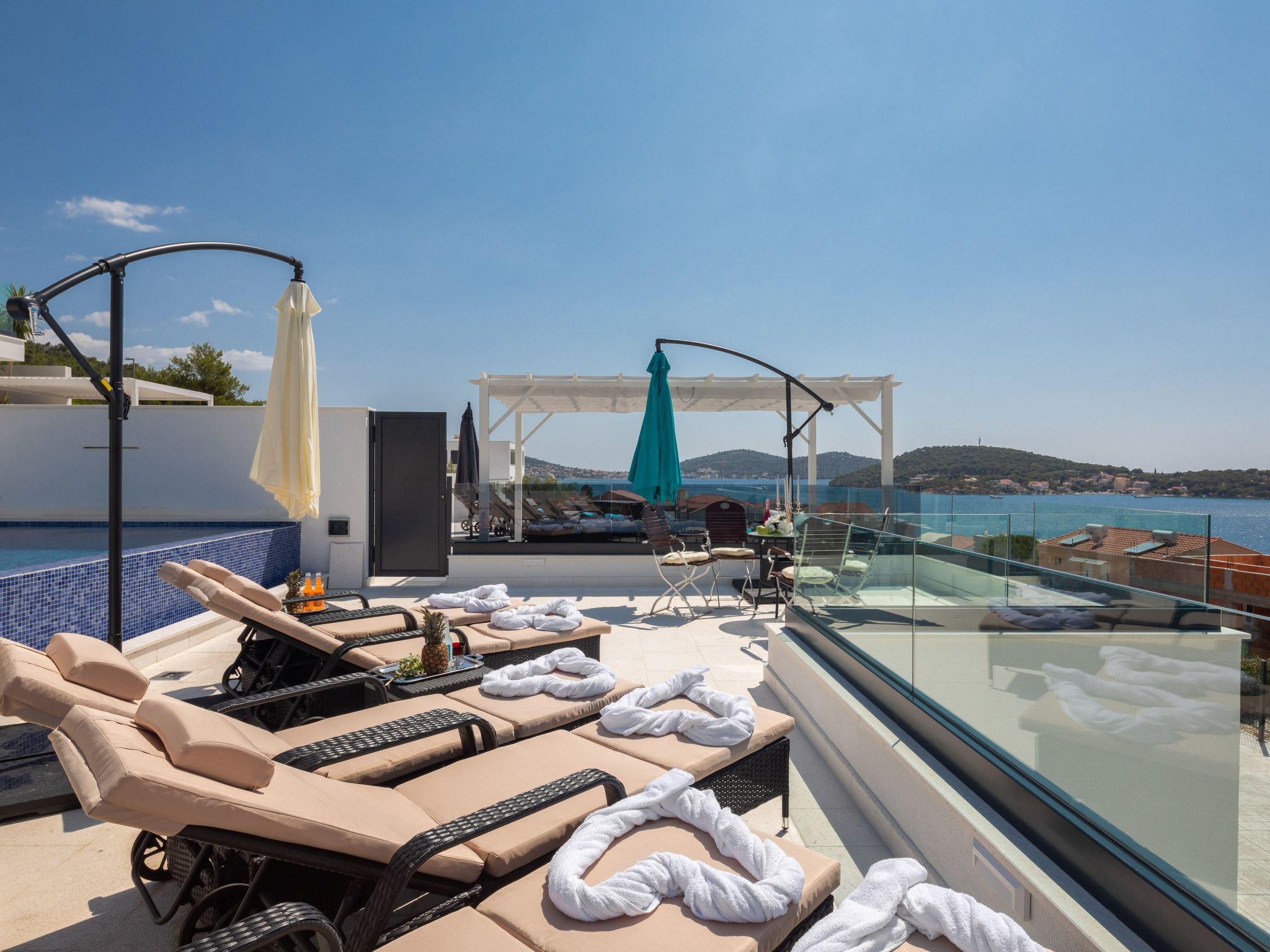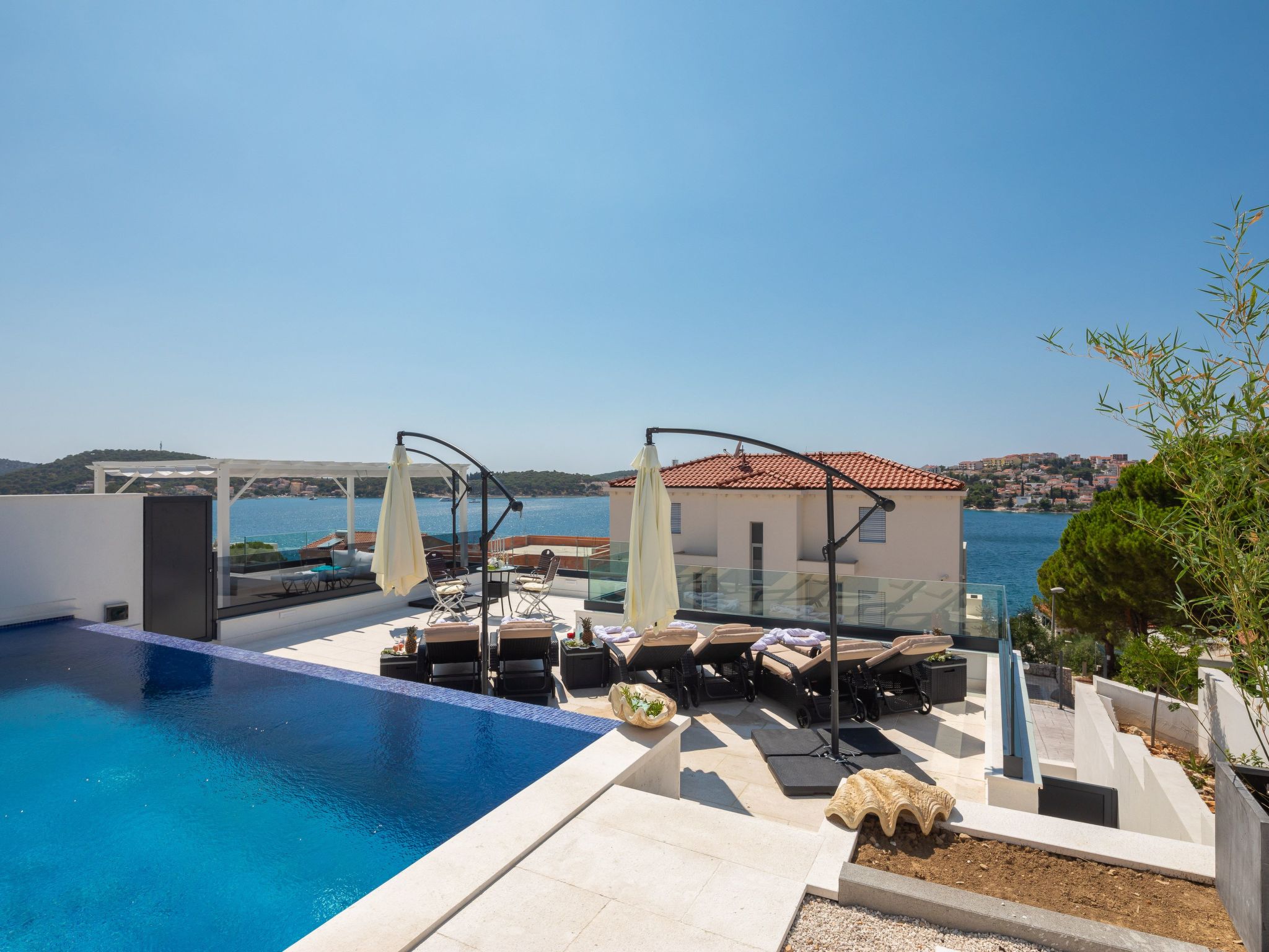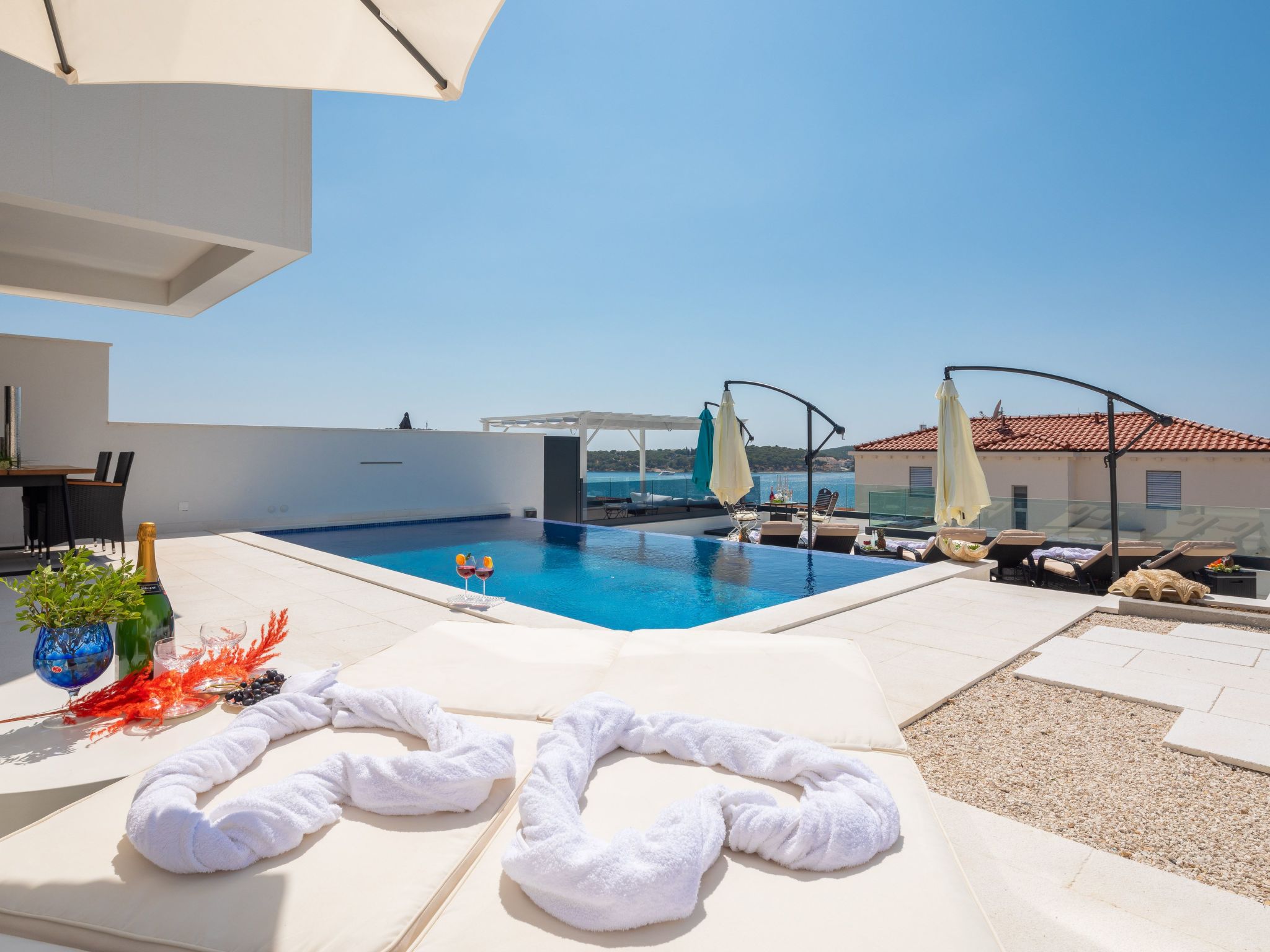 The west-facing villa guarantees unforgettable sunsets. The pictures with the unique panorama are ideal for posting. All rooms are with sea view, balcony, terrace and smart TV. The towns of Primosten & Marina Frappa can be reached in a few minutes. In Rogoznica you will find many nice bars & restaurants on the new promenade. It is only about 80 metres from the villa to the beach & sea.Zatoglav is popular, many new, beautiful holiday homes. There is no need to worry about construction noise during the season, work on new houses is suspended until the end of September. There are many new houses in the neighbourhood, but also simple houses that are a little older.On the beach, which is about 80 metres from the house, there is always a place to sunbathe, even in the high season. Zatoglav is an absolutely quiet place, the road that leads to Zatoglav also ends here. So there is no through traffic. Rogoznica is just a few minutes away. There are several supermarkets, banks, doctors and of course many restaurants offering fresh fish. For those who like to prepare their own fish, there is also a fish market offering the catch of the day. Several bakeries offer fresh bread every day and there is also a delivery service to the villas. The Marina Frappa harbour guarantees sophisticated boats and maritime flair. In addition to live music during the season, there are also culinary delights right on the harbour. The jetties are open and the boats can be used for souvenir photos.In Rogoznica you can hire all kinds of water sports, sailing boats and motorboats, jet skis and stand-up paddle boards. A highlight is the Dragon Eye near Marina Frappa, an archaeological phenomenon that takes us back thousands of years. You will be amazed. From Rogoznica it is only a few minutes' drive to Primosten. This small, picturesque town is the postcard motif par excellence. We particularly recommend the sunset and the live music during the season. A detour to the Nardin restaurant is absolutely worthwhile, super sushi and top wines await the guest. If you drive further north, towards Sebinik, the coast is always on the left and you can't help but be amazed. Many beautiful restaurants, secluded beaches. After about 30 minutes you reach Sibenik, this old harbour town with its fortifications has an extremely attractive old town where the evening life pulsates. Many new restaurants and chic bars have opened in recent years and offer a really attractive programme.The villa was built in a modern style, all rooms are west-facing and there are stunning sea views from every bedroom. The rooms are all brightly decorated and furnished in a modern maritime style. Each bedroom has a Smart TV with internet access and the ability to watch Netflix, Prime, etc. The living room has a 65-inch screen and a Marshall jukebox that can be used to control Bluetooth and other sources. A total of 220 square metres of living space is available. The large living room with integrated dining room and designer kitchen guarantee pleasant evenings. All modern cooking facilities are available and invite you to enjoy.In the outdoor area there is a large dining table and sun loungers for 8 people, the sun loungers have storage tables with a cooling compartment. A large gas barbecue turns the barbecue party into a leisure highlight.Rogoznica, about 3 km away, is one of the most beautiful marinas in Croatia. There are bathing facilities everywhere, gravel, concrete, some even with sand. The Dragon eye is one of the attractions in Rogoznica. Primosten about 10 km away is a popular excursion destination with a unique backdrop, this island town is a must for every holidaymaker. Trogir is about 20 minutes away and is highly recommended with its cosy old town. The rest of the fortress can be admired, but there is also a beautiful waterfront promenade with moorings for luxury yachts. The largest city in the region, Split, is about 45 minutes away. Nightlife, culture, shopping malls, the airport, everything is available here