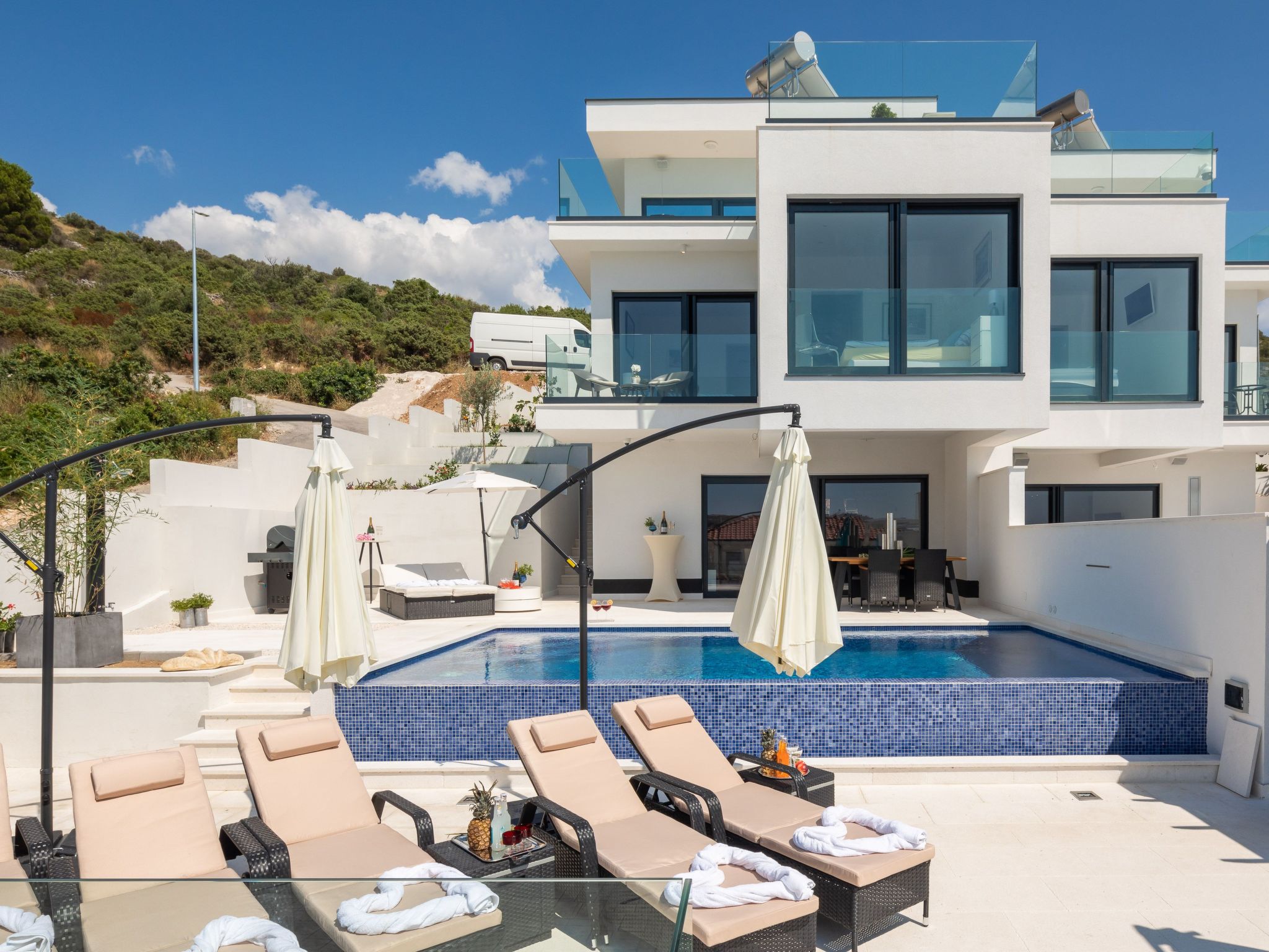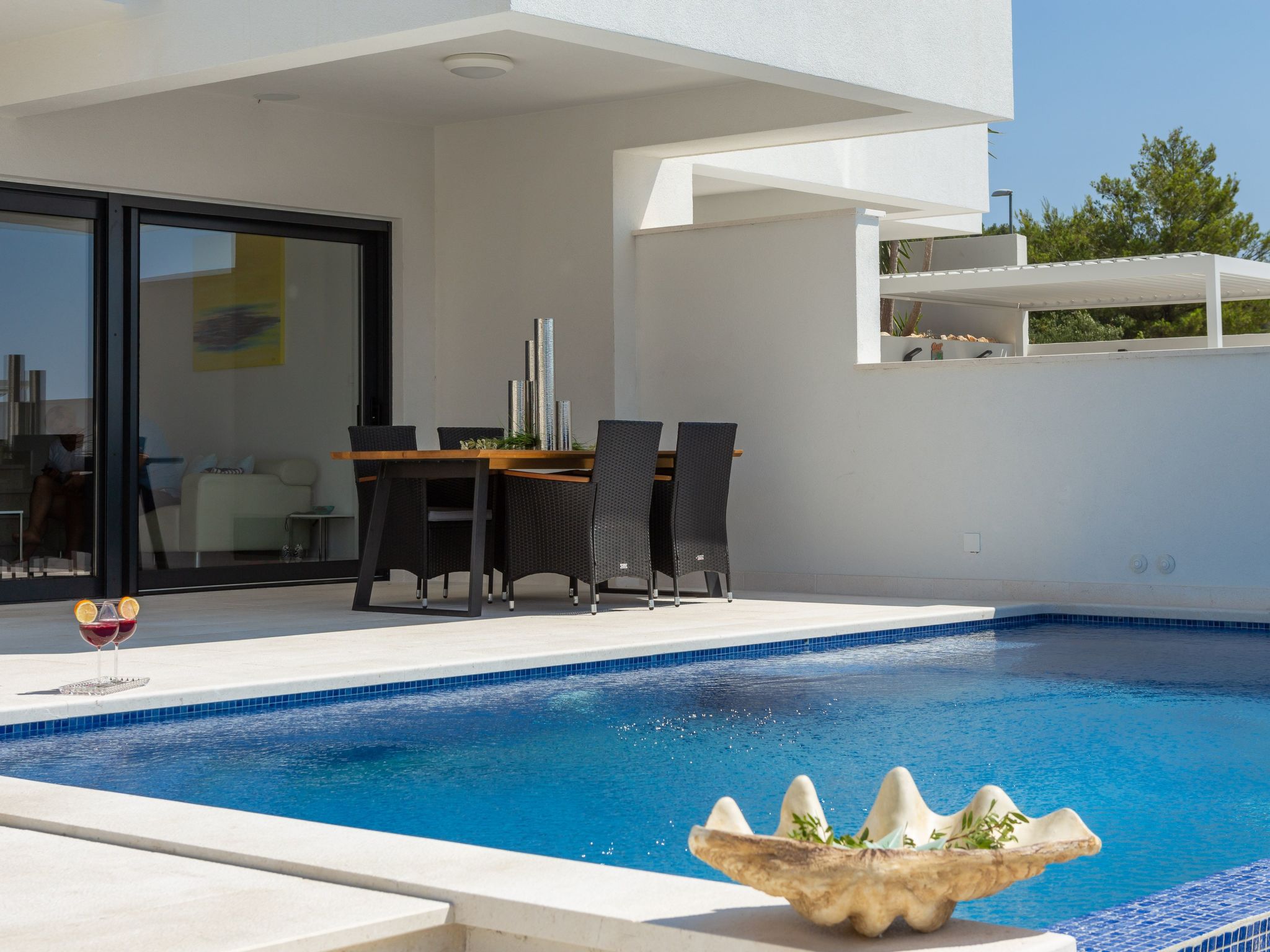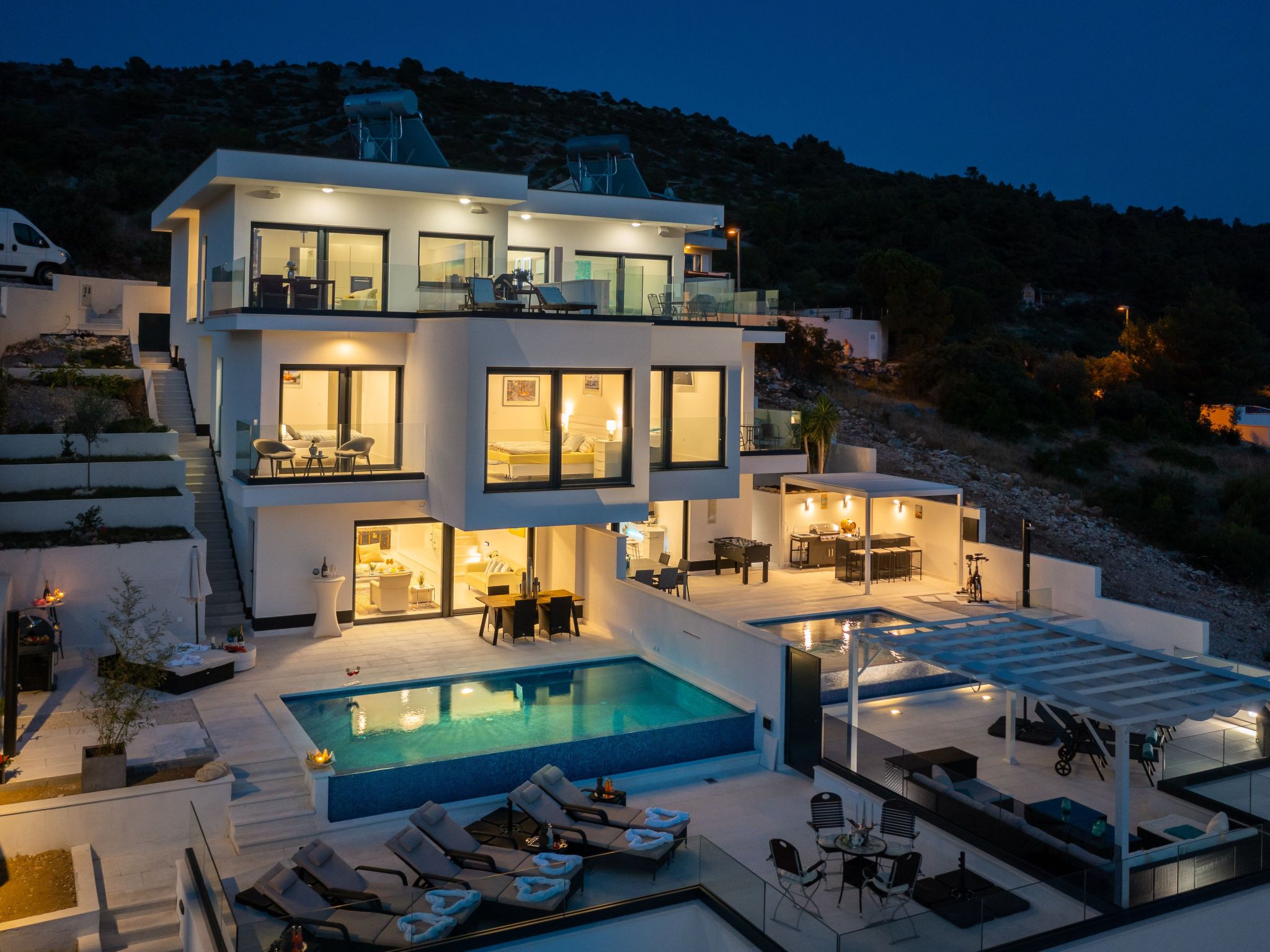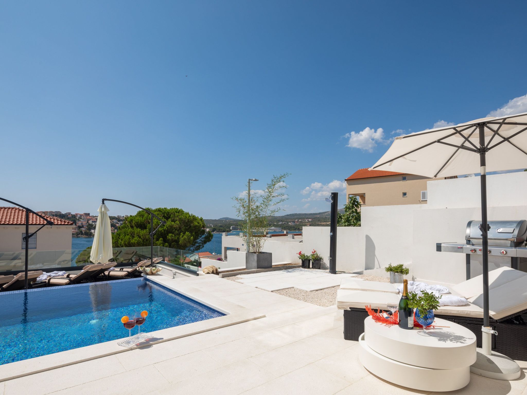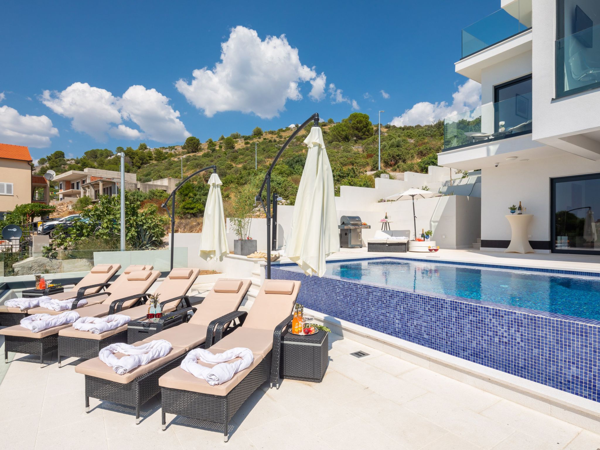 The west-facing villa guarantees unforgettable sunsets. The pictures with the unique panorama are ideal for posting. All rooms are with sea view, balcony, terrace and smart TV. The towns of Primosten & Marina Frappa can be reached in a few minutes. In Rogoznica you will find many nice bars & restaurants on the new promenade. It is only about 80 metres from the villa to the beach & sea.Zatoglav is popular, many new, beautiful holiday homes. There is no need to worry about construction noise during the season, work on new houses is suspended until the end of September. There are many new houses in the neighbourhood, but also simple houses that are a little older.On the beach, which is about 80 metres from the house, there is always a place to sunbathe, even in the high season. Zatoglav is an absolutely quiet place, the road that leads to Zatoglav also ends here. So there is no through traffic. Rogoznica is just a few minutes away. There are several supermarkets, banks, doctors and of course many restaurants offering fresh fish. For those who like to prepare their own fish, there is also a fish market offering the catch of the day. Several bakeries offer fresh bread every day and there is also a delivery service to the villas. The Marina Frappa harbour guarantees sophisticated boats and maritime flair. In addition to live music during the season, there are also culinary delights right on the harbour. The jetties are open and the boats can be used for souvenir photos.In Rogoznica you can hire all kinds of water sports, sailing boats and motorboats, jet skis and stand-up paddle boards. A highlight is the Dragon Eye near Marina Frappa, an archaeological phenomenon that takes us back thousands of years. You will be amazed. From Rogoznica it is only a few minutes' drive to Primosten. This small, picturesque town is the postcard motif par excellence. We particularly recommend the sunset and the live music during the season. A detour to the Nardin restaurant is absolutely worthwhile, super sushi and top wines await the guest. If you drive further north, towards Sebinik, the coast is always on the left and you can't help but be amazed. Many beautiful restaurants, secluded beaches. After about 30 minutes you reach Sibenik, this old harbour town with its fortifications has an extremely attractive old town where the evening life pulsates. Many new restaurants and chic bars have opened in recent years and offer a really attractive programme.The villa was built in a modern style, all rooms are west-facing and there are stunning sea views from every bedroom. The rooms are all brightly decorated and furnished in a modern maritime style. Each bedroom has a Smart TV with internet access and the ability to watch Netflix, Prime, etc. The living room has a 65-inch screen and a Marshall jukebox that can be used to control Bluetooth and other sources. A total of 220 square metres of living space is available. The large living room with integrated dining room and designer kitchen guarantee pleasant evenings. All modern cooking facilities are available and invite you to enjoy.In the outdoor area there is a large dining table and sun loungers for 8 people, the sun loungers have storage tables with a cooling compartment. A large gas barbecue turns the barbecue party into a leisure highlight.Rogoznica, about 3 km away, is one of the most beautiful marinas in Croatia. There are bathing facilities everywhere, gravel, concrete, some even with sand. The Dragon eye is one of the attractions in Rogoznica. Primosten about 10 km away is a popular excursion destination with a unique backdrop, this island town is a must for every holidaymaker. Trogir is about 20 minutes away and is highly recommended with its cosy old town. The rest of the fortress can be admired, but there is also a beautiful waterfront promenade with moorings for luxury yachts. The largest city in the region, Split, is about 45 minutes away. Nightlife, culture, shopping malls, the airport, everything is available here