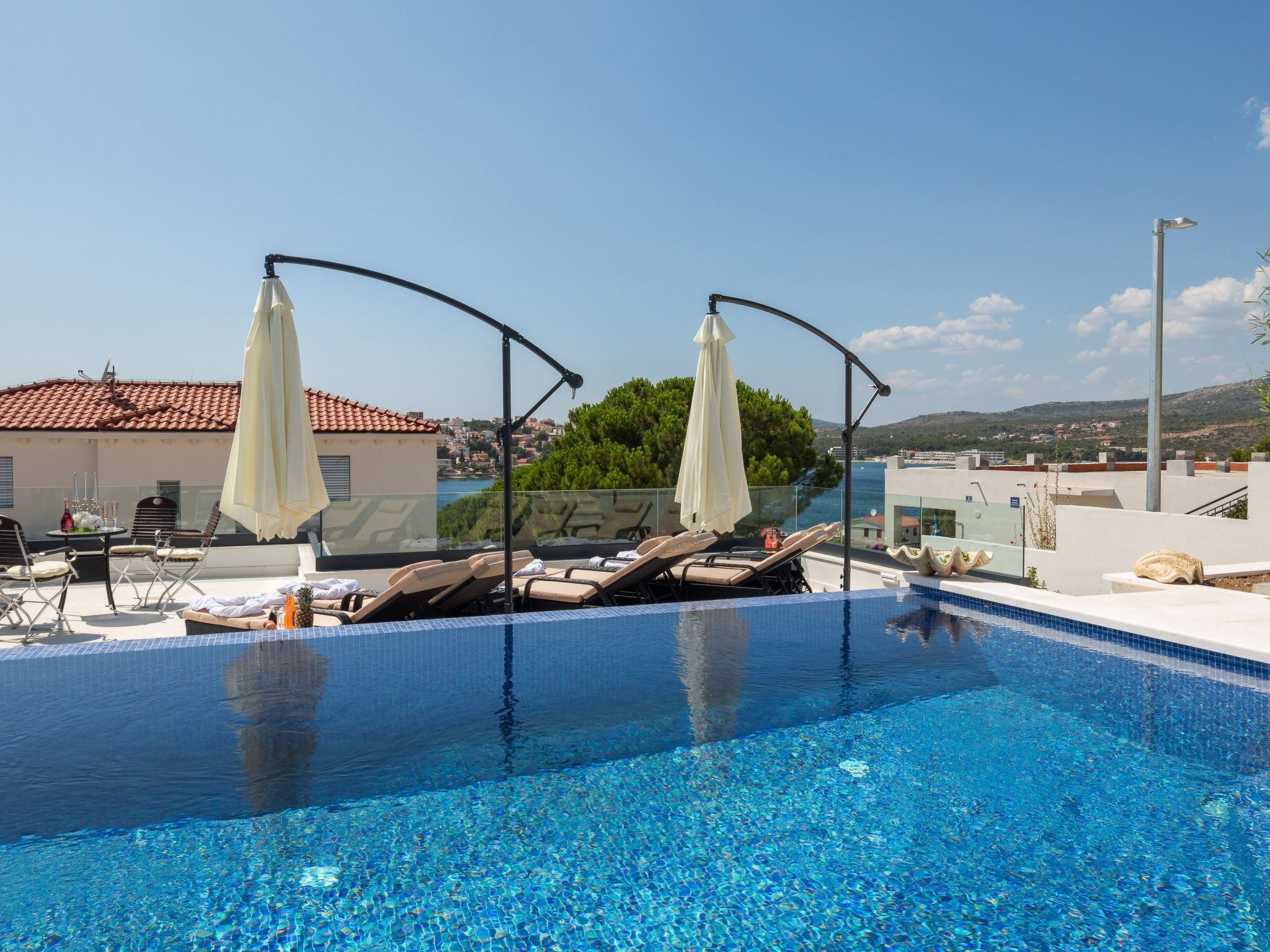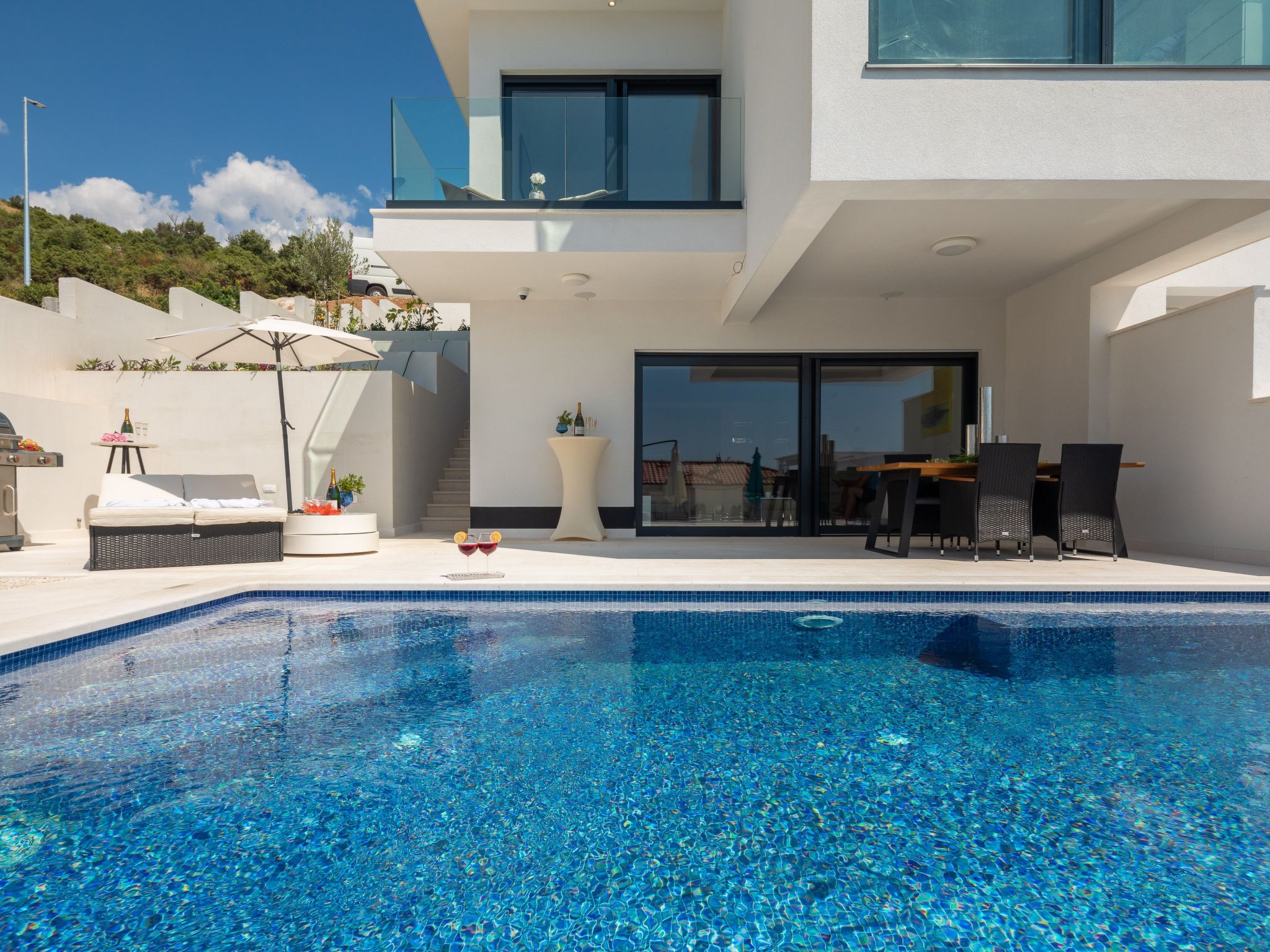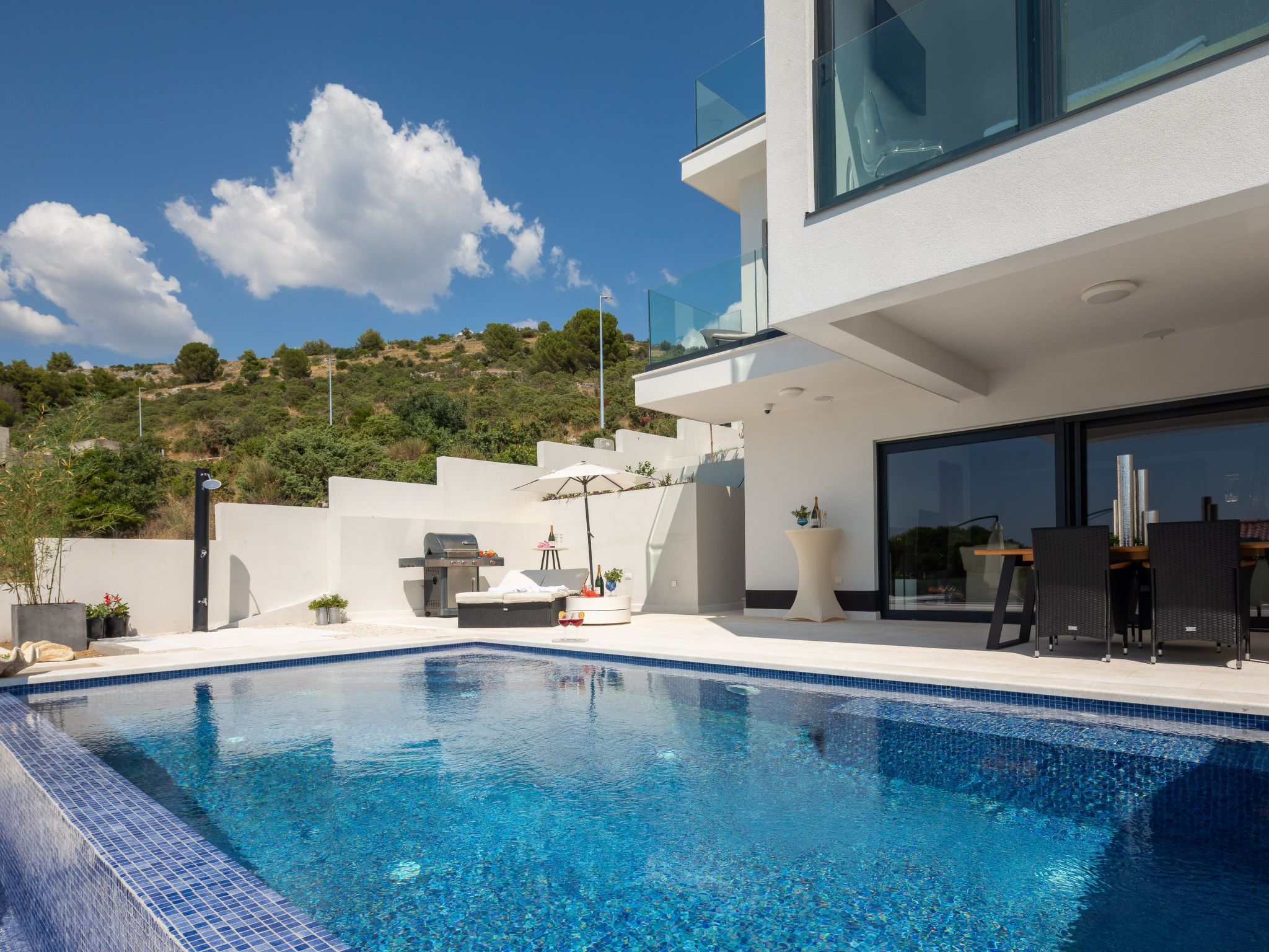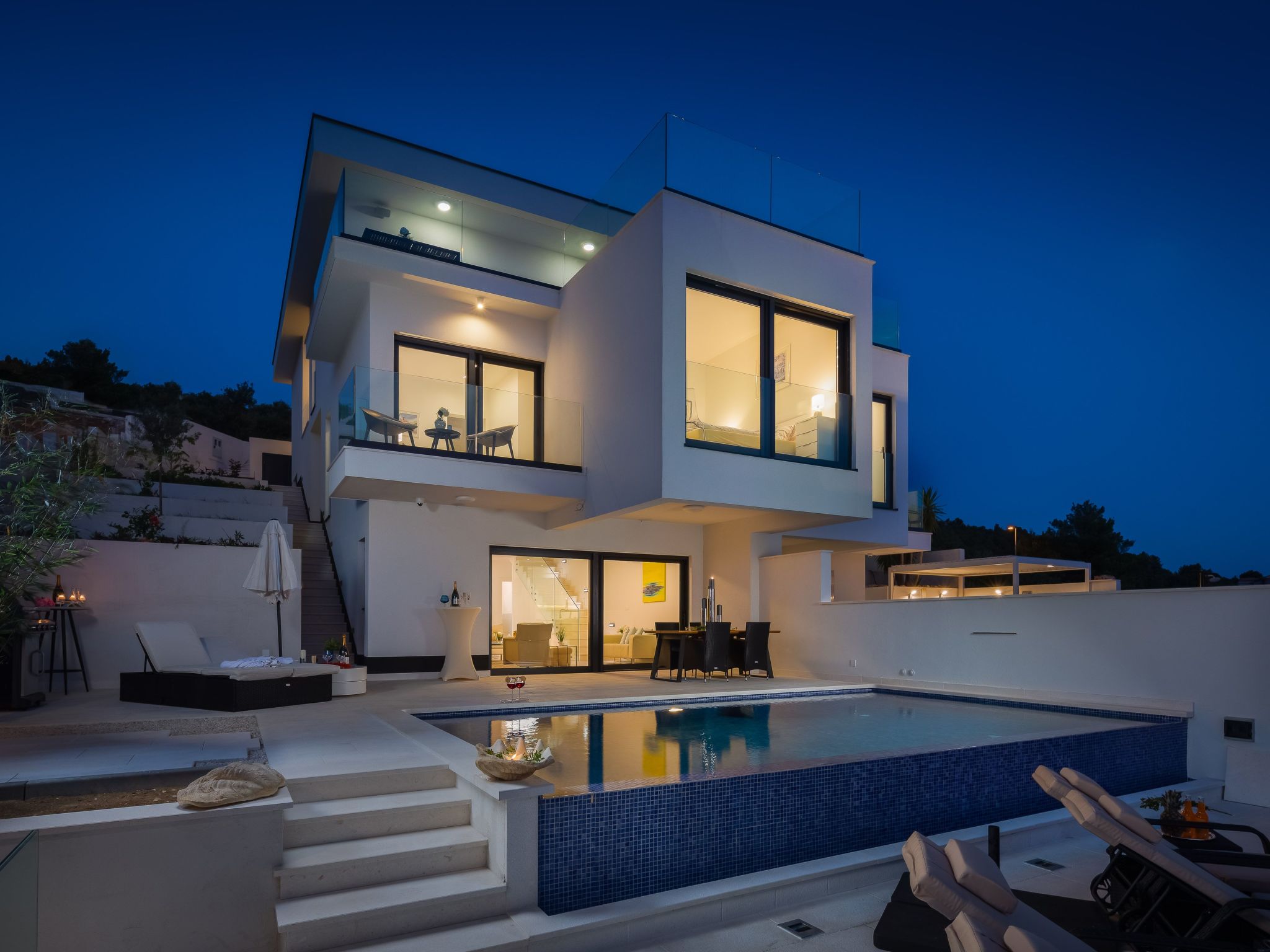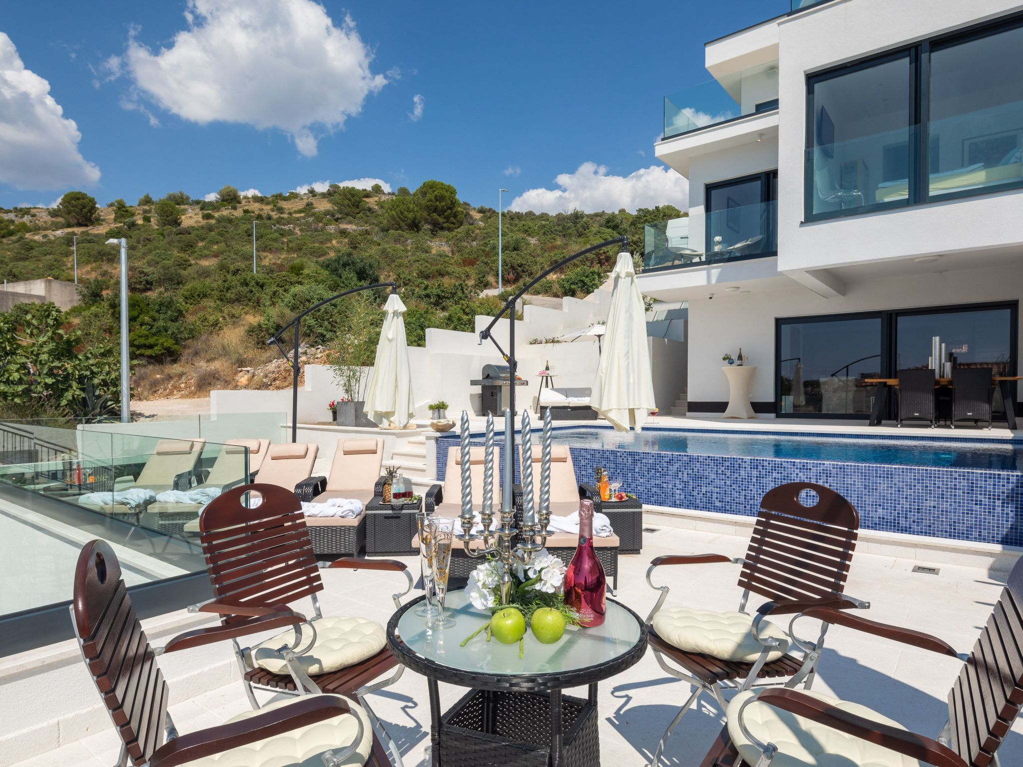 The west-facing villa guarantees unforgettable sunsets. The pictures with the unique panorama are ideal for posting. All rooms are with sea view, balcony, terrace and smart TV. The towns of Primosten & Marina Frappa can be reached in a few minutes. In Rogoznica you will find many nice bars & restaurants on the new promenade. It is only about 80 metres from the villa to the beach & sea.Zatoglav is popular, many new, beautiful holiday homes. There is no need to worry about construction noise during the season, work on new houses is suspended until the end of September. There are many new houses in the neighbourhood, but also simple houses that are a little older.On the beach, which is about 80 metres from the house, there is always a place to sunbathe, even in the high season. Zatoglav is an absolutely quiet place, the road that leads to Zatoglav also ends here. So there is no through traffic. Rogoznica is just a few minutes away. There are several supermarkets, banks, doctors and of course many restaurants offering fresh fish. For those who like to prepare their own fish, there is also a fish market offering the catch of the day. Several bakeries offer fresh bread every day and there is also a delivery service to the villas. The Marina Frappa harbour guarantees sophisticated boats and maritime flair. In addition to live music during the season, there are also culinary delights right on the harbour. The jetties are open and the boats can be used for souvenir photos.In Rogoznica you can hire all kinds of water sports, sailing boats and motorboats, jet skis and stand-up paddle boards. A highlight is the Dragon Eye near Marina Frappa, an archaeological phenomenon that takes us back thousands of years. You will be amazed. From Rogoznica it is only a few minutes' drive to Primosten. This small, picturesque town is the postcard motif par excellence. We particularly recommend the sunset and the live music during the season. A detour to the Nardin restaurant is absolutely worthwhile, super sushi and top wines await the guest. If you drive further north, towards Sebinik, the coast is always on the left and you can't help but be amazed. Many beautiful restaurants, secluded beaches. After about 30 minutes you reach Sibenik, this old harbour town with its fortifications has an extremely attractive old town where the evening life pulsates. Many new restaurants and chic bars have opened in recent years and offer a really attractive programme.The villa was built in a modern style, all rooms are west-facing and there are stunning sea views from every bedroom. The rooms are all brightly decorated and furnished in a modern maritime style. Each bedroom has a Smart TV with internet access and the ability to watch Netflix, Prime, etc. The living room has a 65-inch screen and a Marshall jukebox that can be used to control Bluetooth and other sources. A total of 220 square metres of living space is available. The large living room with integrated dining room and designer kitchen guarantee pleasant evenings. All modern cooking facilities are available and invite you to enjoy.In the outdoor area there is a large dining table and sun loungers for 8 people, the sun loungers have storage tables with a cooling compartment. A large gas barbecue turns the barbecue party into a leisure highlight.Rogoznica, about 3 km away, is one of the most beautiful marinas in Croatia. There are bathing facilities everywhere, gravel, concrete, some even with sand. The Dragon eye is one of the attractions in Rogoznica. Primosten about 10 km away is a popular excursion destination with a unique backdrop, this island town is a must for every holidaymaker. Trogir is about 20 minutes away and is highly recommended with its cosy old town. The rest of the fortress can be admired, but there is also a beautiful waterfront promenade with moorings for luxury yachts. The largest city in the region, Split, is about 45 minutes away. Nightlife, culture, shopping malls, the airport, everything is available here