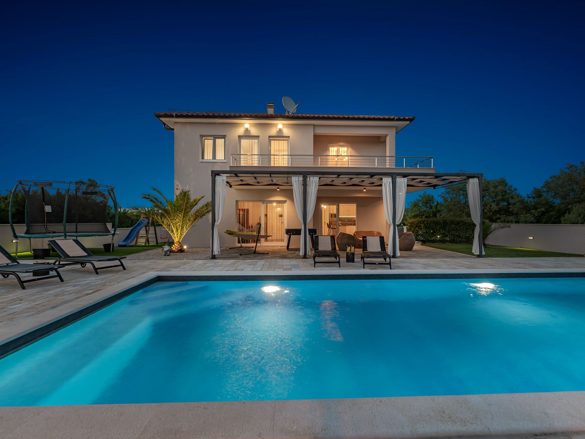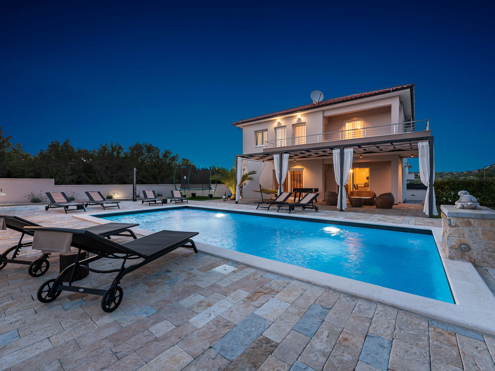 Discover a haven of serenity and comfort at this holiday house located in the picturesque setting of Donja Jagodnja, Dalmatia. Ideal for accommodating up to 8 guests, this detached house promises an unforgettable retreat with its blend of convenience, relaxation, and entertainment options. Whether you're seeking a peaceful getaway with family or friends, this property caters to all your holiday needs.Inside, the house is thoughtfully equipped to ensure a comfortable stay. Air conditioning in select areas, coupled with underfloor heating in parts, ensures the indoor climate is always to your liking, regardless of the season. Practical amenities such as a washing machine and clothes dryer for exclusive use add to the convenience, making it easy to keep up with laundry needs during your stay. The inclusion of a coffee machine, dishwasher, electric kettle, and fireplace enhance both the functionality and coziness of the home, providing everything necessary for a seamless and enjoyable vacation.The exterior space of this holiday house is equally inviting. The private garden is a serene backdrop for mornings filled with leisurely breakfasts or evenings of relaxation. The highlight, without doubt, is the swimming pool, reserved solely for your use, perfect for refreshing dips or lounging under the sun. Furthermore, the property boasts facilities that cater to a variety of interests; from a trampoline and children's playground ensuring young ones are entertained, to a table tennis setup for spirited games among friends or family.Situated in Donja Jagodnja, this holiday house places you in the heart of Dalmatia, with the beach and sea only 8000m away, inviting for days spent basking in the sun or exploring coastal delights. Even closer, the nearest town center lies just 1500m from your doorstep, making it convenient to explore local culture, cuisine, and shopping. For everyday needs, a grocery store can be found a mere 200m away, adding an extra layer of ease to your stay.In conclusion, this holiday house in Donja Jagodnja offers an unparalleled opportunity to immerse yourself in the beauty of Dalmatia while enjoying the privacy and comfort of a well-appointed home. With its thoughtful amenities, captivating surroundings, and proximity to local attractions, it's the perfect setting for creating lasting memories with your loved ones.
