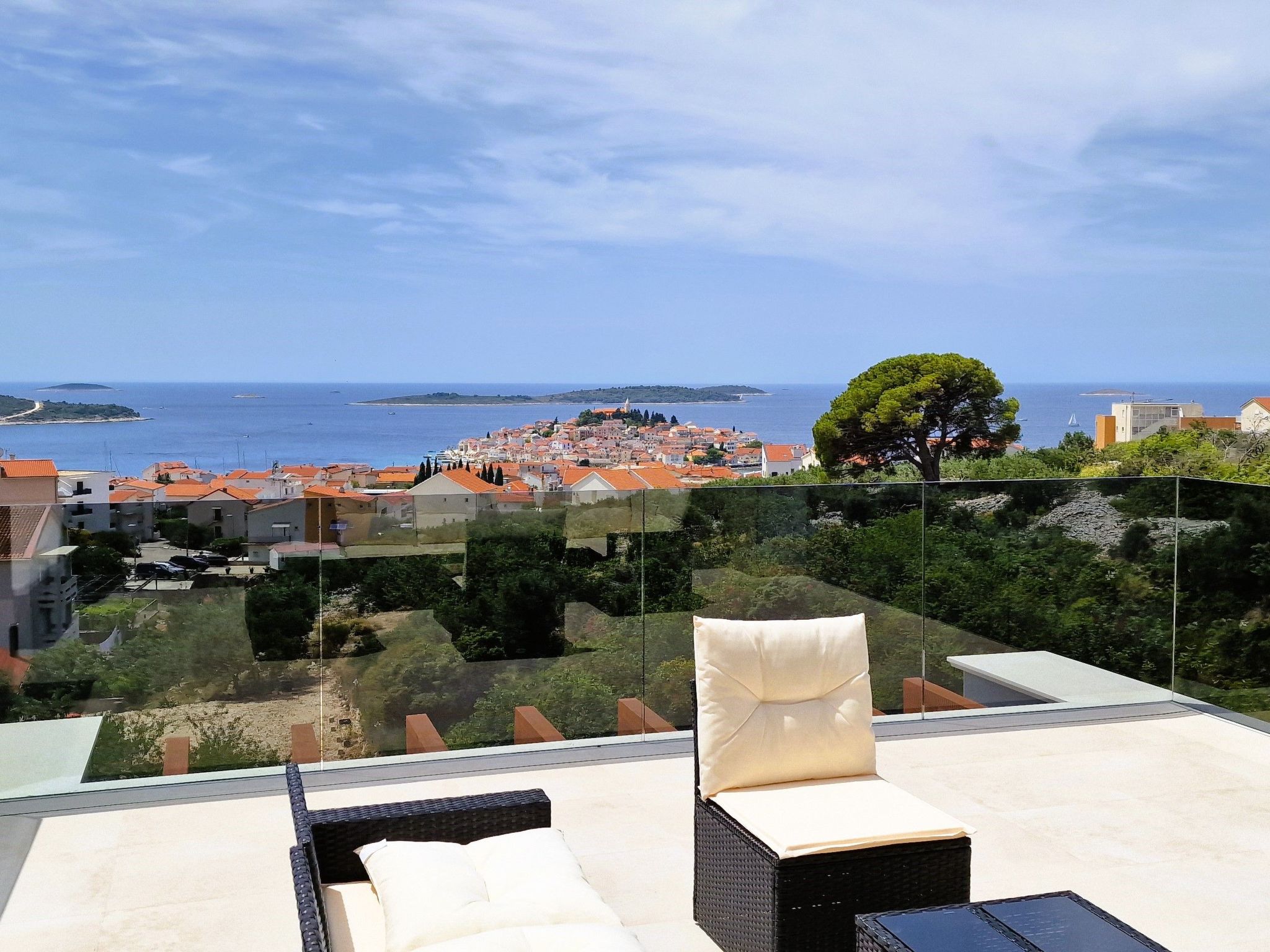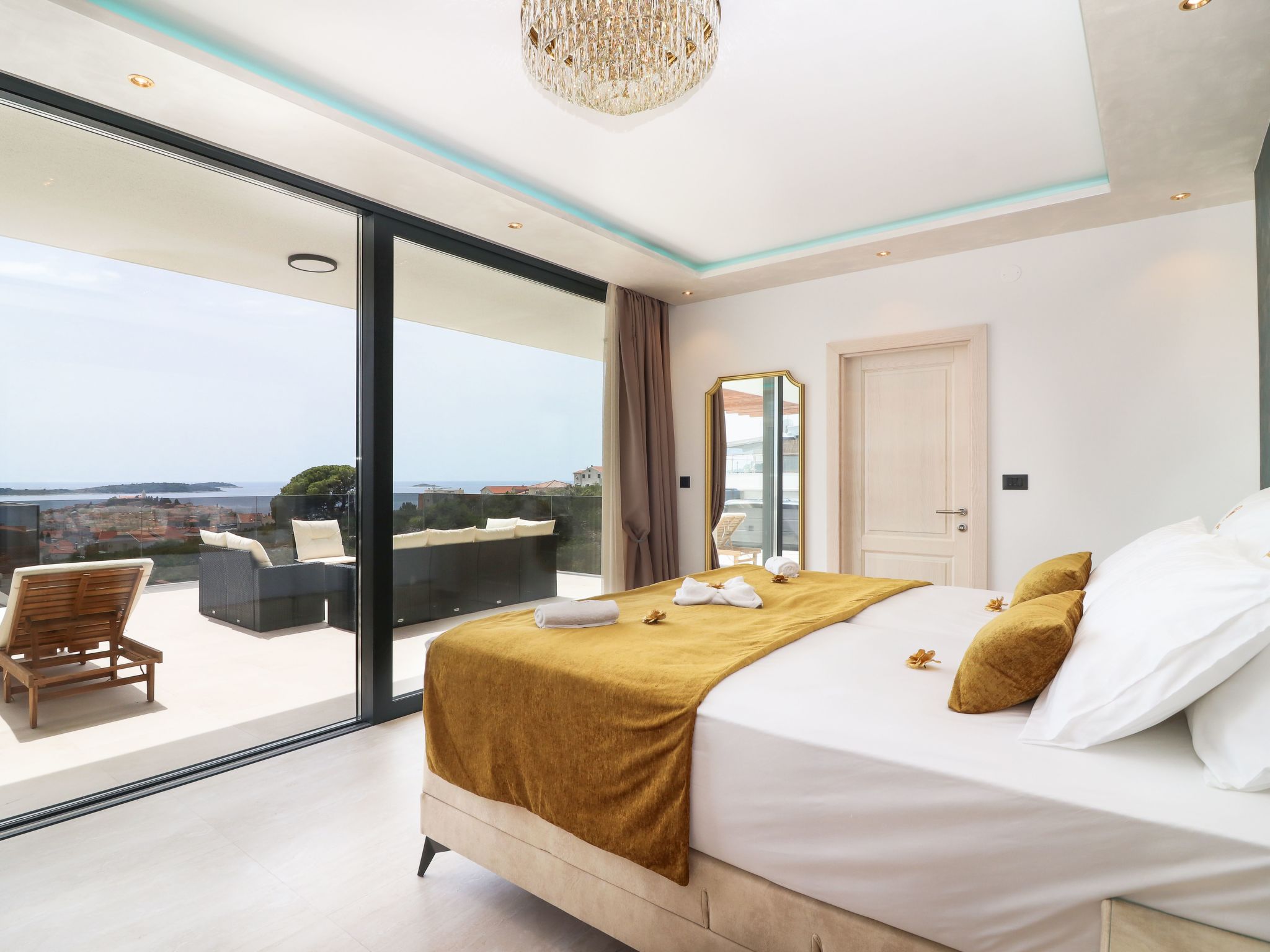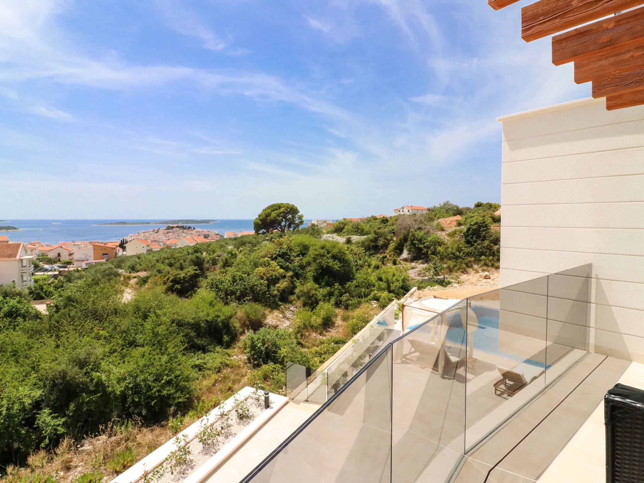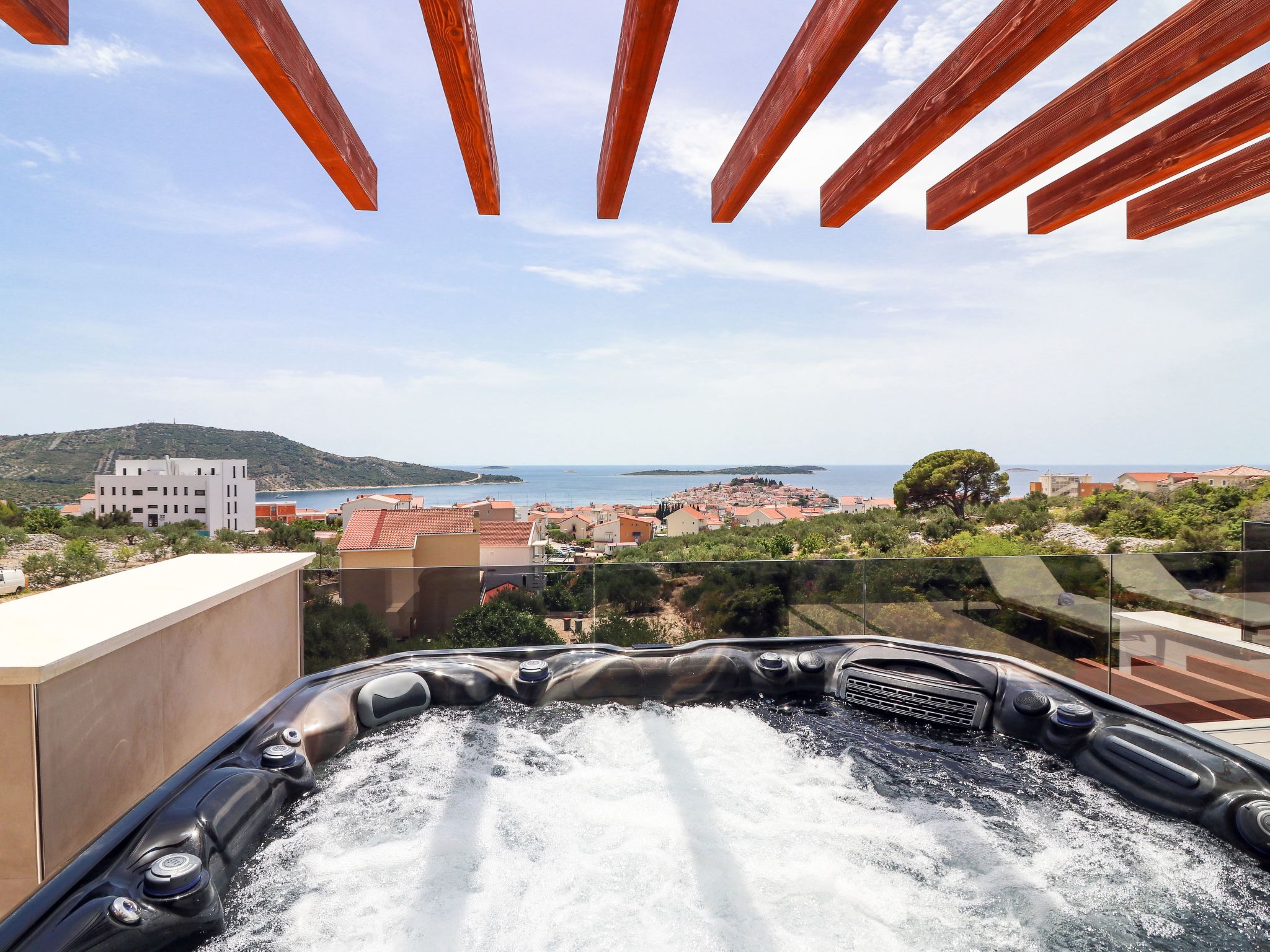 Villa Golden Lion is a luxurious property located in Primošten, a small Mediterranean jewel of central Dalmatia, and offering complete comfort. Within the house there is a heated infinity pool of 75 m2 with counter-current swimming, a fully equipped private gym of 80 m2, a sauna, a bubbelbad, four bedrooms with their own bathrooms, each of which has a view of the sea, a modern and fully equipped kitchen, and spacious, lighted living room with a touch of elegance. The house has underfloor heating, all rooms are air-conditioned, which guarantees optimal comfort. It offers a fantastic panoramic view of the sea and Primošten that takes your breath away.This facility will offer you maximum comfort and enable quality rest and relaxation.Our interests are to provide our guests optimal comfort and quality that will make their vacation a complete pleasure. As hosts, we look forward to the cooperation and hospitality of our future guests. We are available to our guests for all possible inquiries and requests, which we will try to fulfill as soon as possible. With many years of experience in renting, we can provide useful information, guide guests to local attractions, good restaurants and locations that might be interesting to visit.The facility is located near the center of Primošten, approx. 600 m from the main beach. It is located in a neighborhood that consists mostly of newly built residential buildings and has a good connection with the place. In just a few minutes on foot, you can reach the town center, all shops, restaurants, cafes and one of the most beautiful beaches in the heart of Dalmatia.