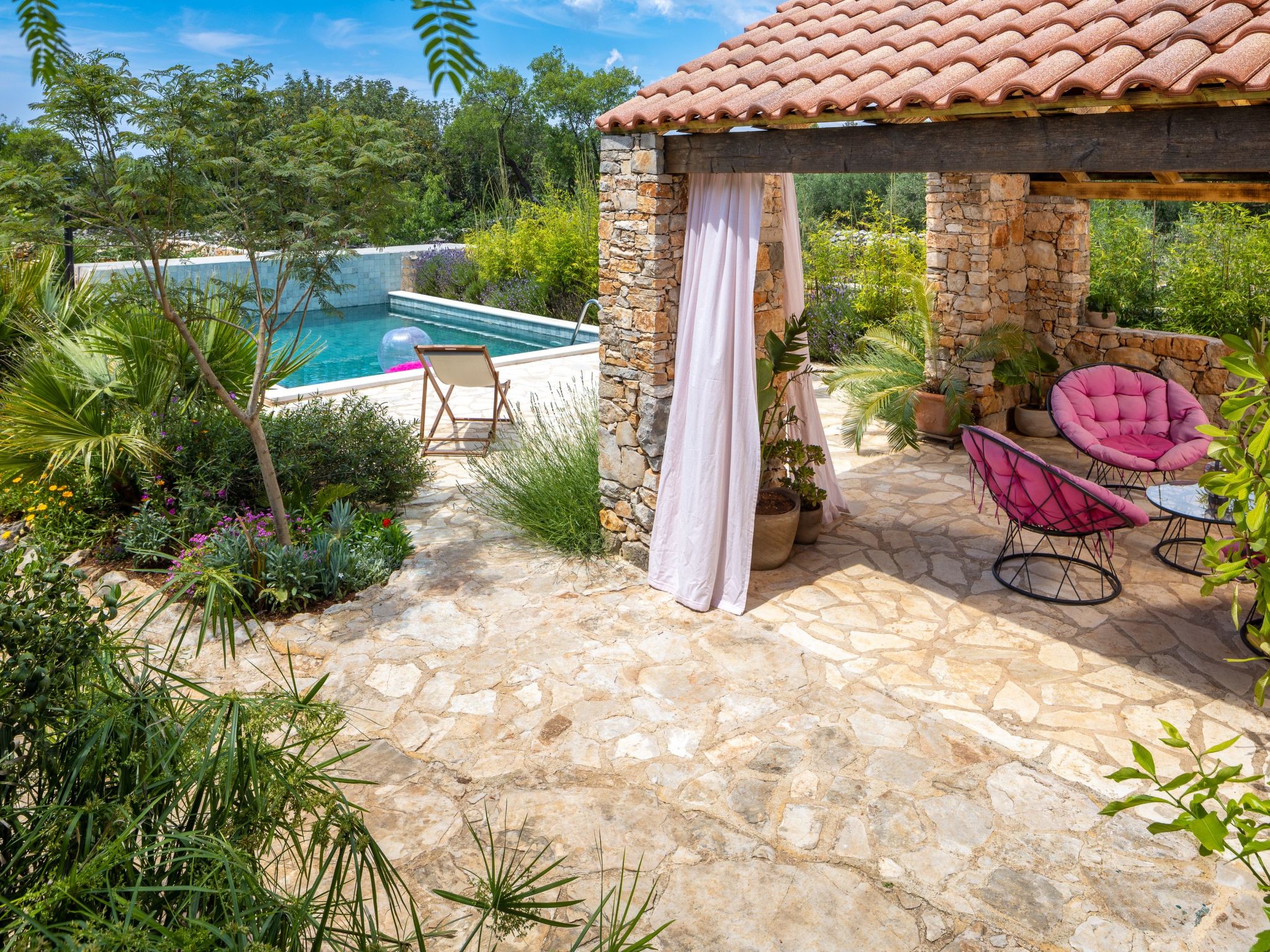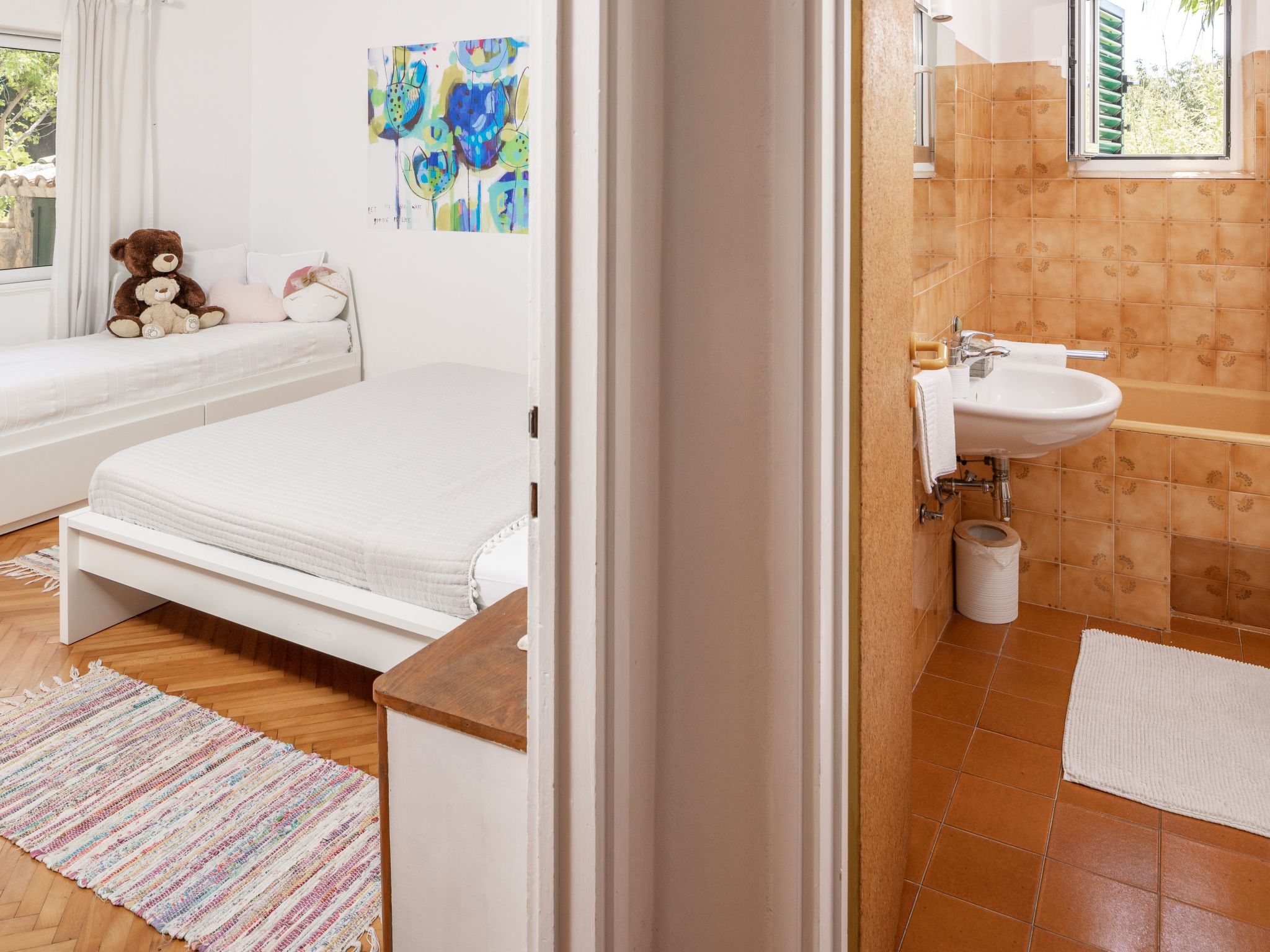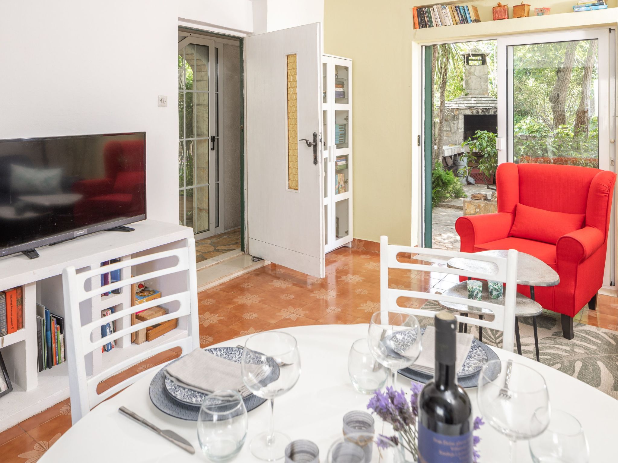 This romantic stone cottage is located in the small village of Rudina, said to be one of the last well-kept secrets on the island of Hvar in the sunny southern Adriatic sea, a perfect seaside retreat for a group of friends or a family looking for a relaxing holiday far away from the tourist crowds.Modern furnished stone cottage close to the sea, newly built and designed to the authentic Dalmatian style with a traditional stone grill in the large fully enclosed leafy gardensThe cottage was newly built in 1970. It is spread over two floors and boasts a spacious living-/dining area, separate fully fitted kitchen, three bedrooms and two bathrooms. The ground floor hosts the living area which is furnished with a stylish cream coloured sofa, a coffee table, television set, DVD player, HiFi system and a dining table with chairs. The kitchen offers a dishwasher, four hob gas cooker with extractor hood, oven, fridge complete with freezer compartment, microwave, a coffee machine and an electric kettle. One of the three bedrooms is also on the ground floor and is furnished with a 160 cm x 200 cm double bed. A wide staircase leads to the upper floor where you will find the second bedroom with a 160 cm x 200 cm double bed and the third bedroom also with a 160 cm x 200 cm double bed. All three bedrooms are equipped with spacious wardrobes offering plenty of storage space for your clothes and luggage. Upon request, an extra bed for a baby can be made available. One of the two bathrooms (the ground floor benefits from one and there also is one on the first floor) has a bath tub with a shower device and the other has a shower cabin, and both bathrooms are equipped with a wash basin, wall mirror and a toilet. Reliable WLAN internet access is offered in the cottage free of charge.The large glass sliding doors in the living room open directly onto the leafy inner courtyard with an extra large traditional stone grill. A generous glass dining table with chairs and sun loungers invite you to enjoy some long barbecue evenings under the starlit sky. The stone cottage is embedded in 500 m² of carefully planted gardens surrounded by a rustic stone wall. Retire with a good book under the shade providing trees and leave all your worries behind.Your holiday cottage is located only approximately 700 m away from the beach, right in front of the cottage you will find a pathway that leads through the pine woods straight to the crystal clear waters of Zukova bay. The coastal town of Stari Grad is only approximately 2 km away from your cottage and offers good shopping facilities and a wide range of cafes and restaurants.
