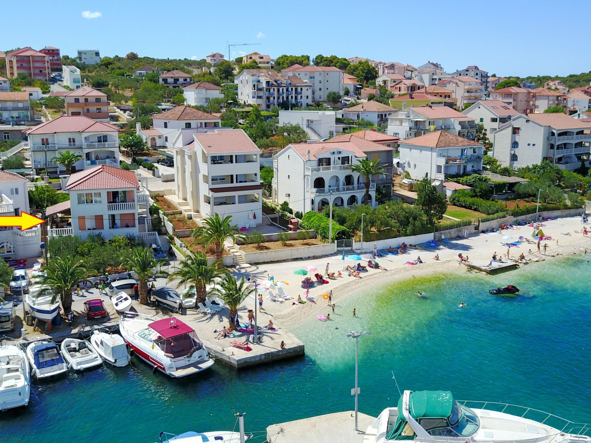 Groot en ruim strand met lange kust, redelijk schone zee en voorzieningen langs de kust. Stranden met kleine kiezels en een geleidelijke toegang tot het water. Prachtig helder water. Niet ver van de historische stad Trogir. Goede faciliteiten in de vorm van restaurants, bars, etc.