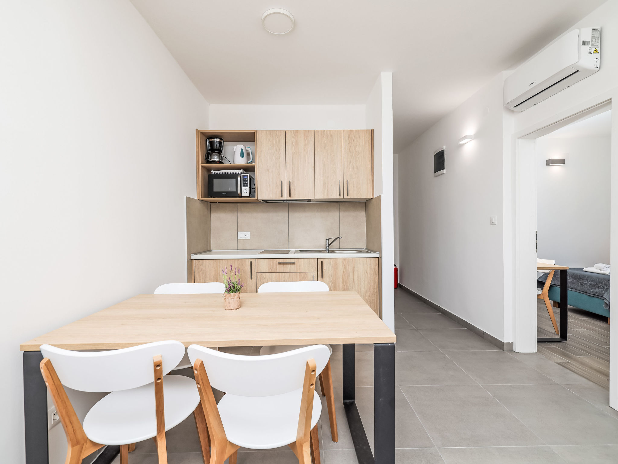 Vakantiecomplex "Medena". In de wijk Seget Donji, 3 km van het centrum van Trogir, 30 km van het centrum van Split, direct aan zee, direct aan het strand. Voor medegebruik: terrein met planten en bomen, 3 zwembaden (31 m2, 140 cm diepte, seizoensgebonden beschikbaarheid: 01.Apr. - 01.Nov.) met trap. Kinderzwembad, buitendouche, tennisbaan (extra), basketbal (extra), kinderspeelplaats. In het complex: receptie, restaurant, internetaansluiting, wasserette. Beschikbaar: fietsen (extra). Ontbijt volpension half pension op verzoek op aanvraag (extra). Luchthaventransfer (extra). Parkeerplaats (extra) op het terrein. Bushalte 650 m, kiezelstrand "Medena". Het objekt is geschikt voor 2 volwassenen + 2 kinderen. Vliegveld 8 km van het huis. De afgebeelde foto is slechts een voorbeeld. 1 slaapbank voor twee personen in de woon/eetkamer, deze is geschikt voor 2 kinderen tot 12 jaar oud.
