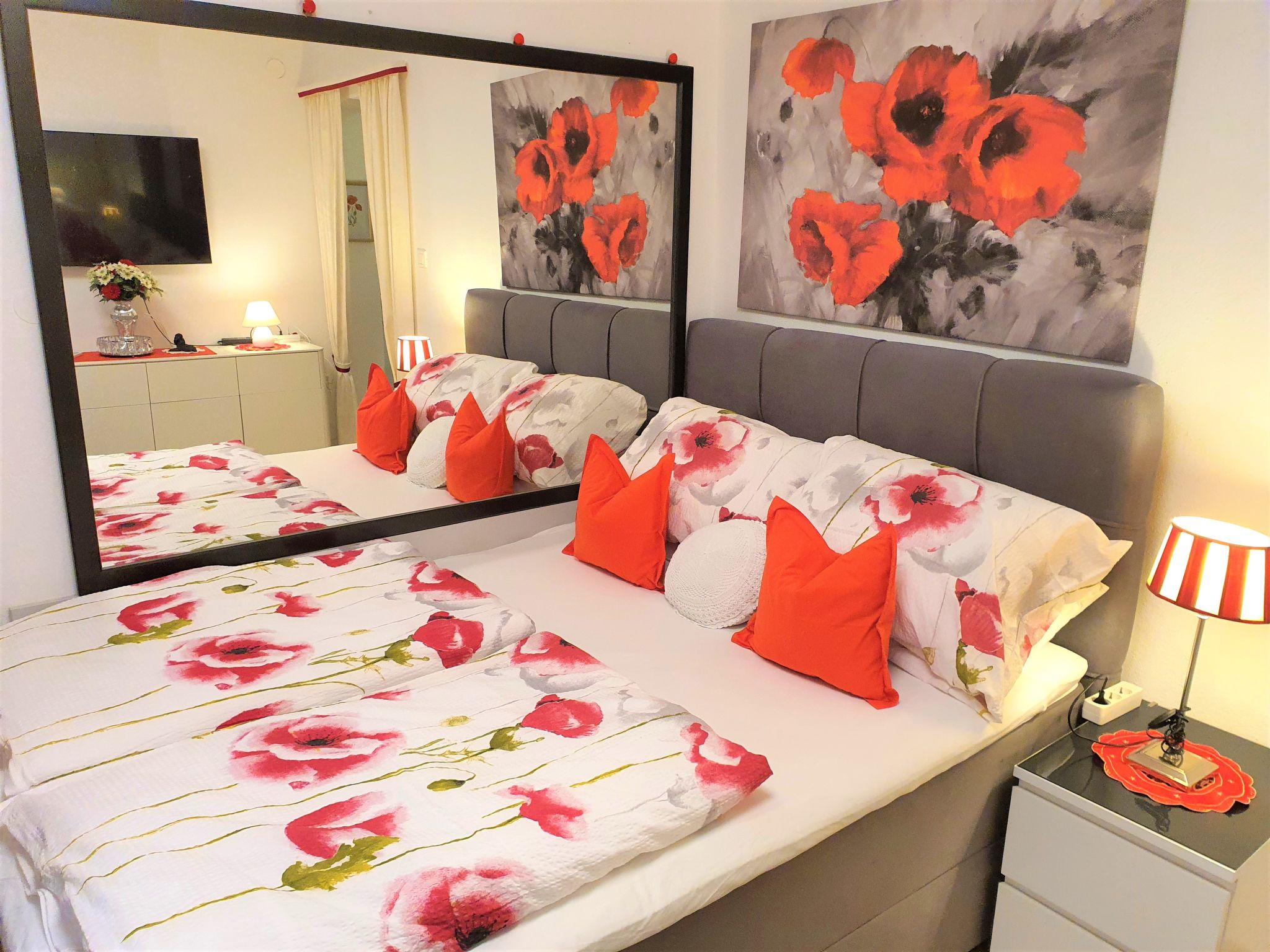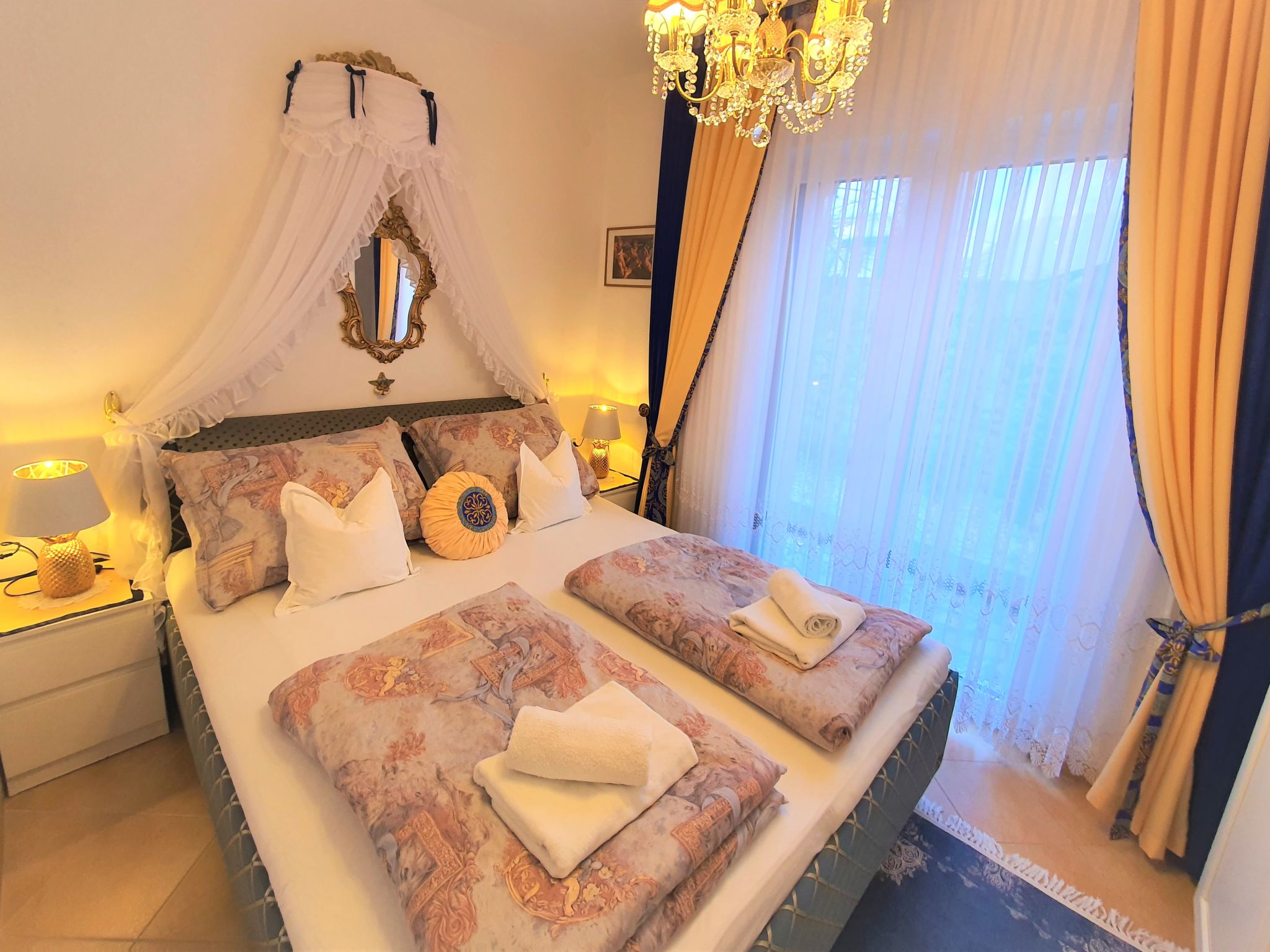 Appartement 2-kamers 39 m2, op de begane grond, op het westen gelegen. Mooi en gezellig ingericht: woon-/eetkamer met 1 2-pers divanbed (140 cm, lengte 200 cm), Sat-TV (Flatscreen TV), air-conditioning. 1 kamer met 1 2-pers bed (2 x 80 cm, lengte 200 cm). Uitgang naar het terras. Open keuken (afwasmachine, 4 keramische glas kookplaten, waterkoker, magnetron, diepvriezer, elektrische koffiemachine). Douche/bidet/WC. Terras 30 m2. Terrasmeubelen, barbecue. Ter beschikking: Internet (Internet (WiFi), gratis). Privé ingang.