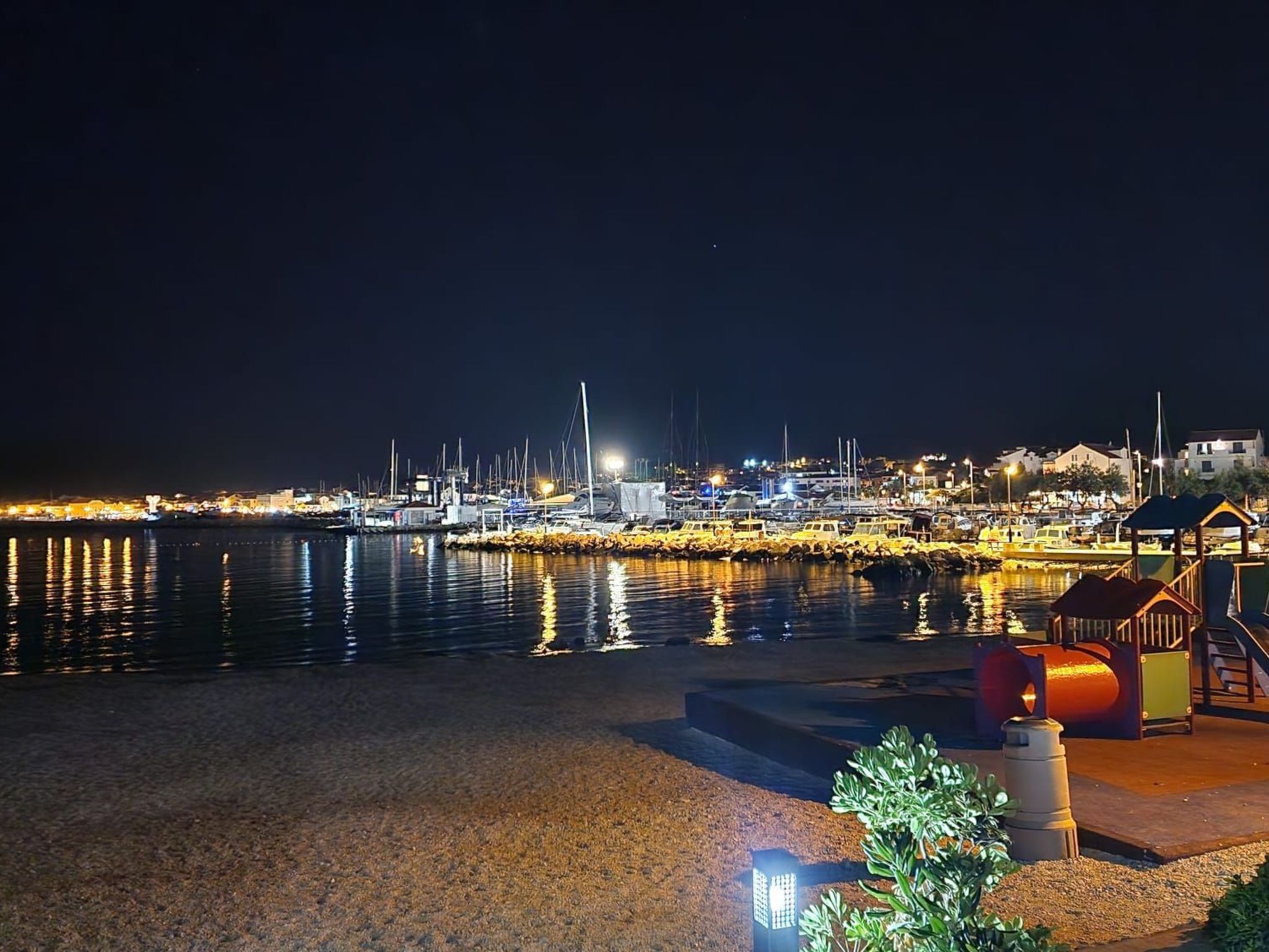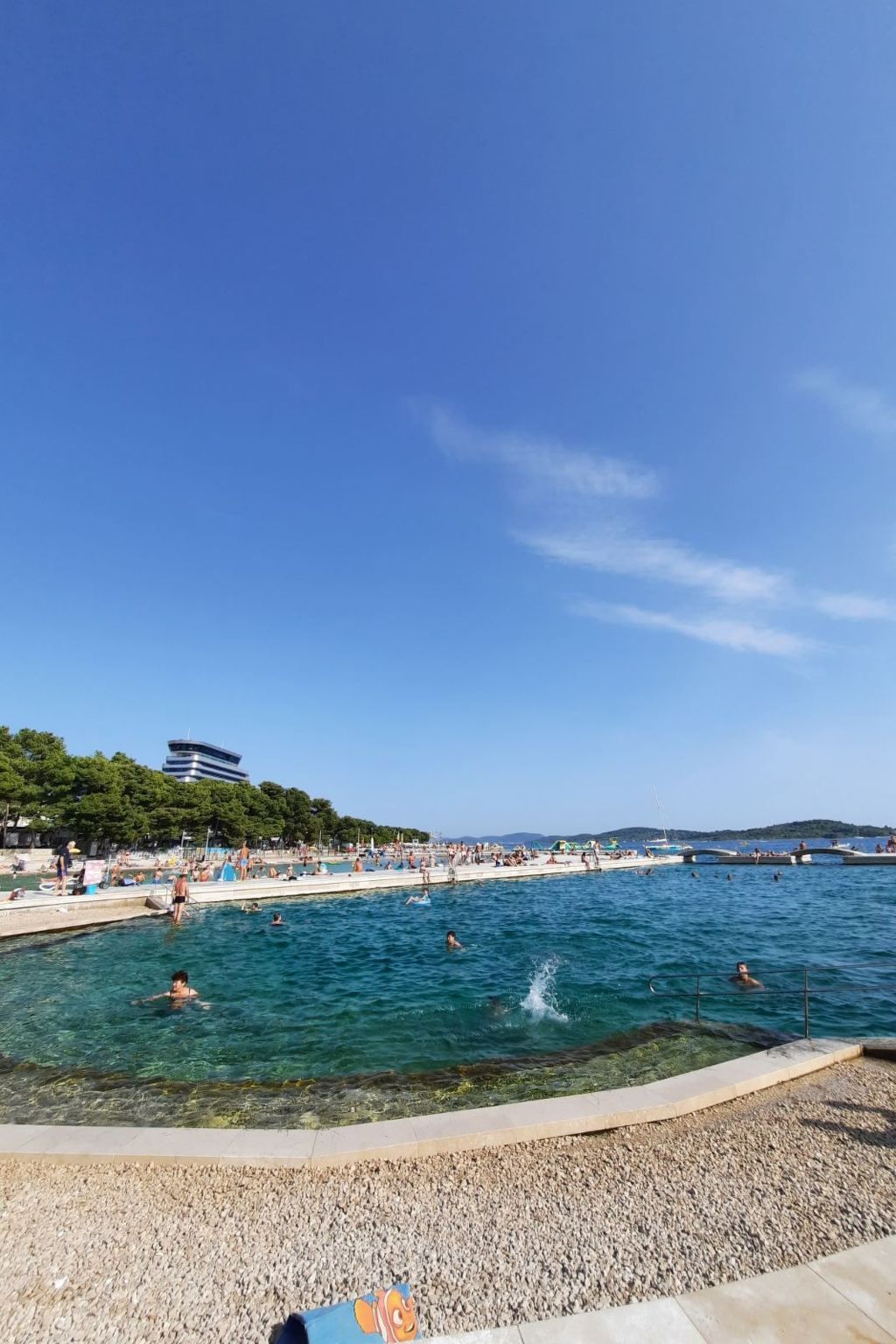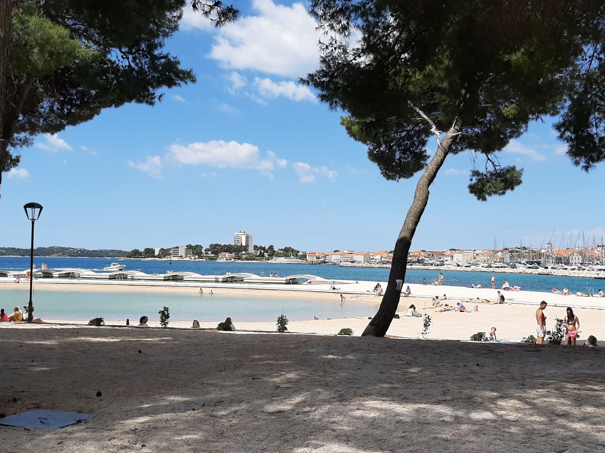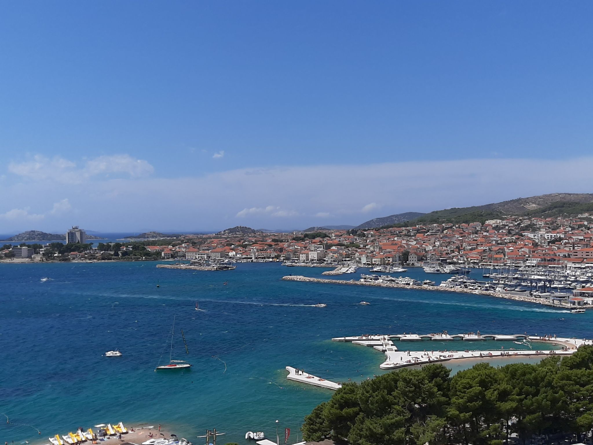 Uitstekend uitgerust strand met waterpark in Vodice. Gratis openbare douches en kleedhokjes. Verhuur van alles wat je maar kunt bedenken, om plezier te hebben aan zee (van waterfietsen tot kano's, tot parachutes getrokken door motorboten, tot bananen, enz.) en voor de kleintjes, maar niet alleen, enorme springkussens direct aan zee.