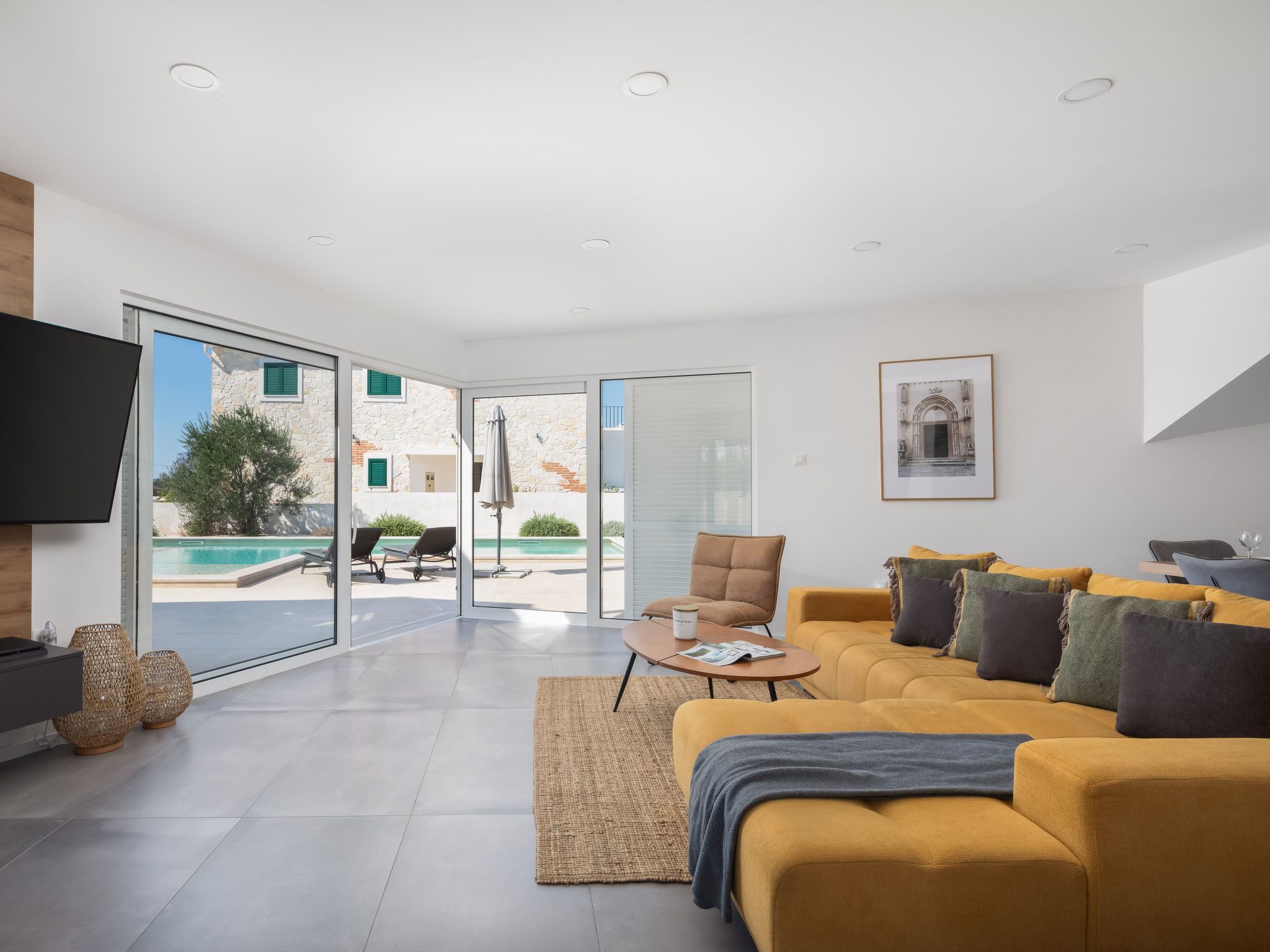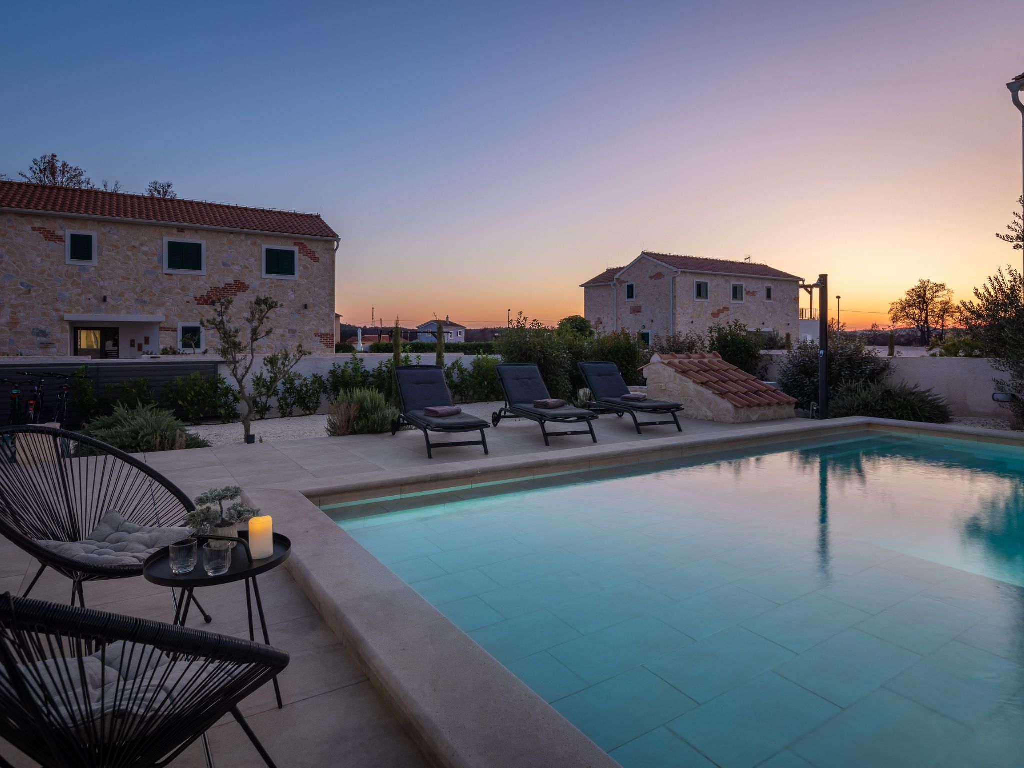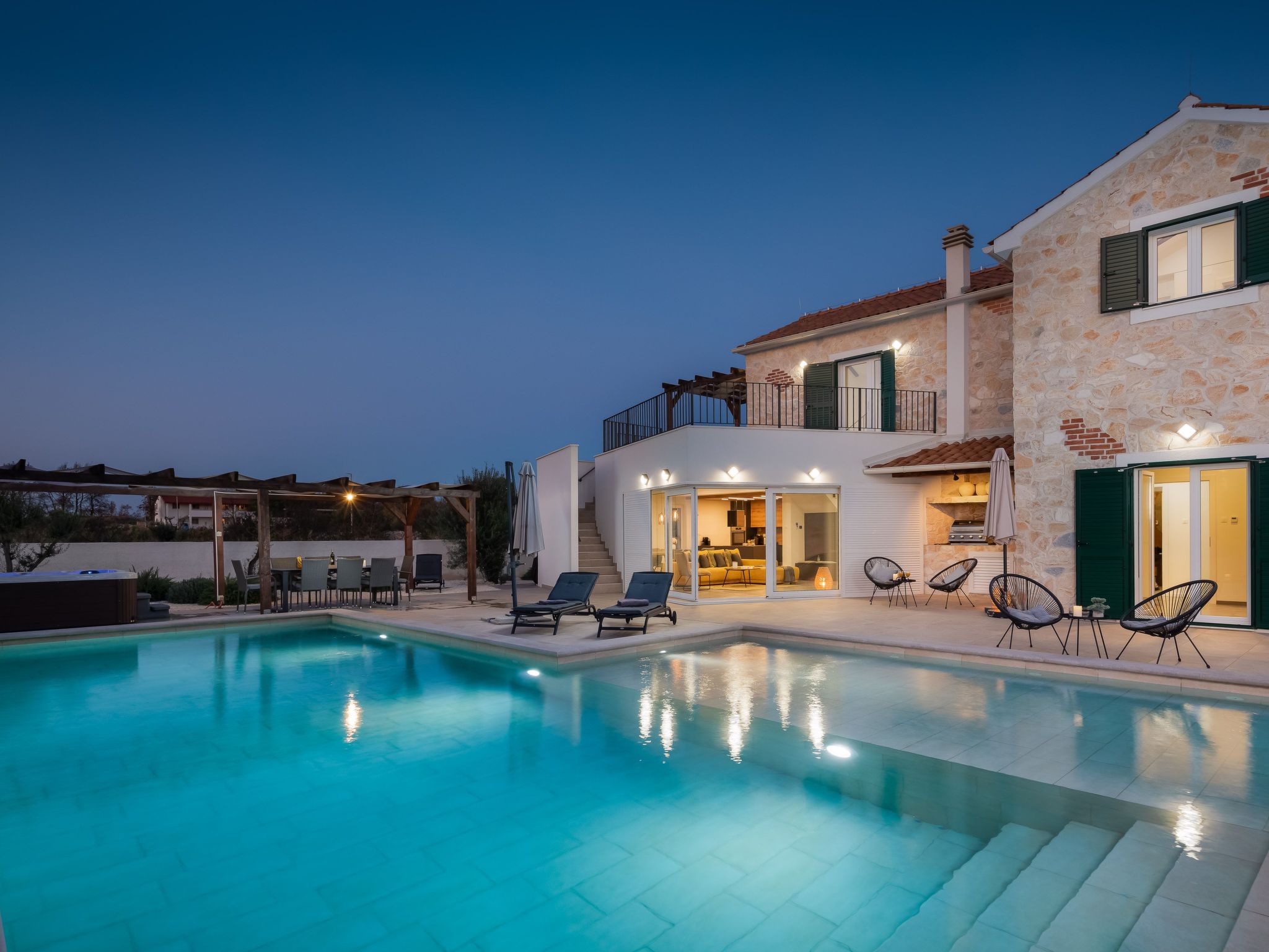 Discover the serene beauty of Zaton bei Sibenik, Dalmatien, with a stay at the exquisite Villa Vallis. Ideal for families or groups of up to 8 persons, this holiday house offers a perfect blend of comfort and style, ensuring a vacation experience like no other. Surrounded by the tranquil Dalmatian landscape, this property invites you to relax and rejuvenate in a setting that feels both luxurious and welcoming.Inside, Villa Vallis boasts meticulously designed living spaces equipped with all the modern amenities you could desire for a comfortable stay. Each of the four bedrooms is accompanied by its own bathroom, providing privacy and convenience for all guests. The house features air conditioning and underfloor heating throughout, ensuring a pleasant indoor climate regardless of the season. Additionally, practical amenities such as a washing machine, clothes dryer, dishwasher, coffee machine, and an electric kettle add to the convenience, making it easy to feel at home.The outdoor area of Villa Vallis is where this property truly shines. A meticulously landscaped garden for your sole use surrounds the house, offering a tranquil space for relaxation. The jewel in its crown is the stunning hot tub, inviting you to unwind under the starlit sky. A spacious terrace and a balcony extend the living space outdoors, perfect for soaking up the sun or enjoying al fresco meals prepared on the barbecue.Nestled in the picturesque region of Dalmatien, just 1500 meters from the nearest beach and 1000 meters from the closest grocery store, Villa Vallis's location combines convenience with the beauty of the Adriatic coast. The town of Vodice nearby pulsates with life, offering a vibrant mix of restaurants, cafes, and shops, alongside beautiful beaches and marinas, making every day of your stay an adventure waiting to happen.Villa Vallis is more than just a holiday house; it's a gateway to a unique vacation experience. Here, every detail is carefully crafted to ensure that your stay is not just comfortable, but genuinely memorable. Whether you're lounging by the hot tub, exploring the local scenery, or simply enjoying the peace of the garden, Villa Vallis is the perfect backdrop for an unforgettable holiday in Zaton bei Sibenik, Dalmatien.