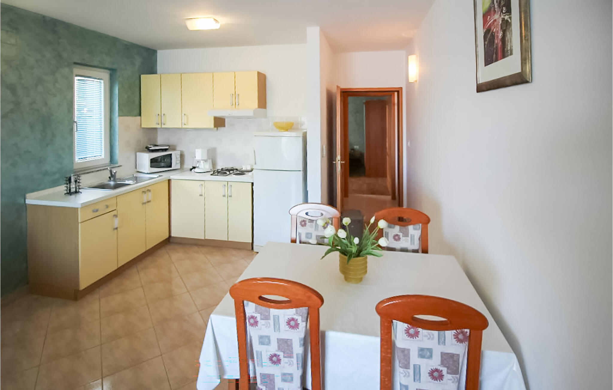 Kom binnen in de eetkeuken en doe alsof je thuis bent in de open, lichte kamer. Gebruik de functionele kitchenette om kleine maaltijden te bereiden en geniet ervan aan de eettafel met uitzicht naar buiten. Ontspan op de slaapbank, die prachtig opgaat in de woonkamer, en gebruik de tv voor een rustige avond.