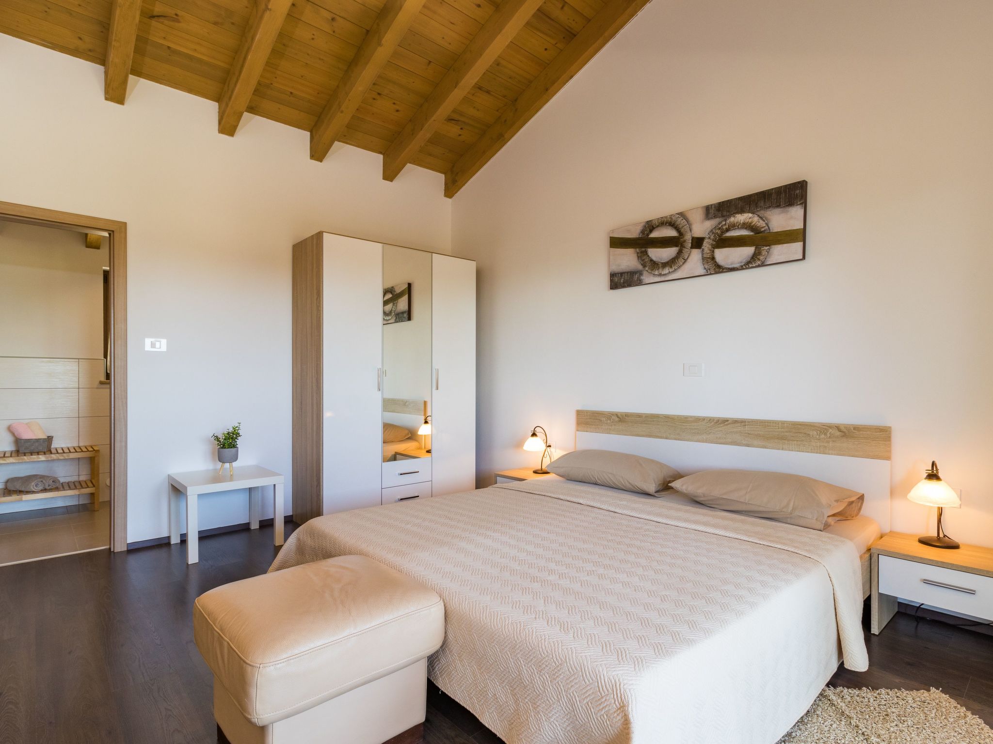It is situated in a small, quiet settlement called Jursici, ideally situated to explore the beautiful south of Istria. A market and a restaurant are only 900m away, the beautiful medieval towns Vodnjan and Svetvincenat are only 1o minutes away by car. The National Park Brijuni Islands with its beautiful beaches and bays is only 11 km away.The Villa Dija provides holiday-makers with comfort and cosiness in a trendy country style. It is in the little village of Brscici, just 5km from Vodnjan. Brscici is a quiet little village on a sunny hill and is ideal for a relaxing holiday. It can accommodate up to 6 + 2 persons. Villa Dija offers a pleasant holiday with your family or friends in peaceful countryside. At your disposal are 3 bedrooms, all with en-suite bathrooms, living room, dining area and a fully equipped kitchen.The living area has direct access to the outside covered dining area overlooking the refreshing pool and garden, offering a lovely space for family and friends to gather and enjoy common meals prepared on the BBQ. Villa Dija is completely air- conditioned, has WiFi and private parking for 4 cars.The outside area includes a completely enclosed garden with children’s playground and private swimming pool where you can relax and enjoy the Istrian sun. Besides offering a wonderful setting for relaxation with its inviting pool, you can also enjoy the garden, with its several different fruit trees. In midst of the garden, children can enjoy the playground in careless play. Whether you want pure relaxation laying on the sun loungers around the pool, or a holiday filled with activities in the villa playing badminton, volleyball, football, bowling or table football.Villa Dija is completely air- conditioned, has WiFi and private parking for 4 cars.gravel path of about 100 metresThis villa sits in the southern area of Central Istria, in the municipality of Svetvincenat.Mouth-watering traditional cuisine and world-class wine for which this region is renowned, add the final ingredients to a memorable holiday.Mouth-watering traditional cuisine and world-class wine for which this region is renowned, add the final ingredients to a memorable holiday.Beach: Fažana, 9 kmAirport: Pula, 15 kmRestaurant: Klarici, 1 km, Vodnjan 7 kmShop: Juršici,1 km, Vodnjan 7kmHere you will also find a lot of little, charming medieval cities like Svetvincenat with the Morosini-Grimani castle, which is worth seeing as it represents one of the best preserved examples of Venetian architecture in Istria. This area is known for many events like for example a dance festival, cheese festivals and an interesting program like the selection of the best goat.