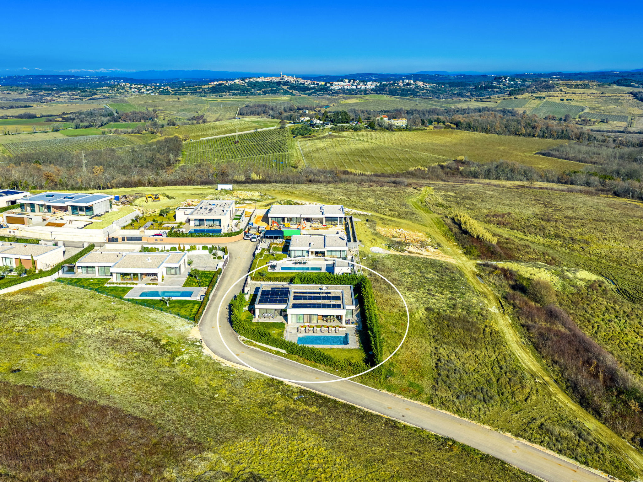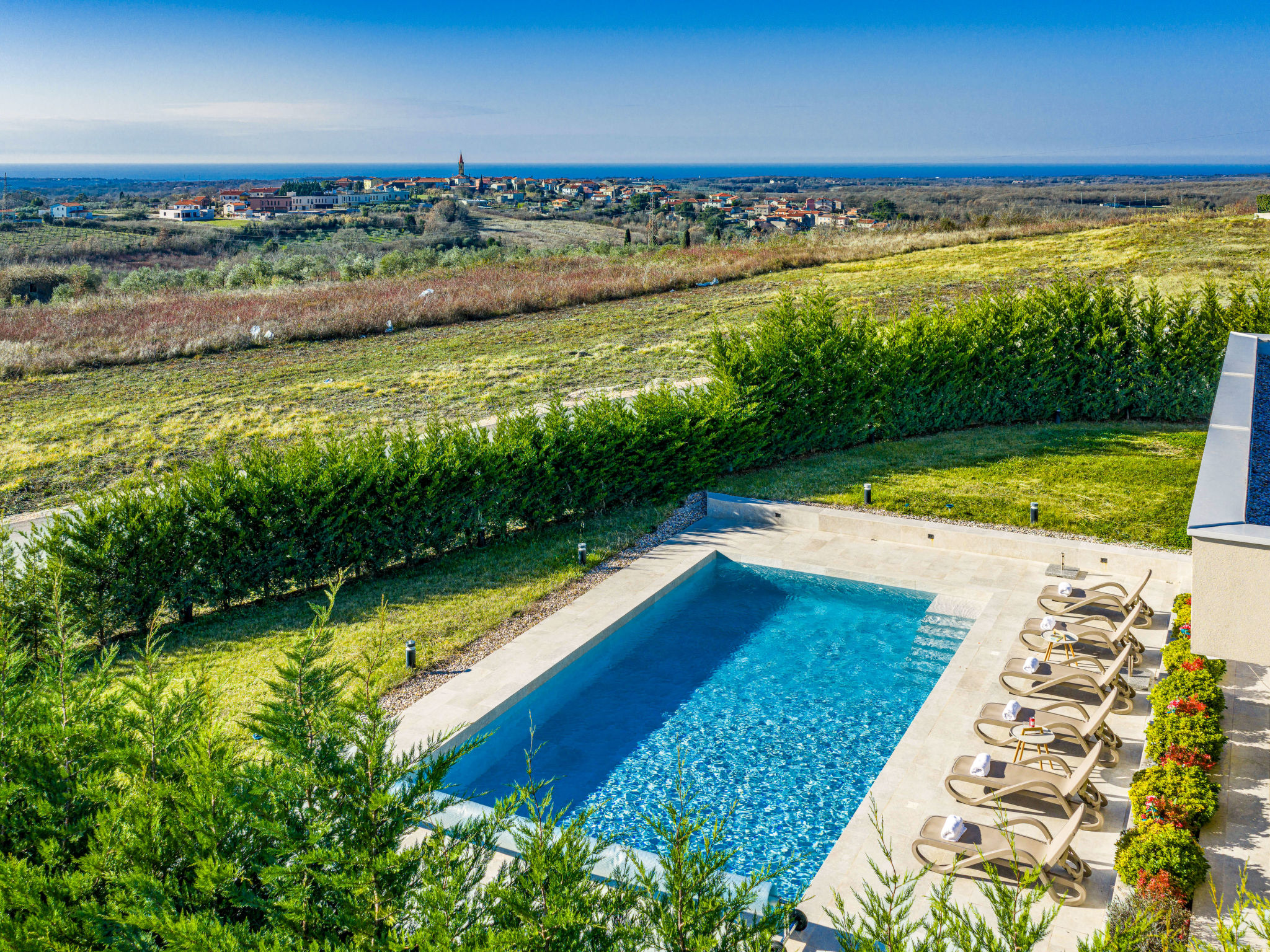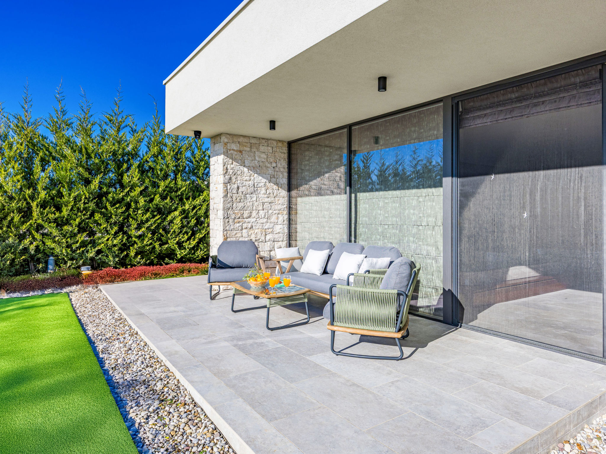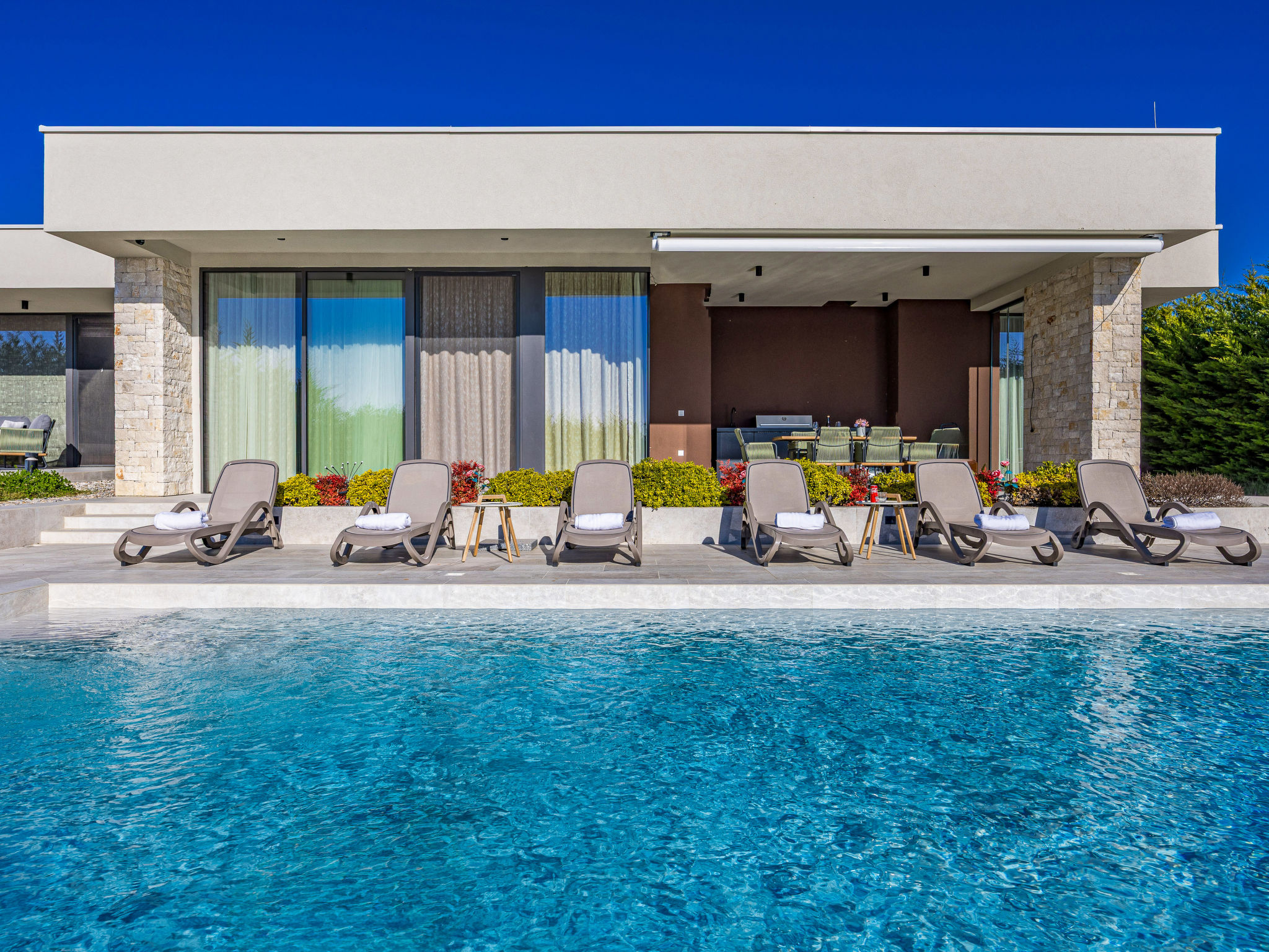 Brtonigla 6 km van Buje: Moderne, mooi villa "Miracle", bouwjaar 2025. In het gehucht Monte Marzari, 1.2 km van het centrum van Brtonigla, 10 km van het centrum van Novigrad, 13 km van het centrum van Umag, zonnige ligging, 8 km van zee. Voor alleengebruik: terrein 1.150 m2 (omheind), tuin met gazon, openluchtzwembad hoekig, verwarmd (10 x 5 m, 50 m2, 150 cm diepte, seizoensgebonden beschikbaarheid: 01.Jan. - 31.Dec.) met trap. Buitendouche. In het huis: internetaansluiting, fitnessruimte, massage (extra). Hot tub (alles incl.), infrarood sauna, air-conditioning, alarmsysteem, wasmachine, droger. Parkeerplaats (voor 2 auto's) bij het huis op het terrein. Winkel 1.2 km, supermarkt 6.4 km, restaurant 1 km, bushalte 1.4 km, kiezelstrand 8 km, duikschool 8 km. Golfterrein (18 holes) 20 km, midgetgolf 11 km. Attracties in de buurt: Aquapark 5.2 km. De eigenaar accepteert geen jeugdgroepen. Openluchtzwembad verwarmd (extra). Als er zwembad verwarming nodig is, is het noodzakelijk om dit 7 dagen van te voren aan te geven.