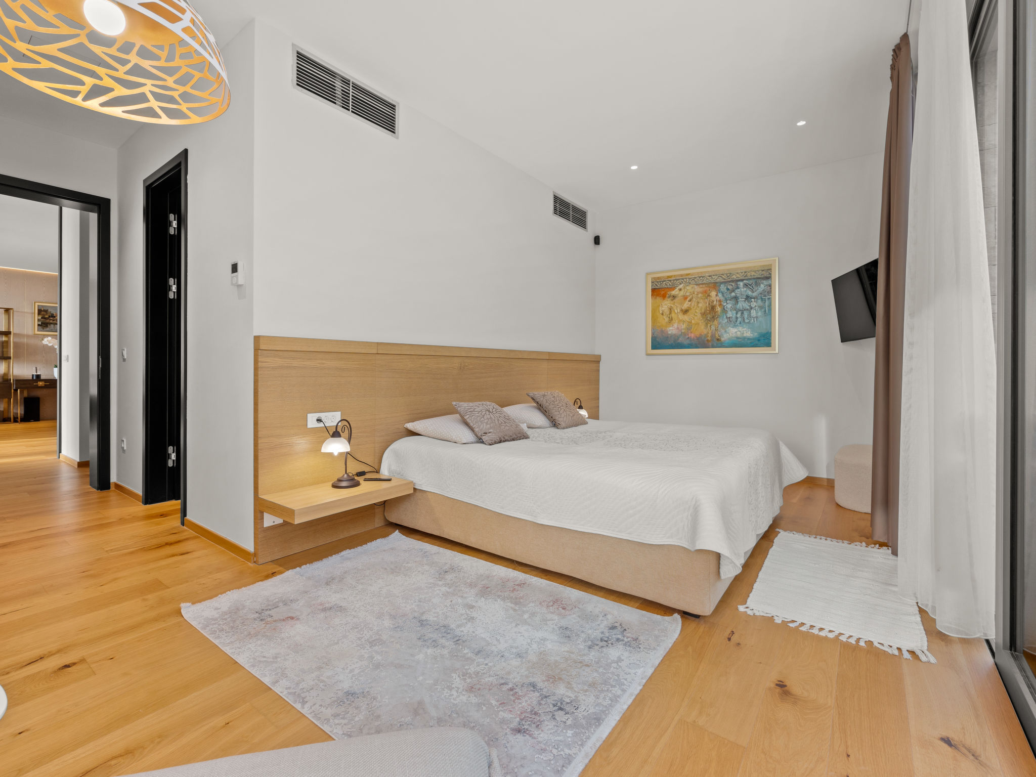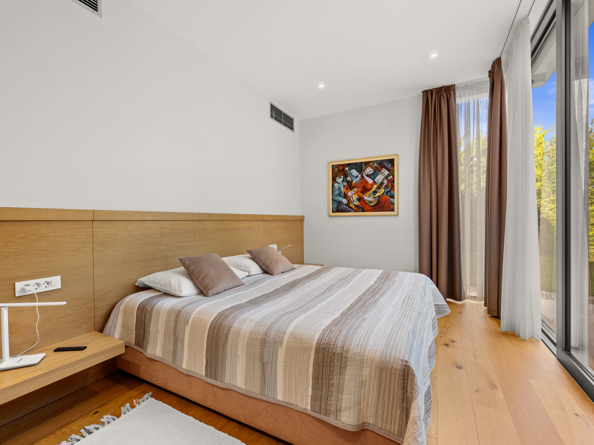 Villa 4-kamers 341 m2, op de begane grond. Ruim en licht, comfortabel en modern ingericht: woon-/eetkamer met Sat-TV en Flatscreen TV. Uitgang naar het terras, naar het zwembad. 1 kamer met 1 2-pers bed (180 cm, lengte 200 cm), 1 opklapbed (90 cm, lengte 200 cm), douche/WC en Sat-TV. Uitgang naar het terras. 1 kamer met 1 2-pers bed (180 cm, lengte 200 cm), Sat-TV. Uitgang naar het terras. 1 kamer met 1 bed (90 cm, lengte 200 cm). Open keuken (oven, afwasmachine, 4 keramische glas kookplaten, broodrooster, waterkoker, diepvriezer, elektrische koffiemachine). Douche, Sauna. Vloerverwarming, heteluchtverwarming. Terras 70 m2, overdekt. Terrasmeubelen, elektrische barbecue, ligstoelen. Panoramazicht op zee. Ter beschikking: kluis, strijkijzer, klamboe, kinderstoel, kinderbed. Internet (WiFi, gratis). 1 huisdier/hond toegestaan.