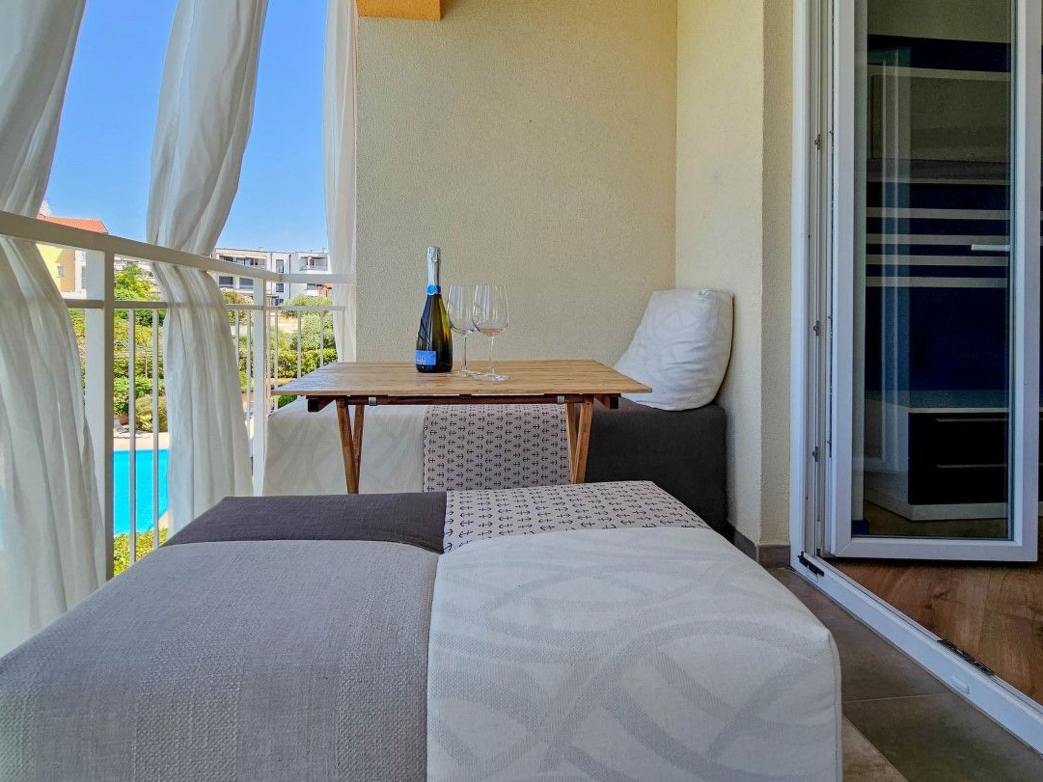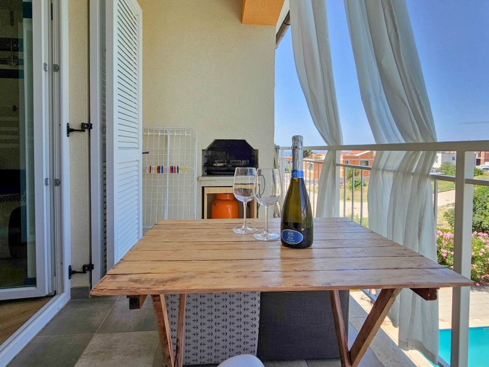 Mooi zwembad met zicht op zee in Novigrad. Er is een zwembad met zeewater en de bar biedt eten en drinken. Het eenvoudige podium biedt overdag diverse activiteiten en een programma, 's avonds optredens van diverse bands.