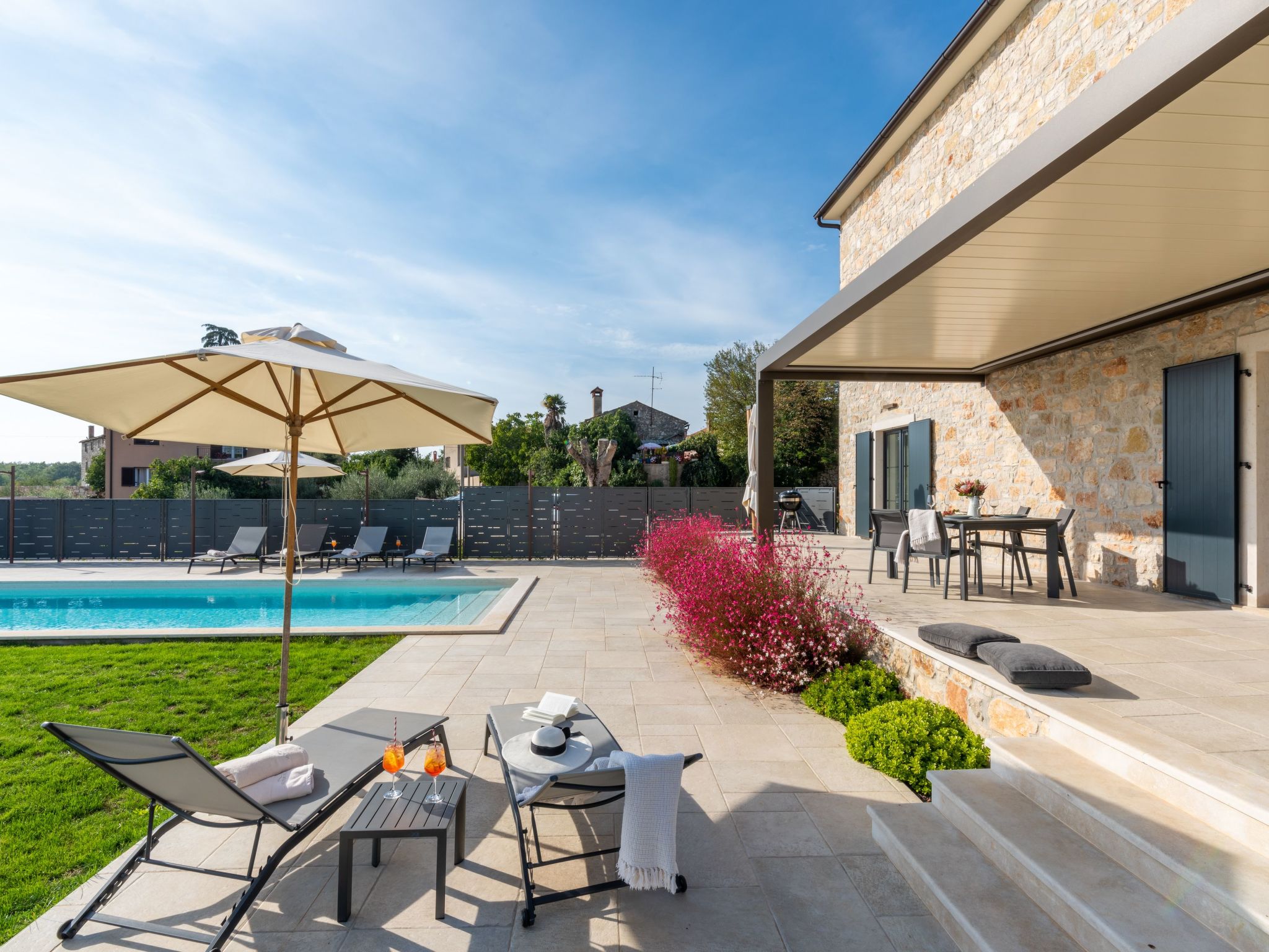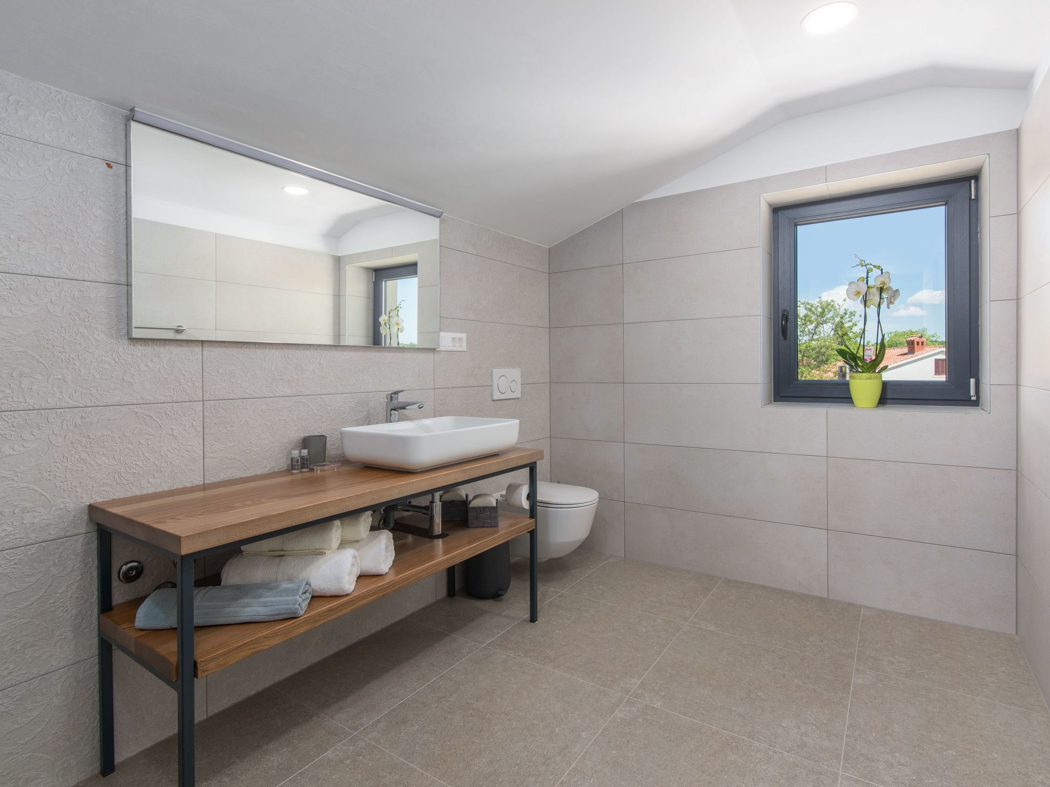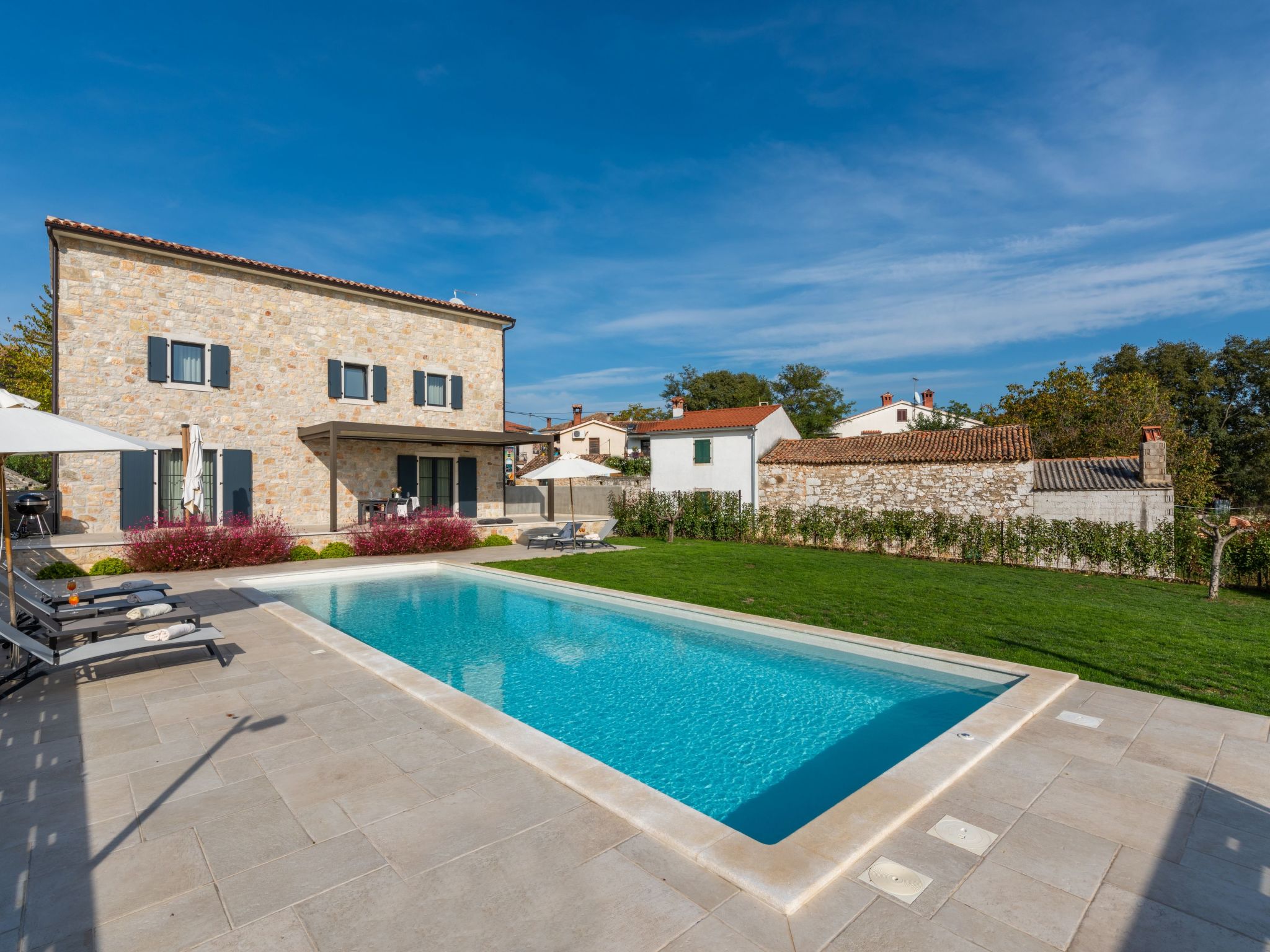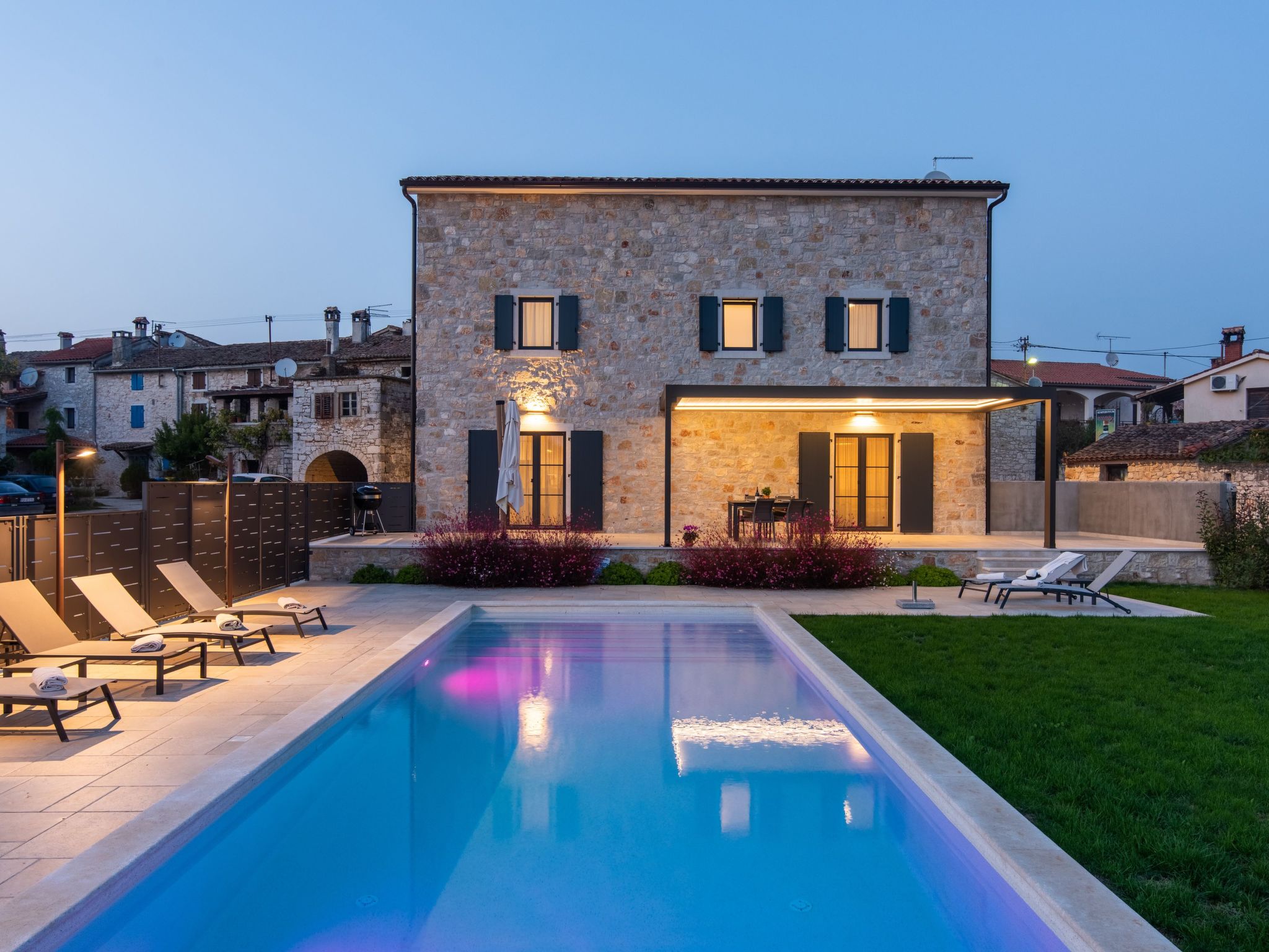 Villa Daniela Veleniki is located in a typical Istrian village, only 5 km from Porec and the sea. This stone house was completely renovated in 2021 and furnished in a modern style. On its own 800 square metre fenced plot, guests of the villa have at their disposal a saltwater pool of 48 square metres with sun loungers and parasols, barbecue and dining table with chairs for outdoor dining. Two private car parks are located outside the property, directly in front of the house. The famous restaurant-taverna is nearby and several supermarkets are about 4km away.Villa Daniela Veleniki offers space for 6 people with 240 square metres of living space and consists of three fully air-conditioned floors. In addition to the classic air conditioning units, the whole house has underfloor cooling/heating. On the ground floor there is a living area with access to the pool and garden, fully equipped kitchen with dining table, laundry room and bathroom with shower/WC. On the first floor there are two double bedrooms each with its own bathroom and on the 2nd floor (attic) there is a spacious double bedroom with its own shower/WC and sitting area. Thanks to its location, Villa Daniela Veleniki is an excellent choice for a holiday in the countryside and yet 10 minutes drive from the beach.Youth groups are not allowed.