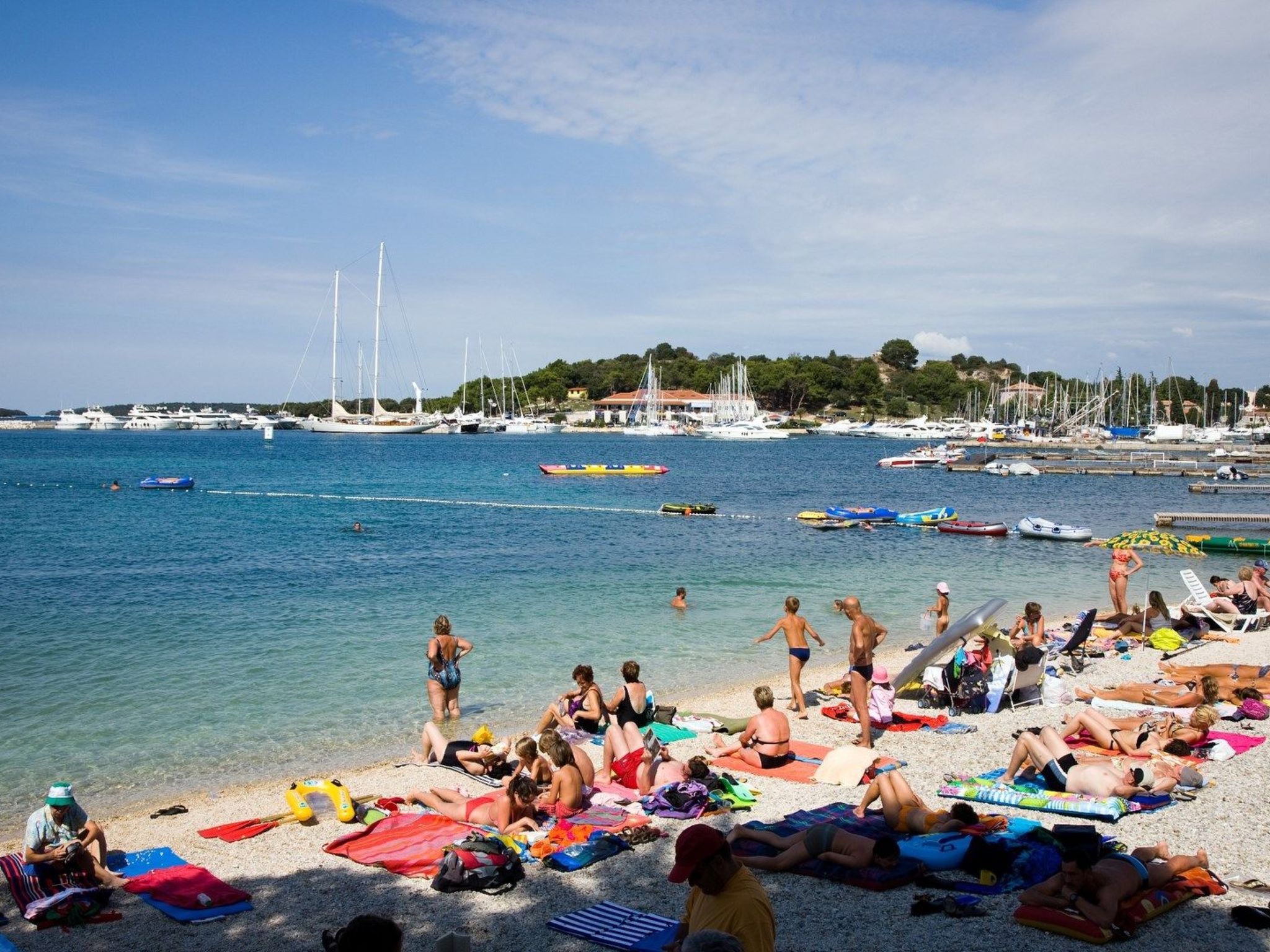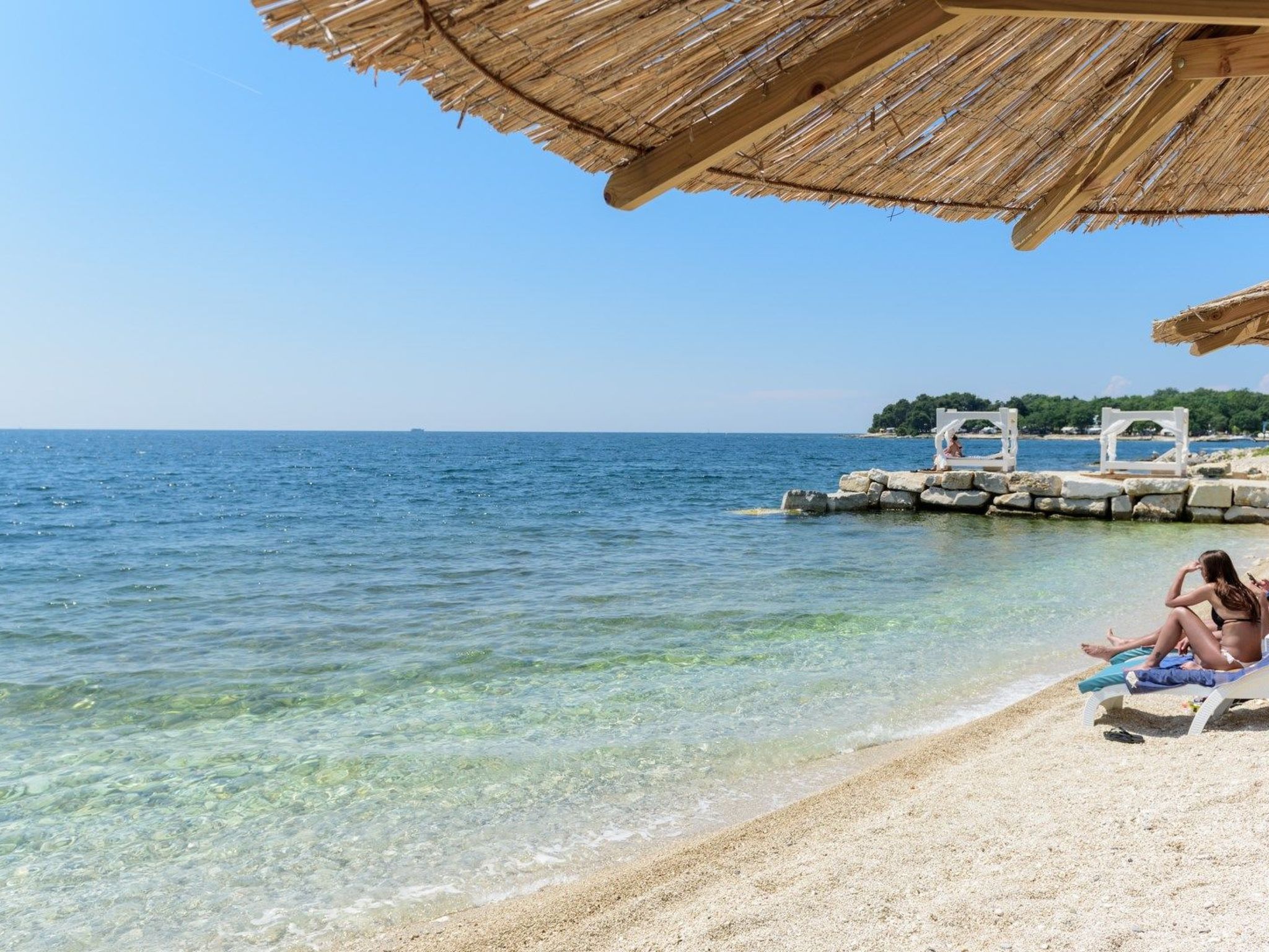 Heel leuk strandje met zon en schaduw. Het strand is schoon en goed onderhouden, deels gazon, deels met stenen. Er zijn veel ligstoelen, maar ook ruimte voor wie liever op de rotsen wil zonnen. Er zijn ook springkussens voor kinderen. Vind je vakantiehuis Porec.