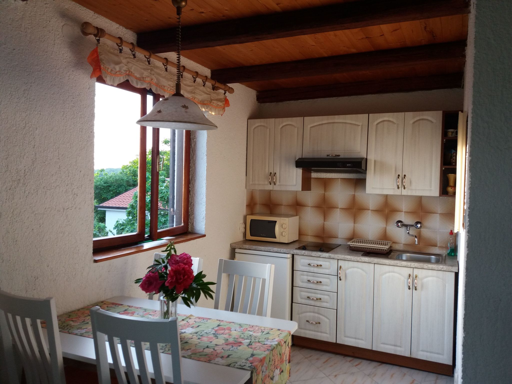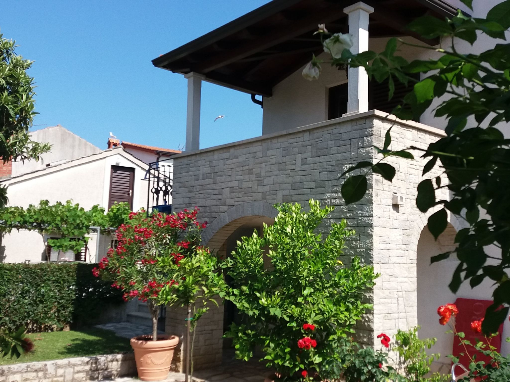 This holiday apartment for four people is in the coastal village of Funtana. The apartment is on the first floor of a typical Istrian stone house and is the right choice for guests who would like to spend a relaxing seaside holiday. The property is just 350 metres from the nearest beach and it is just 300 metres to the village centre.Holiday apartment with a balcony and a shared garden, near the beach and the centre, ideal for a relaxing seaside holiday The apartment has been completely renovated and can accommodate two to four people. The rooms on the first floor comprise 25m² of living space. The living room-kitchen consists of a sitting area with a sofa and a flatscreen TV with a satellite receiver. Next to the sofa there is the dining space with a table and four chairs. There is an adjoining kitchen, equipped with an electric hob, fridge, coffee machine, microwave and coffee machine. There is also a bathroom with a shower. A curved wooden stairway leads up to the second floor of 35m², which has a 25m² air conditioned bedroom with a double bed (160 x 200cm) and an 8m² gallery with two single beds for children (90 x 200cm), as well as a small 2m² balcony with a view of the sea. The site is fenced and therefore also suitable for children. The shared, well-tended garden is for the use of all guests. There is plenty of space to play or simply to relax in the shade or in the sun. There is a barbecue, so you can grill and sit together. The apartment has a 10m² balcony, which is on the first floor and is furnished with a table and four chairs. There are also parking spaces on site. It is only 350 metres to the nearest beach (pebble, stone and concrete). Within a kilometre you can find a variety of beaches, including ones suitable for children. It is about 300 metres into the centre with several restaurants and shops. You can enjoy a range of sports and entertainment, including water sports, tennis and well-signposted cycle paths. You can go on a wide range of trips, for example from the nearby Vrsar, where Casanova stopped twice, via Porec, with its magnificent mosaics in the Euphrasius basilica, to Grožnjan, the artists’ town, or Rovinj, the so-calle “little Venice”, or Pula with its imposing Roman amphitheatre. Basic information - Pets allowed: none - Type of property: holiday apartment - is located in: Housing estate - type of apartment: Maisonette - type of building: End-of-terrace house - Floor on which the object can be found: 1. floor - Total number of floors in the building above the ground floor: 2 - Year of the last complete renovation : 2020 - Owner lives on the property - Number of bedrooms: 1 - Number of bathrooms: 1 Top features - WiFi - air conditioning: In part - heating: no - balcony - garden: For communal use - completely enclosed (by wall, fence or hedge) - Total of private car parking spaces: 1 - ? of which garage spaces: None - ? of which carport spaces: None - ? of which private outdoor parking spaces: 1 - distance to free communal parking spaces: 0 m Sleeping bedroom 2 - 2x double bed (from 1.51 m to 1.79 m width) in the living area - 2x single bed Bathroom bathroom 2 - shower - daylight Sanitary facilities at the property - shower - 2x basin - toilet - hair dryer - daylight Cooking/Living - coffee machine: coffee machine - fridge/freezer: freezing compartment, fridge - stove: stove - microwave - electric kettle - dishtowels - number of dining tables: 2 - number of seats: 6 - number of living rooms: 1 Entertainment - TV: satellite TV For children - playground in the garden Utility - washing machine: For communal use in the building - clothes drying rack - first aid kit - safe Sustainability - Waste recycling - glass recycling available - paper recycling available - plastic recycling available - insulated roof Outside area - loggia - roof terrace - grill/barbecue: grill/barbecue Surroundings - view: sea, garden, forrest, lawn - Nearest town centre: 300 m - Grocery store: 200 m - going out: 300 m - restaurant: 200 m - train station: 30,0 km - airport: 50,0 km - distance public transport: 350 m - beach: 350 m - shingle beach: 350 m - concrete beach: 350 m - water (sea, lake, etc.): 200 m - sea: 200 m - water sports: 350 m - moorage: 500 m - boat hire - angling spot: 300 m - playground: 200 m - bicycle hire: 100 m - hiking trail: 200 m.
