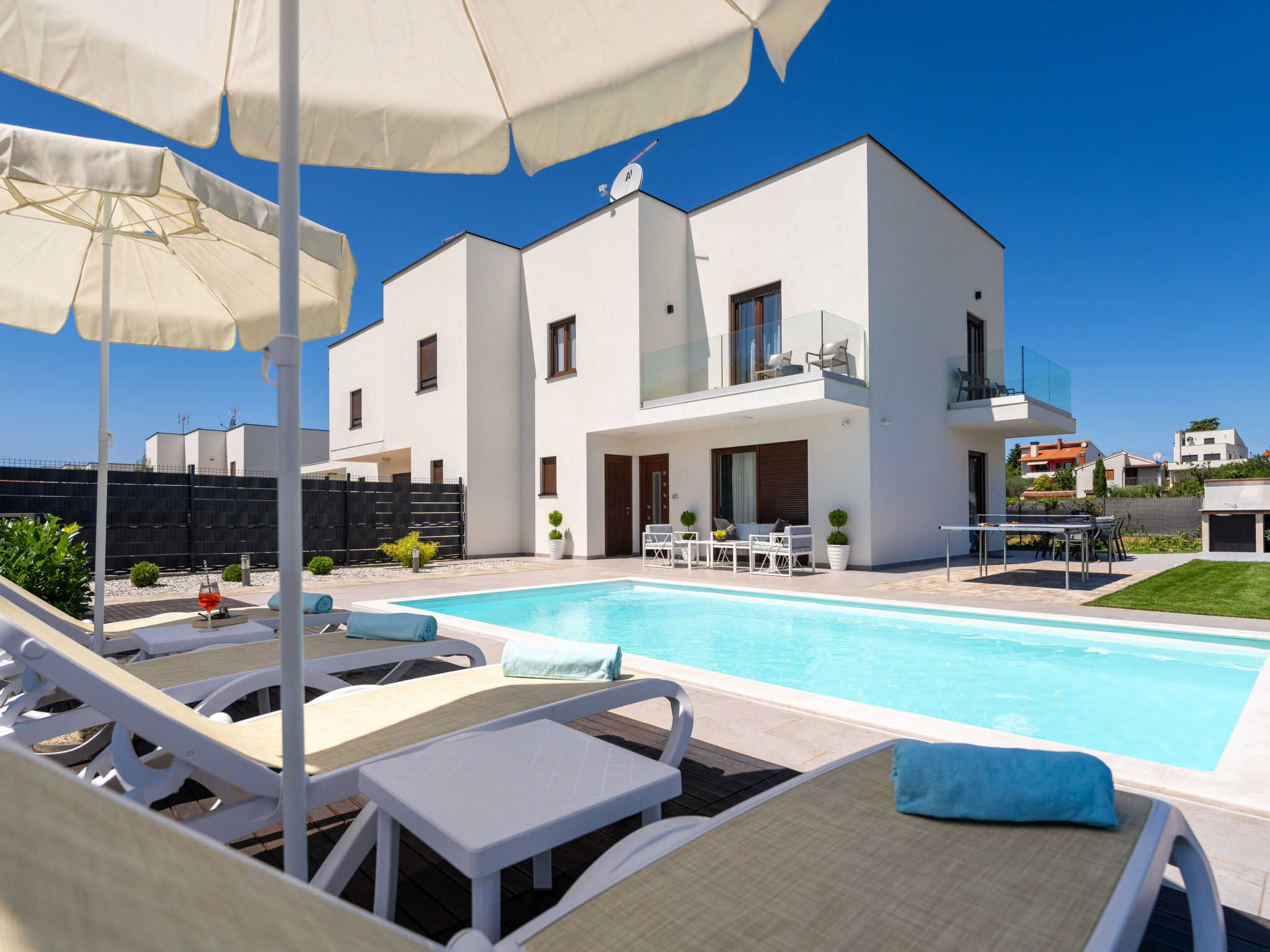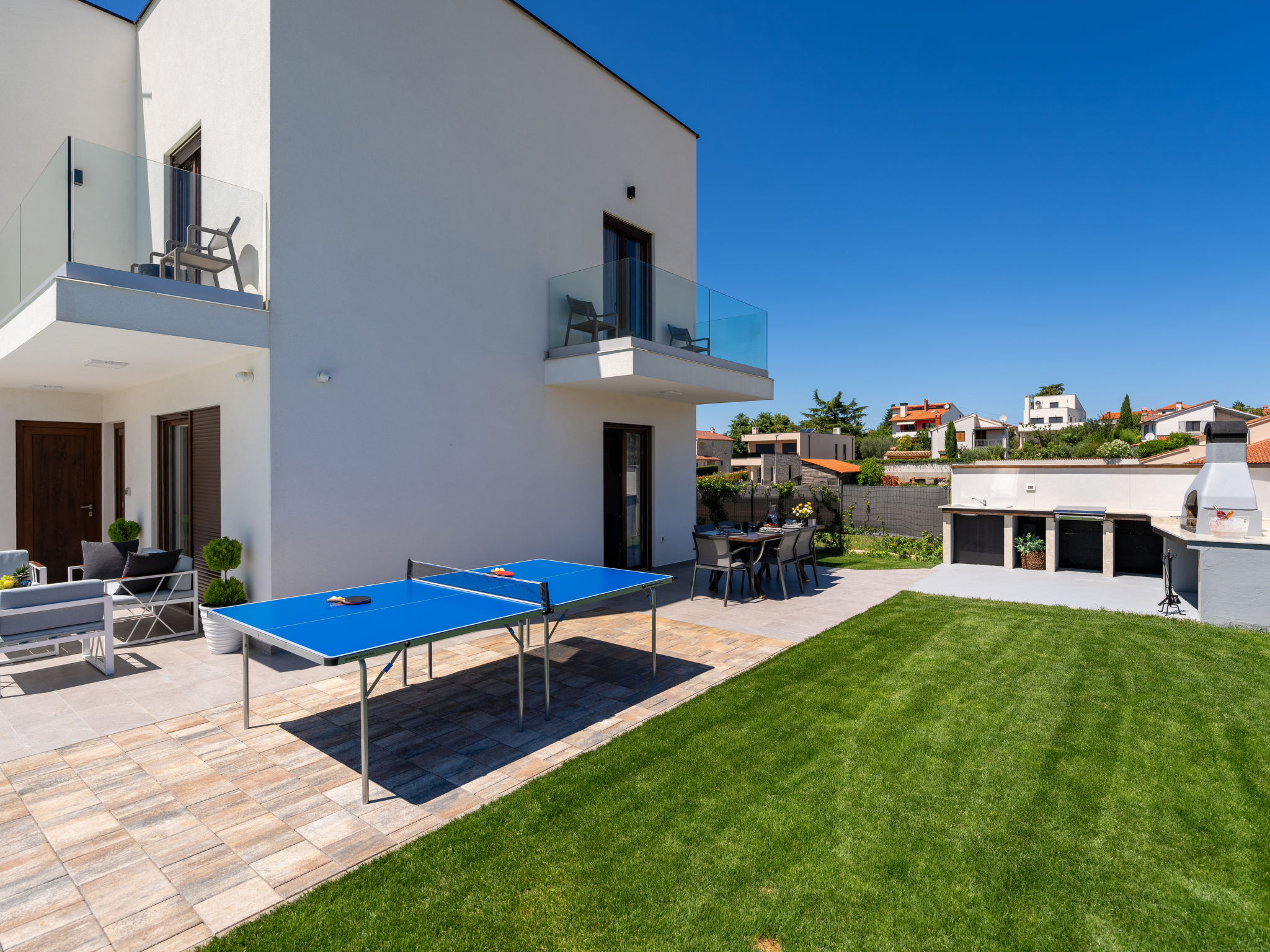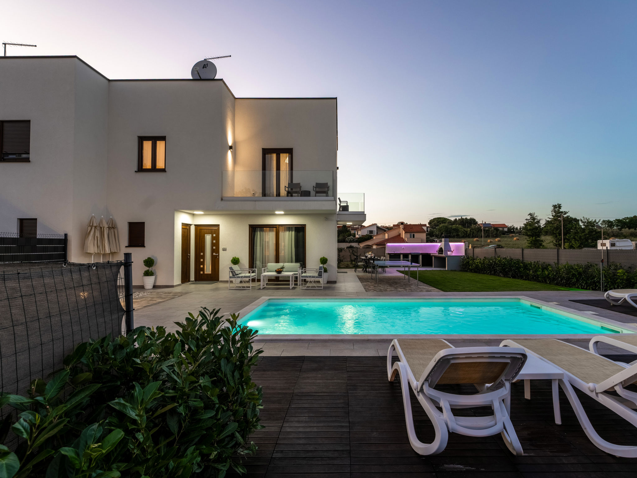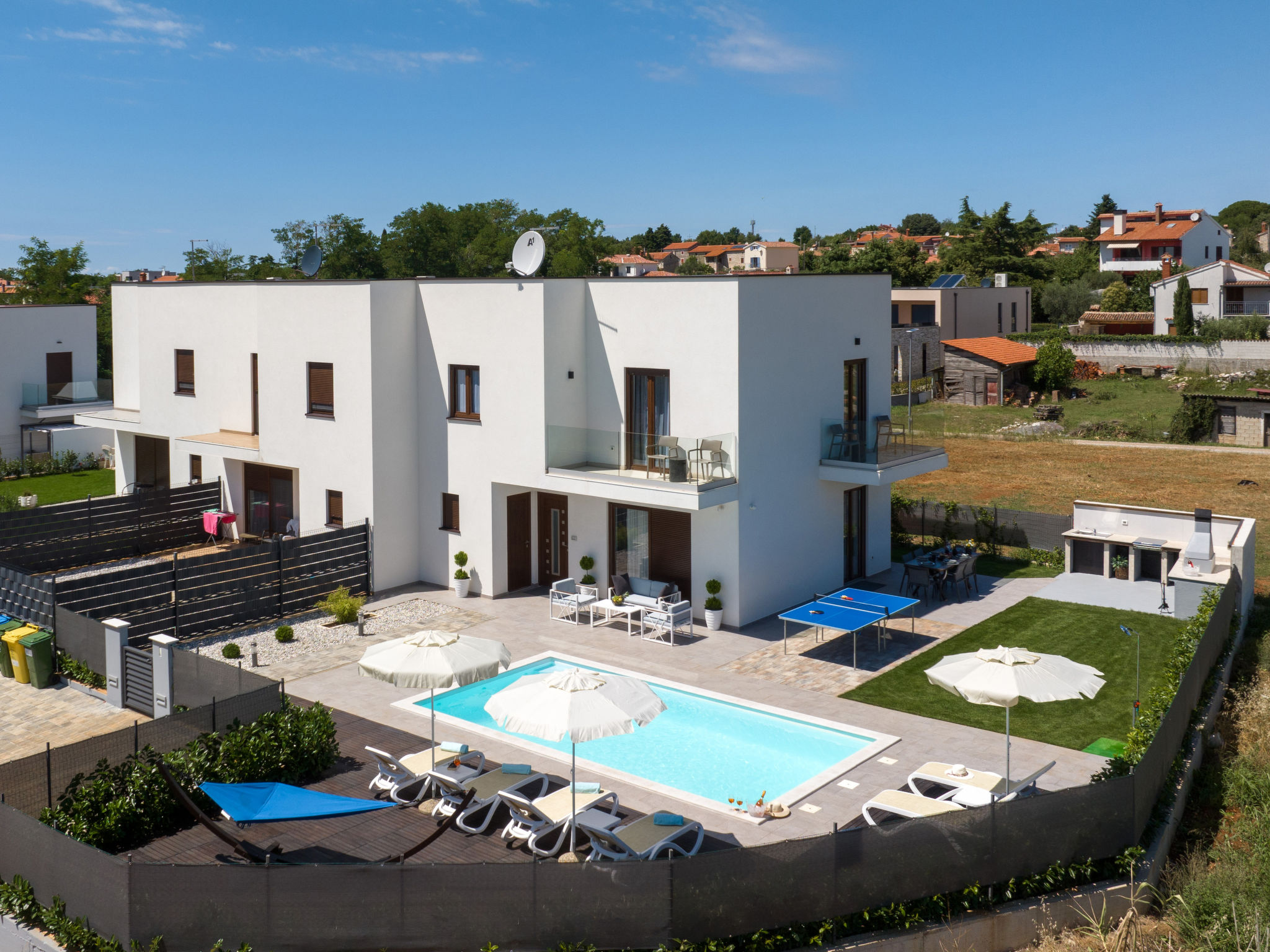 Mooi rijtjeshuis "Aria Blue", van 2 verdiepingen. In het gehucht Krancici, 500 m van het centrum van Kaštelir, 15 km van het centrum van Porec, zonnige ligging, 10 km van zee. Voor alleengebruik: terrein 275 m2 (omheind), openluchtzwembad hoekig (7 x 4 m, 145 cm diepte, seizoensgebonden beschikbaarheid: 01.Mrt. - 10.Dec.) met trap. Buitendouche, tafeltennis, terras (10 m2), tuinmeubelen, barbecue. In het huis: internetaansluiting, wasmachine. Parkeerplaats (voor 2 auto's) bij het huis. Winkel 500 m, restaurant 2 km, bushalte 6.1 km, kiezelstrand 10 km, rotsstrand 10 km. Wandelroutes 100 m vanaf het huis, fietspad 150 m. Geschikt voor families. De eigenaar accepteert geen jeugdgroepen.