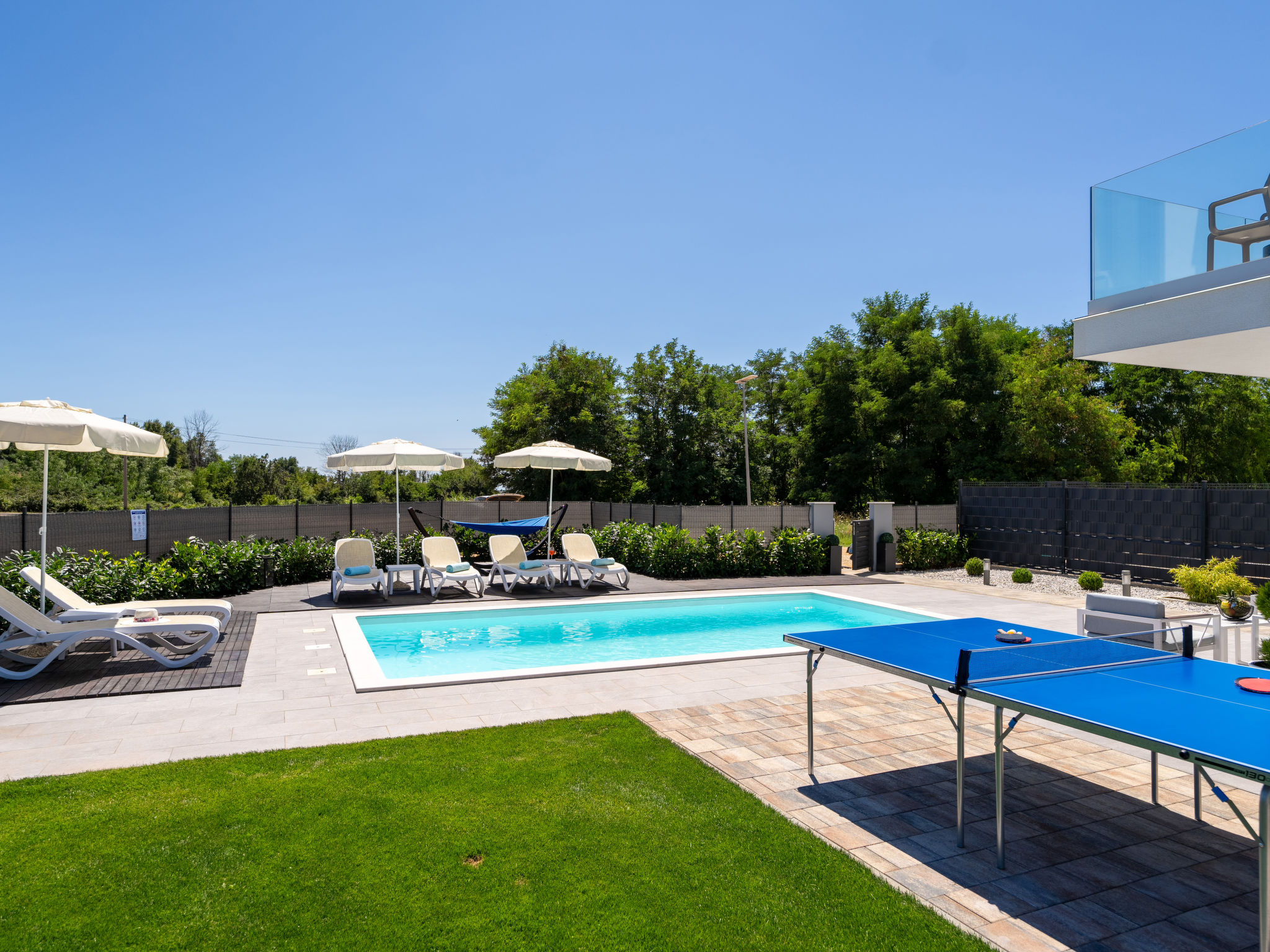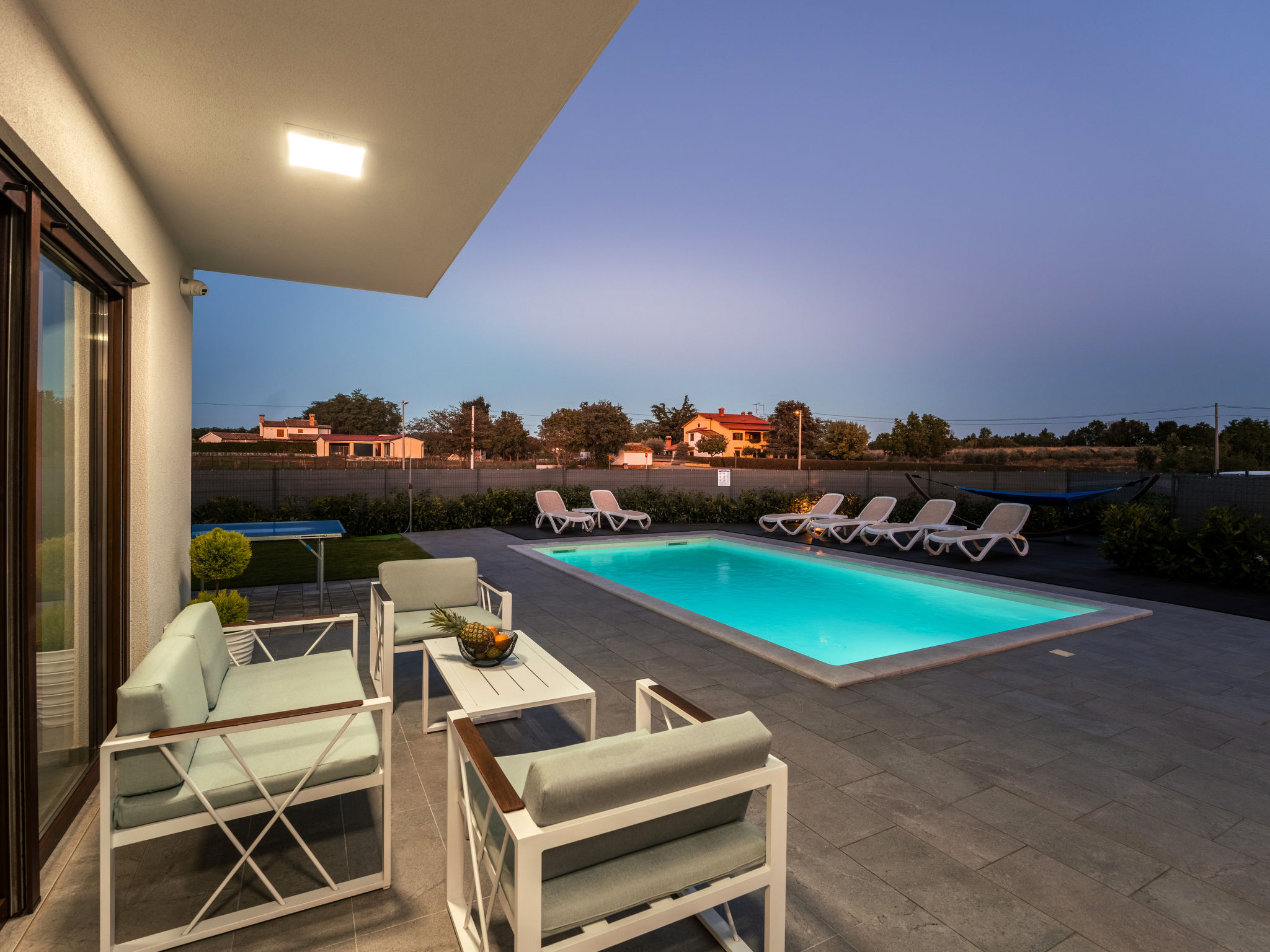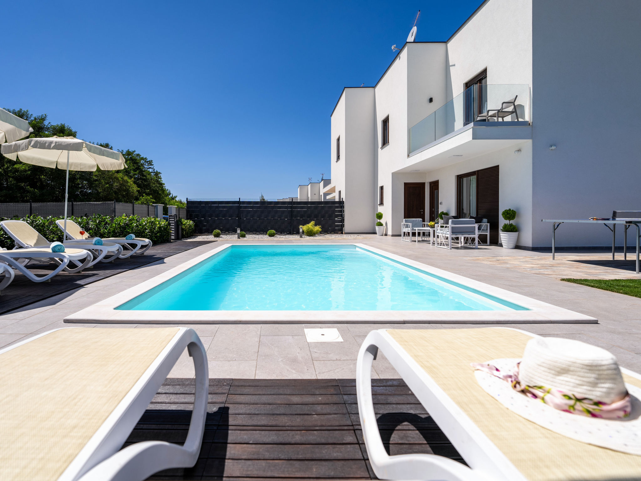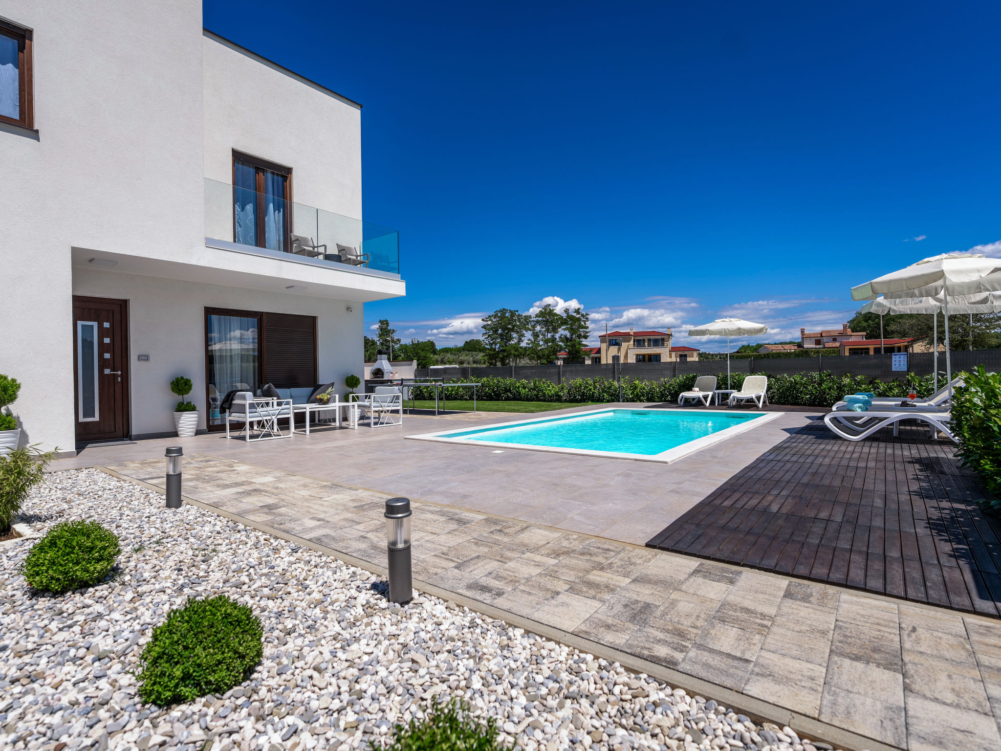 Mooi rijtjeshuis "Aria Blue", van 2 verdiepingen. In het gehucht Krancici, 500 m van het centrum van Kaštelir, 15 km van het centrum van Porec, zonnige ligging, 10 km van zee. Voor alleengebruik: terrein 275 m2 (omheind), openluchtzwembad hoekig (7 x 4 m, 145 cm diepte, seizoensgebonden beschikbaarheid: 01.Mrt. - 10.Dec.) met trap. Buitendouche, tafeltennis, terras (10 m2), tuinmeubelen, barbecue. In het huis: internetaansluiting, wasmachine. Parkeerplaats (voor 2 auto's) bij het huis. Winkel 500 m, restaurant 2 km, bushalte 6.1 km, kiezelstrand 10 km, rotsstrand 10 km. Wandelroutes 100 m vanaf het huis, fietspad 150 m. Geschikt voor families. De eigenaar accepteert geen jeugdgroepen.