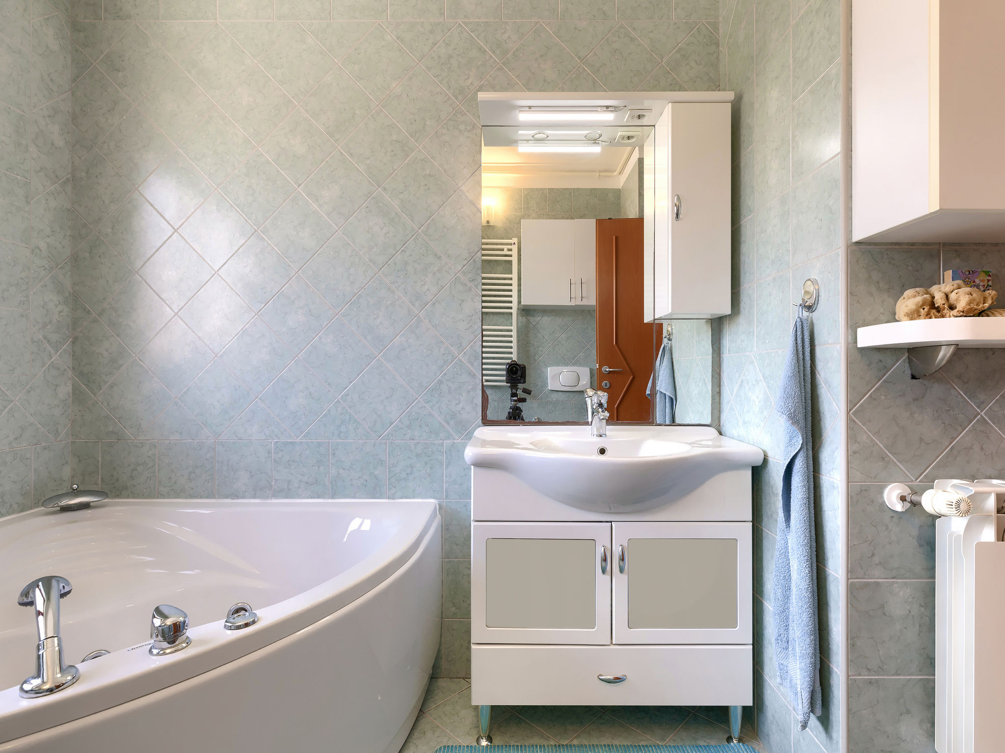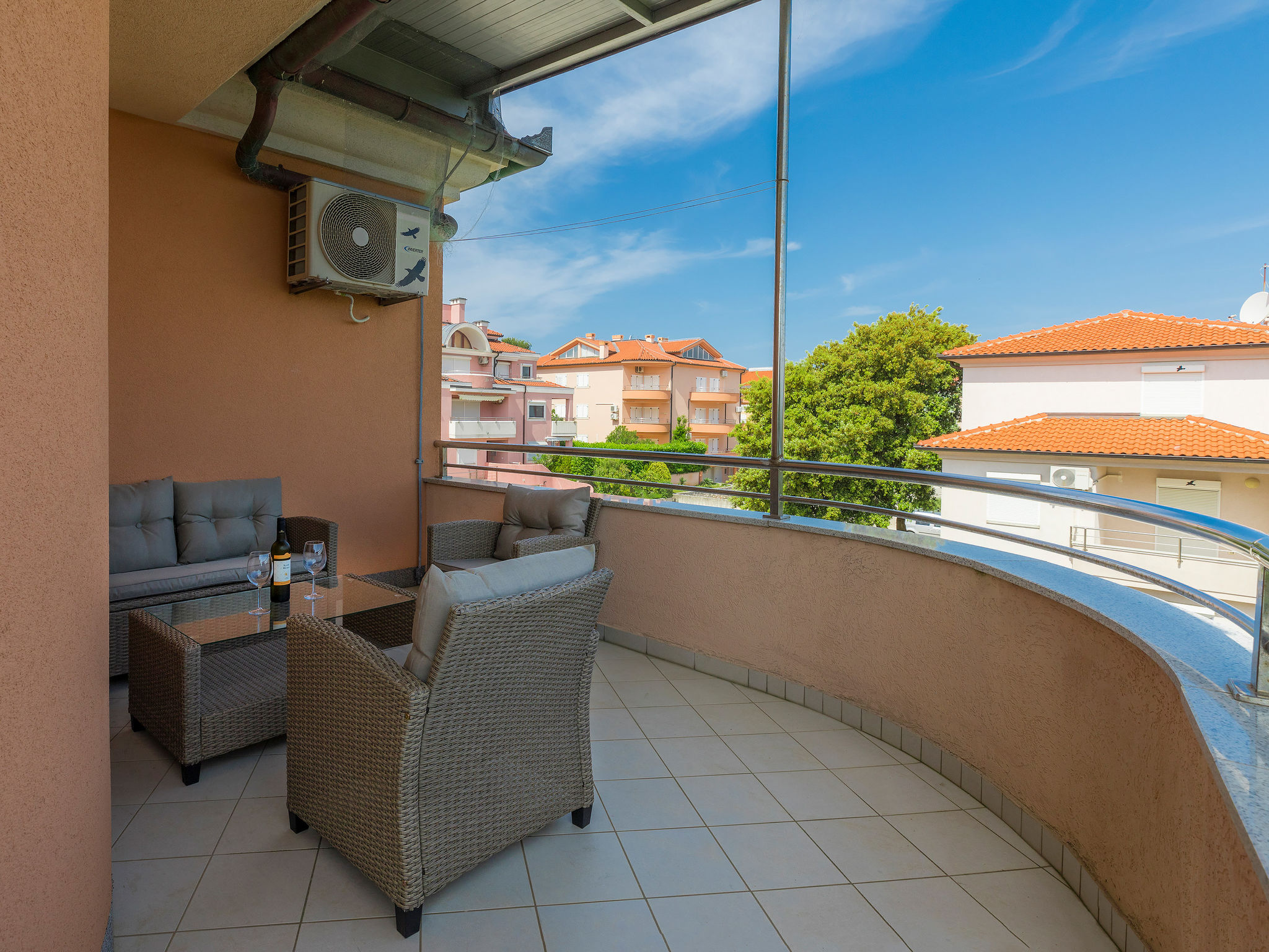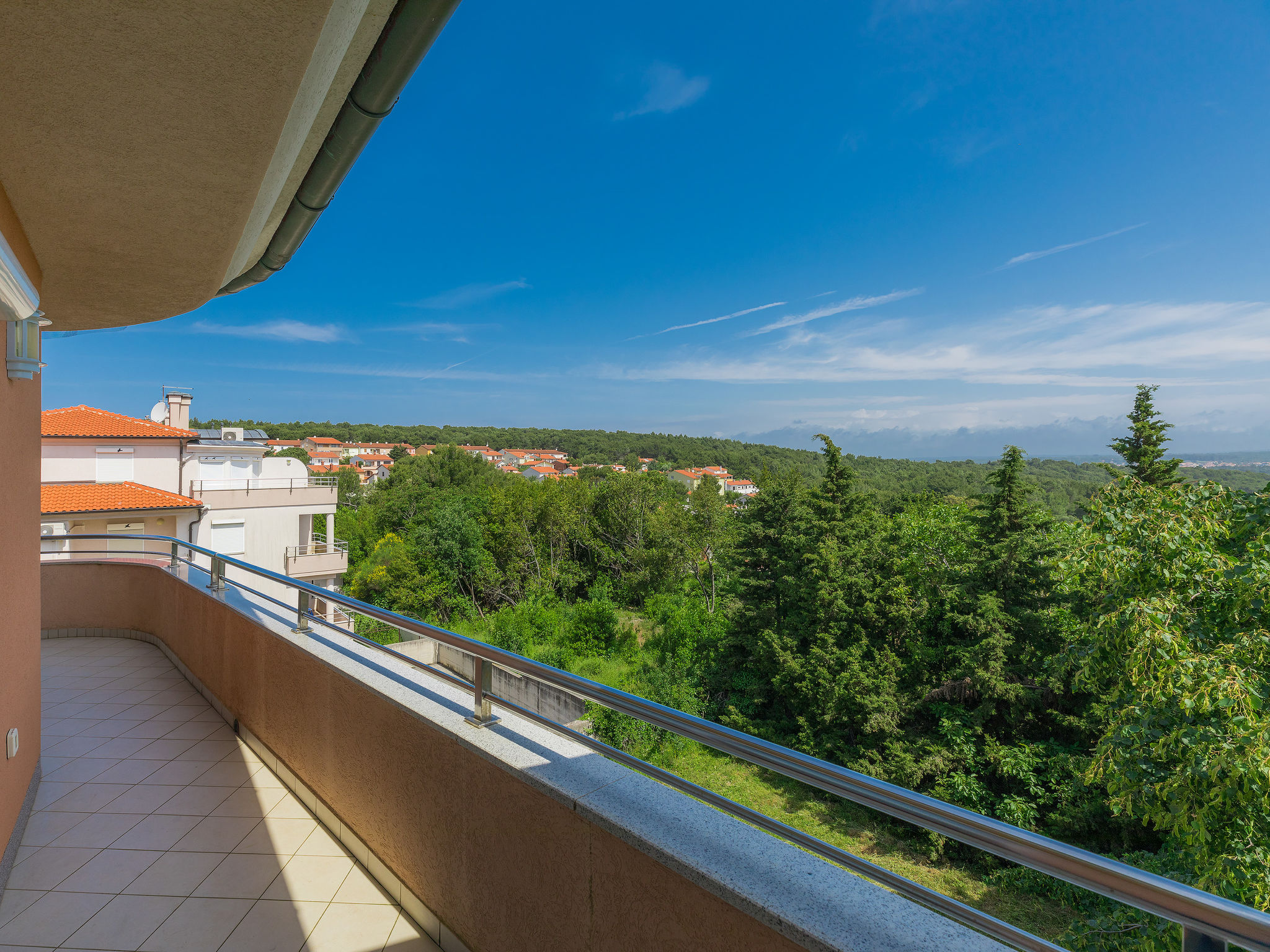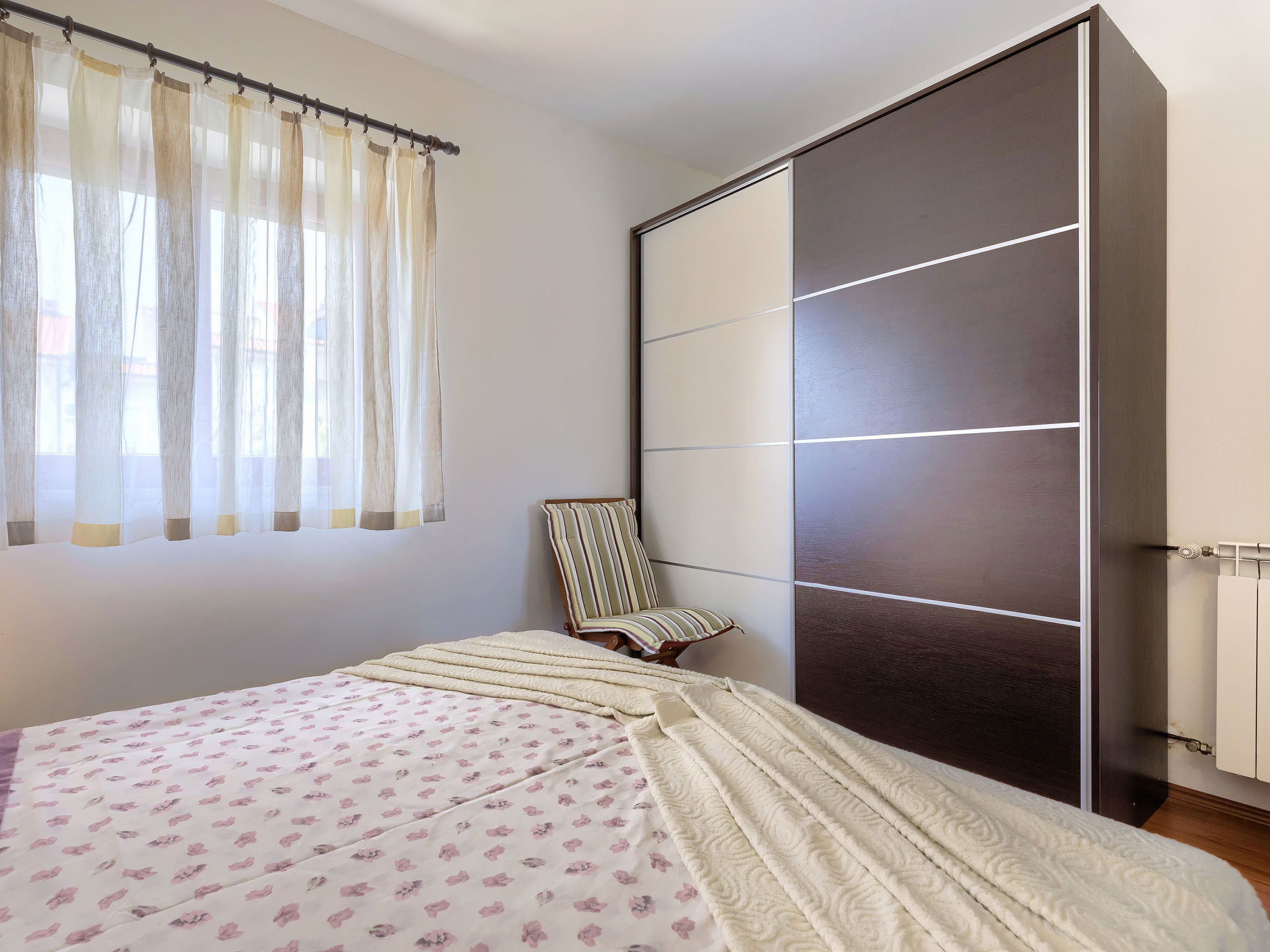 Appartement 3-kamers 70 m2 op de 2e verdieping. Woon-/eetkamer 35 m2 met 1 2-pers divanbed (140 cm, lengte 200 cm), Sat-TV (Flatscreen TV), air-conditioning. Uitgang naar het terras. 1 kamer met 1 2-pers bed (160 cm, lengte 200 cm). 1 kamer met 1 2-pers bed (180 cm, lengte 200 cm). Open keuken (1 kookplaat, oven, afwasmachine, 3 kookpitten (vlammen), waterkoker, magnetron, diepvriezer, elektrische koffiemachine). Uitgang naar de veranda. Bad/bidet/WC, hydro massage bad. Terras 15 m2, overdekt. Terrasmeubelen, barbecue. Beperkt uitzicht op zee. Ter beschikking: wasmachine, haardroger. Internet (WiFi, gratis). Parkeerplaats (2 Auto's). Maximaal 1 huisdier/hond toegestaan.