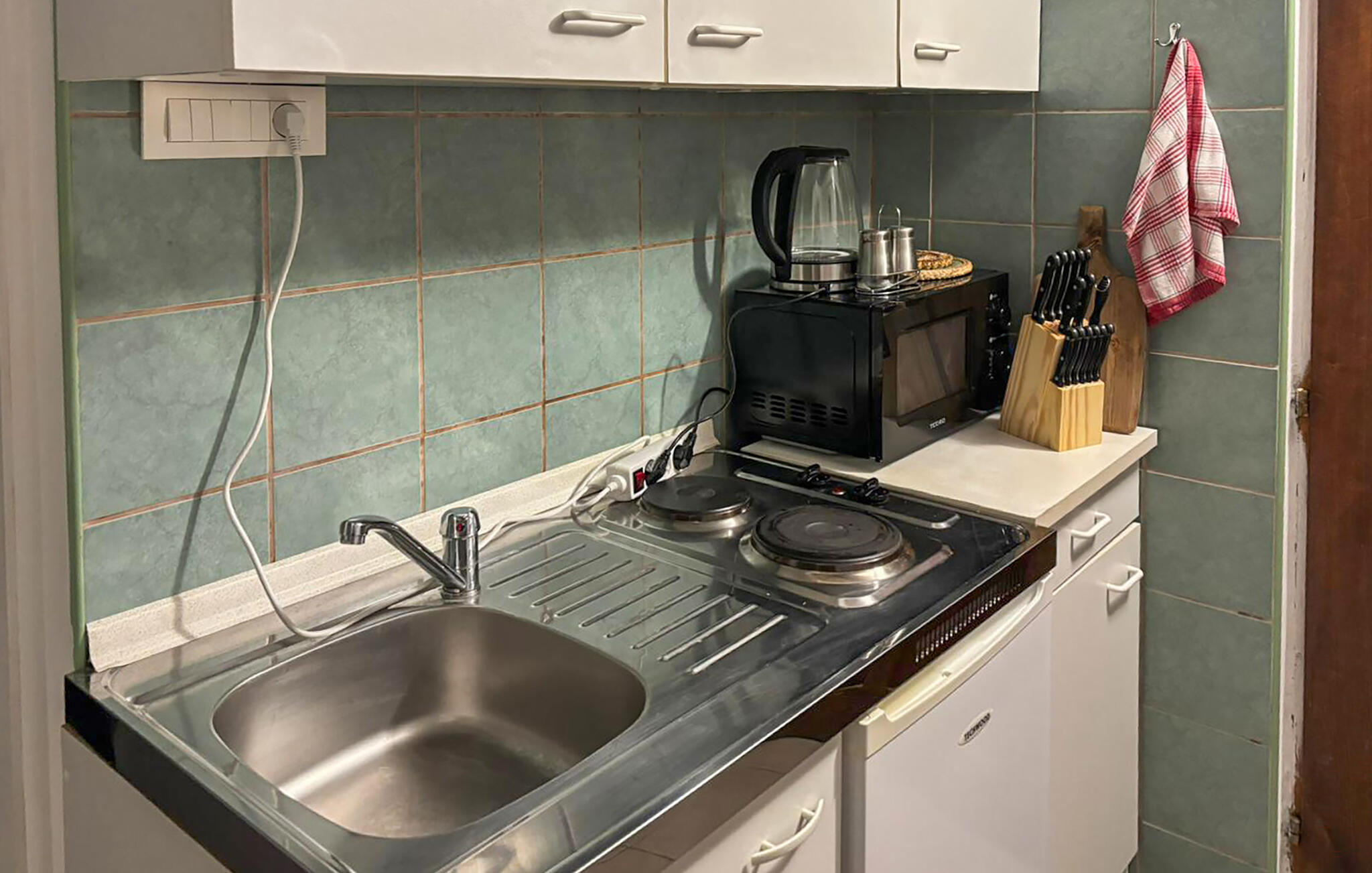 Keuken heeft warm/koud waterElektrisch fornuis met ovenKoelkastVriezerKoffiezetapparaatMagnetronStofzuiger1 TVToilet: warm en koud water