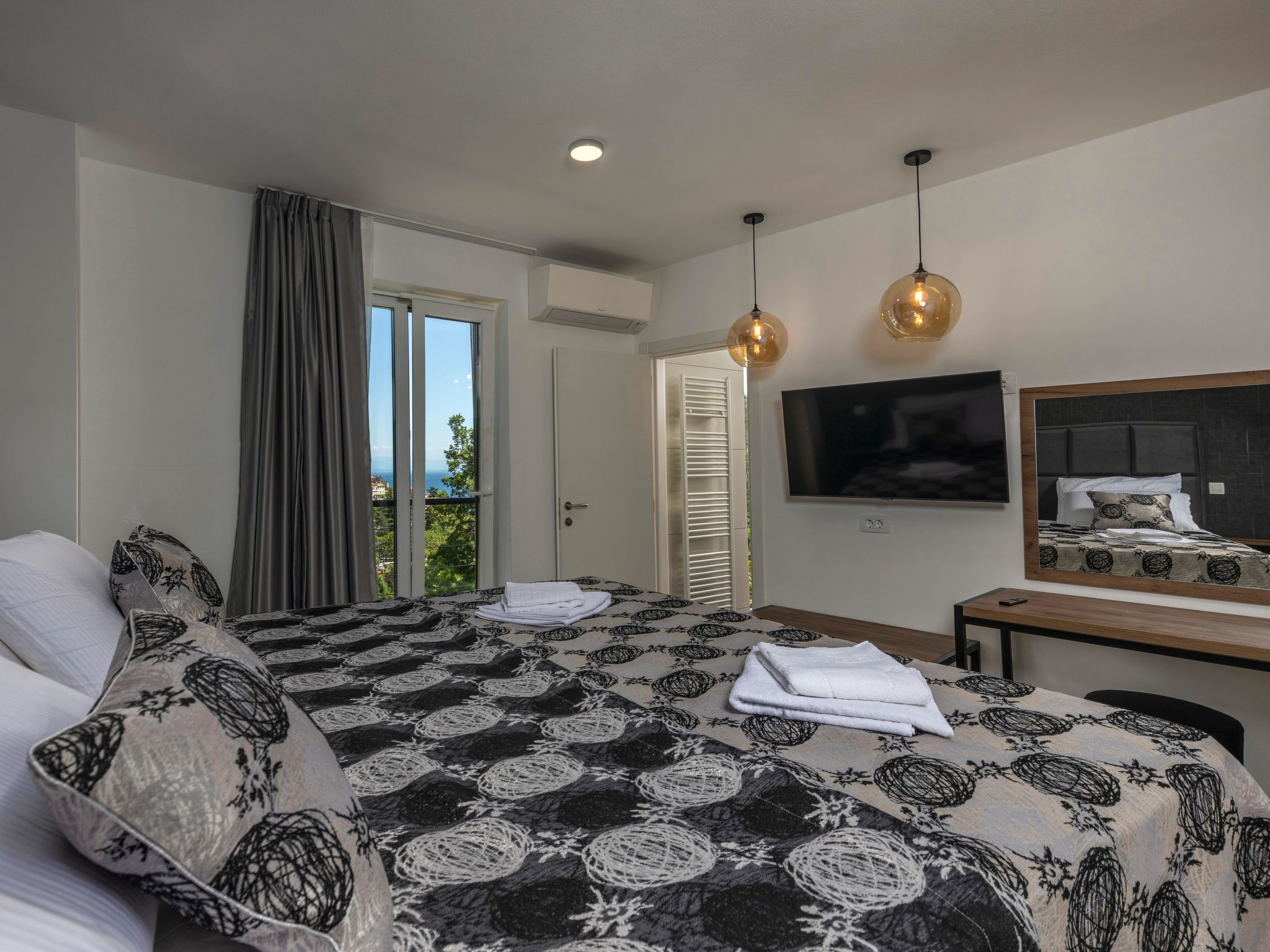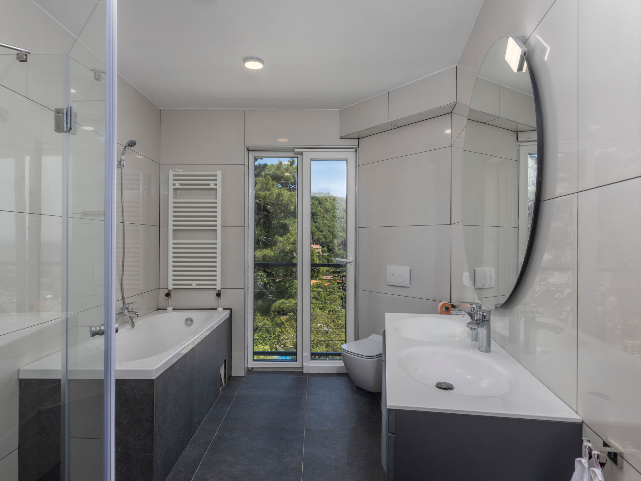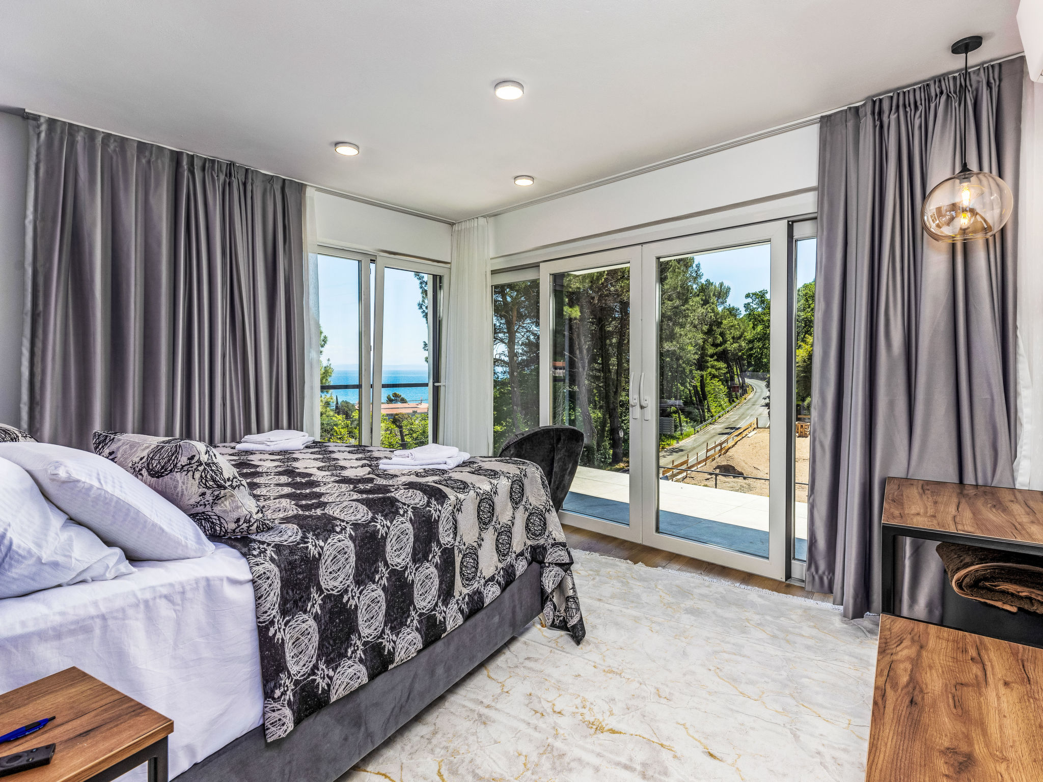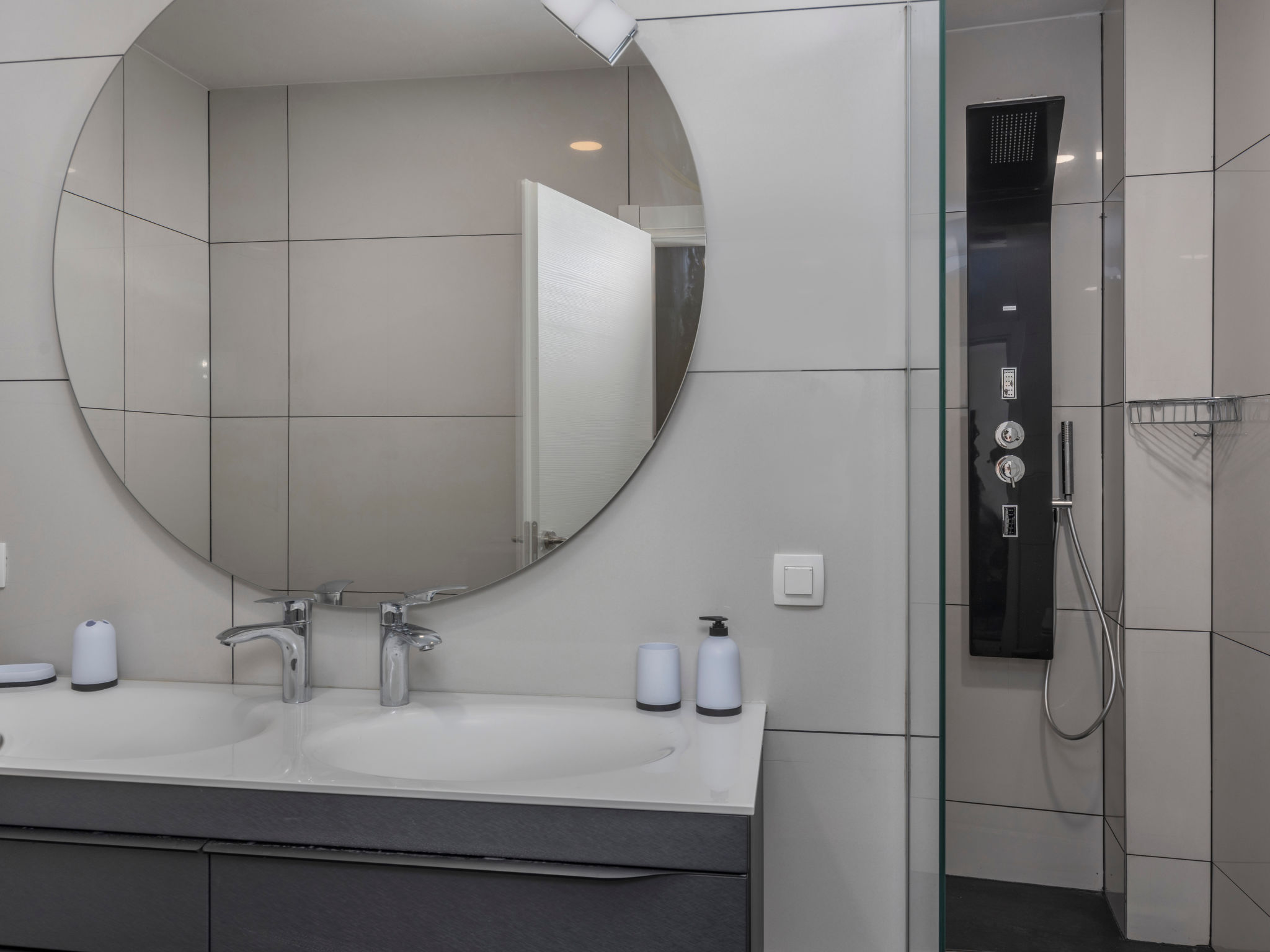 Villa 7-kamers 430 m2 op 3 verdiepingen. Woon-/eetkamer 68 m2 met Kabel-TV en air-conditioning. Uitgang naar het terras. 1 kamer met 1 2-pers bed (200 cm, lengte 210 cm), douche/WC, dubbele wastafels en TV (Flatscreen TV), air-conditioning. Open keuken (oven, afwasmachine, 4 keramische glas kookplaten, waterkoker, magnetron, diepvriezer, elektrische koffiemachine). Aparte WC. Souterrain: 1 kamer met 1 2-pers bed (200 cm, lengte 210 cm), douche/WC, dubbele wastafels en TV (Flatscreen TV), air-conditioning. Douche/WC. Bovenverdieping: 3 kamers, elke kamer heeft 1 2-pers bed (200 cm, lengte 210 cm), douche/WC, dubbele wastafels en TV (Flatscreen TV), air-conditioning. 1 kamer met 1 2-pers bed (200 cm, lengte 210 cm), douche/WC, dubbele wastafels en TV (Flatscreen TV), air-conditioning. Uitgang naar het balkon. Verwarming, vloerverwarming. Balkon 8 m2, terras 60 m2 gedeeltelijk overdekt. Terrasmeubelen, barbecue elektrische barbecue, ligstoelen. Beperkt uitzicht op zee. Ter beschikking: kluis, strijkijzer, kinderstoel, kinderbed, haardroger. Internet (Internet (WiFi), gratis).